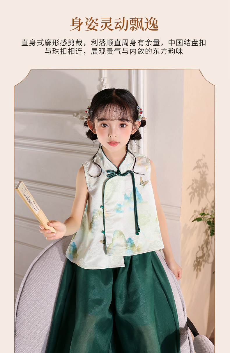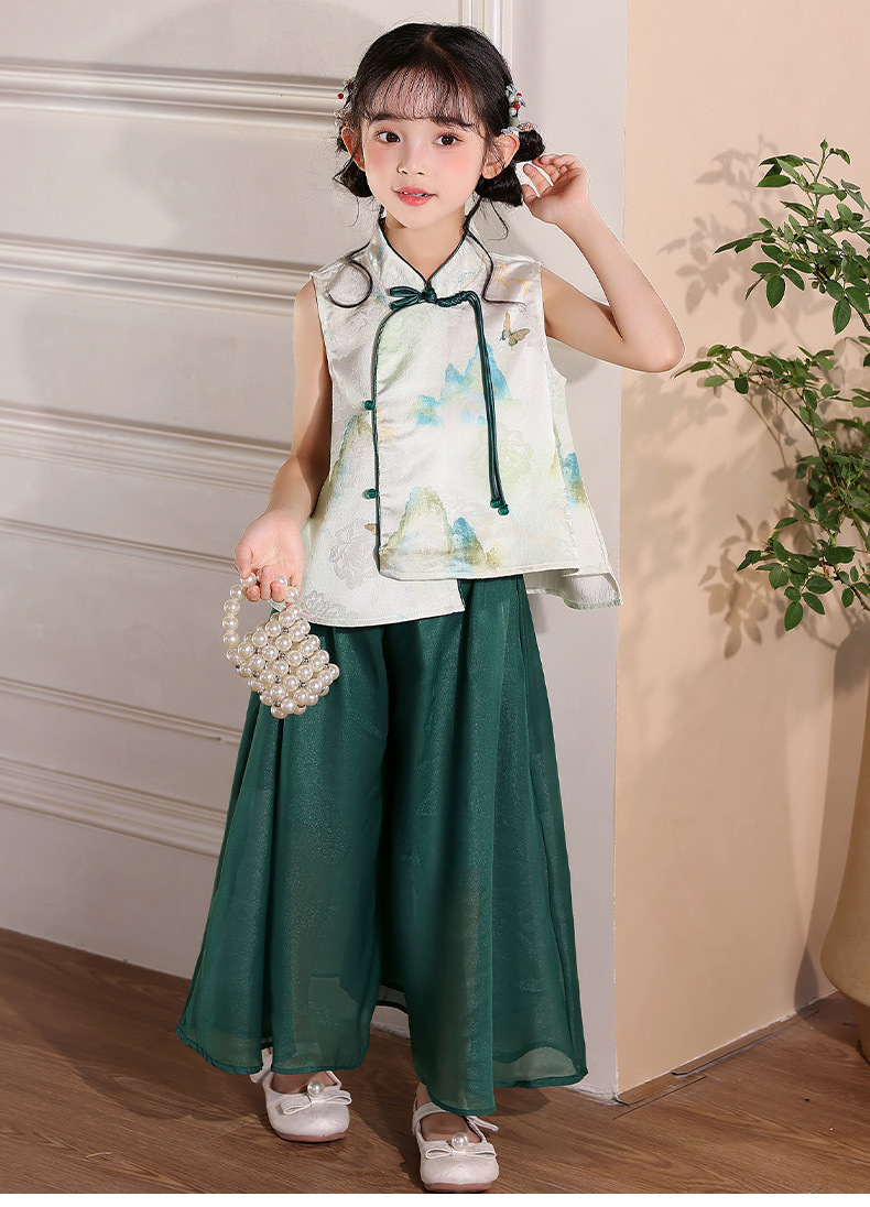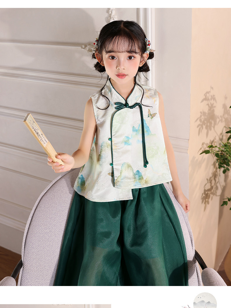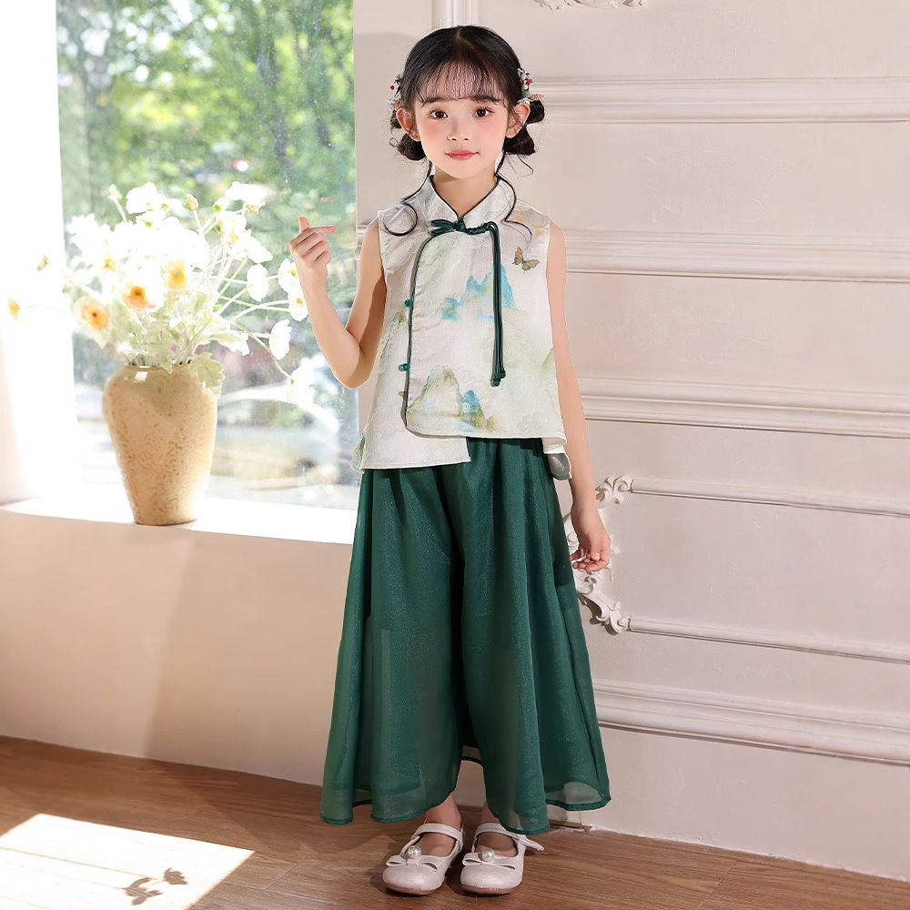 어린이 새로운 중국 스타일 조끼 Hanfu 정장 2025 여름 새로운 스타일 소녀 중국 스타일 조끼 와이드 레그 바지 투피스 세트