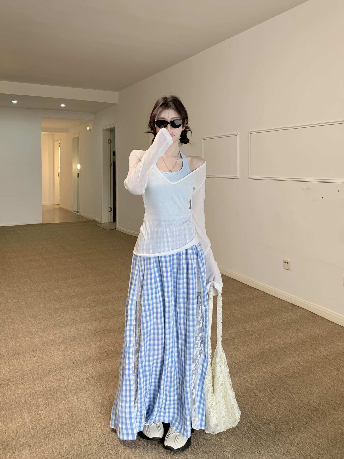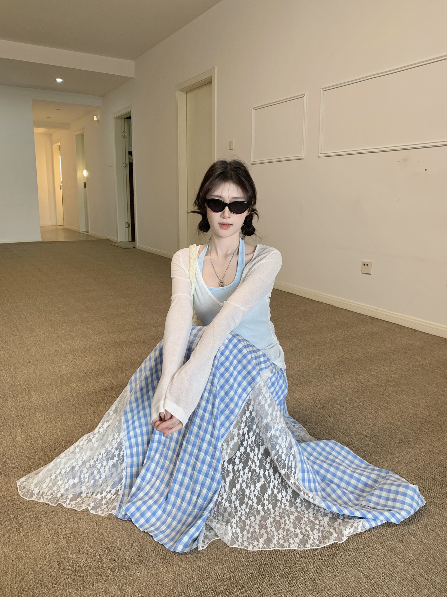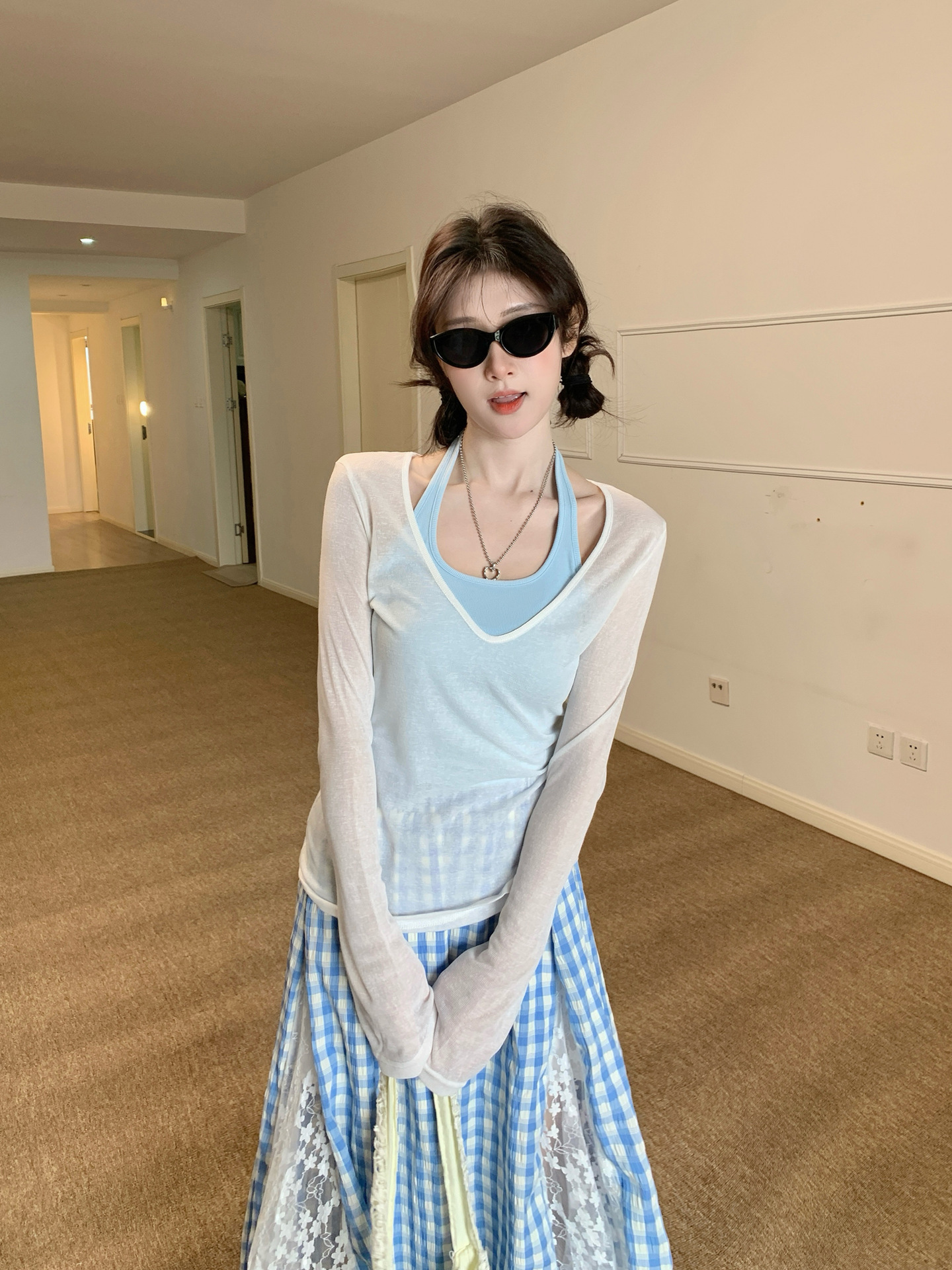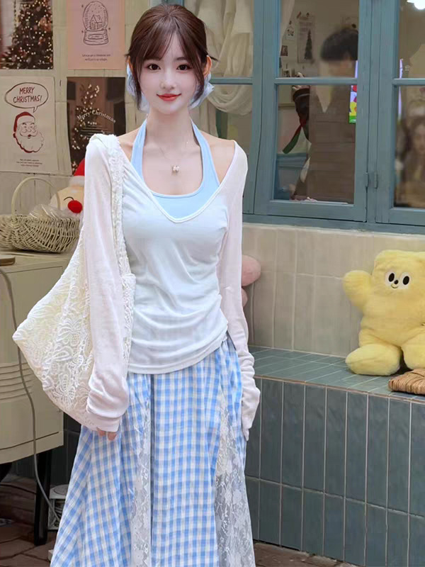 여성을 위한 순수한 여름 의상, 독특하고 아름다운 긴팔 티셔츠, 블루 홀터넥 조끼, 스커트 3종 세트스토어 가기