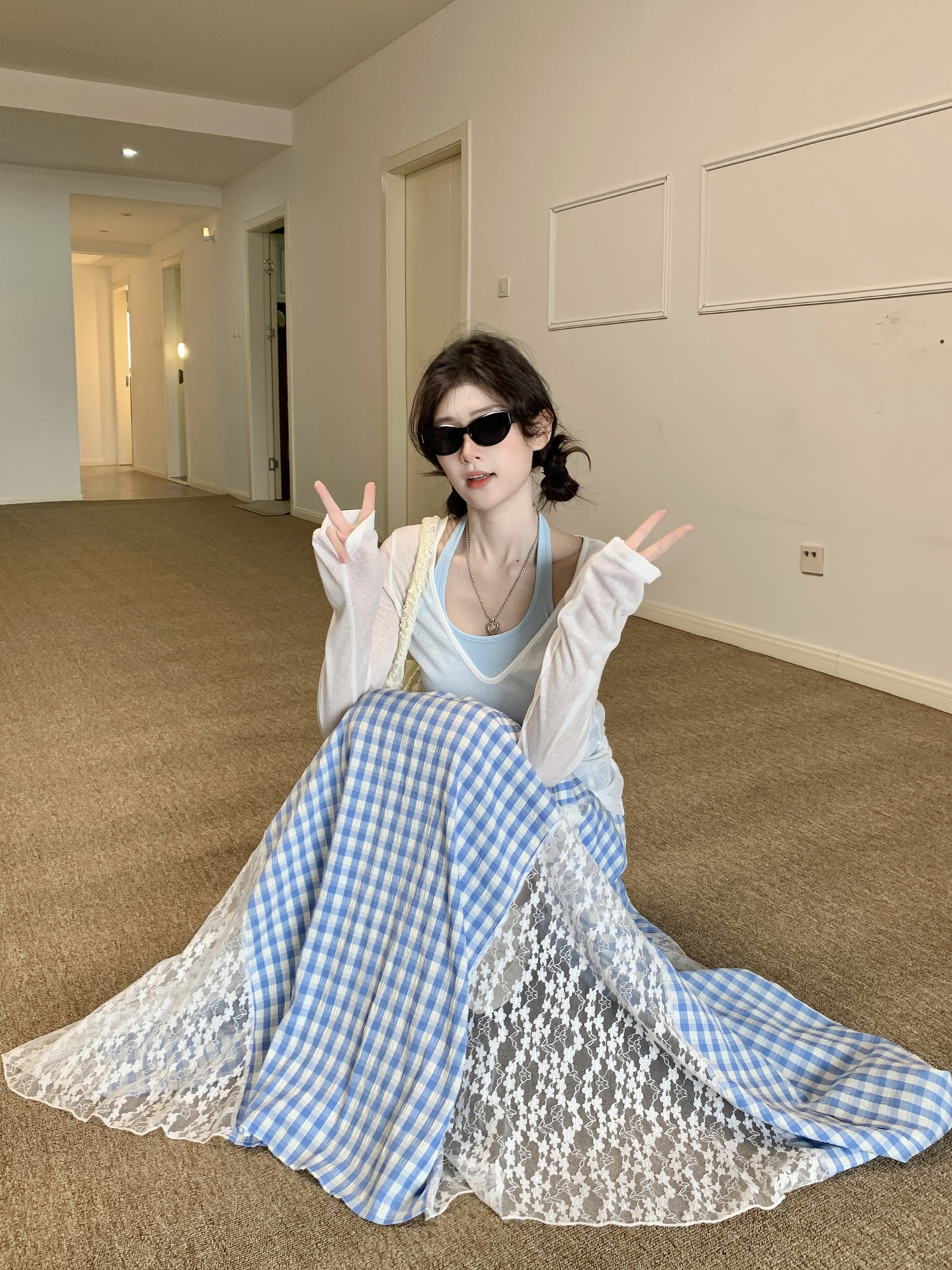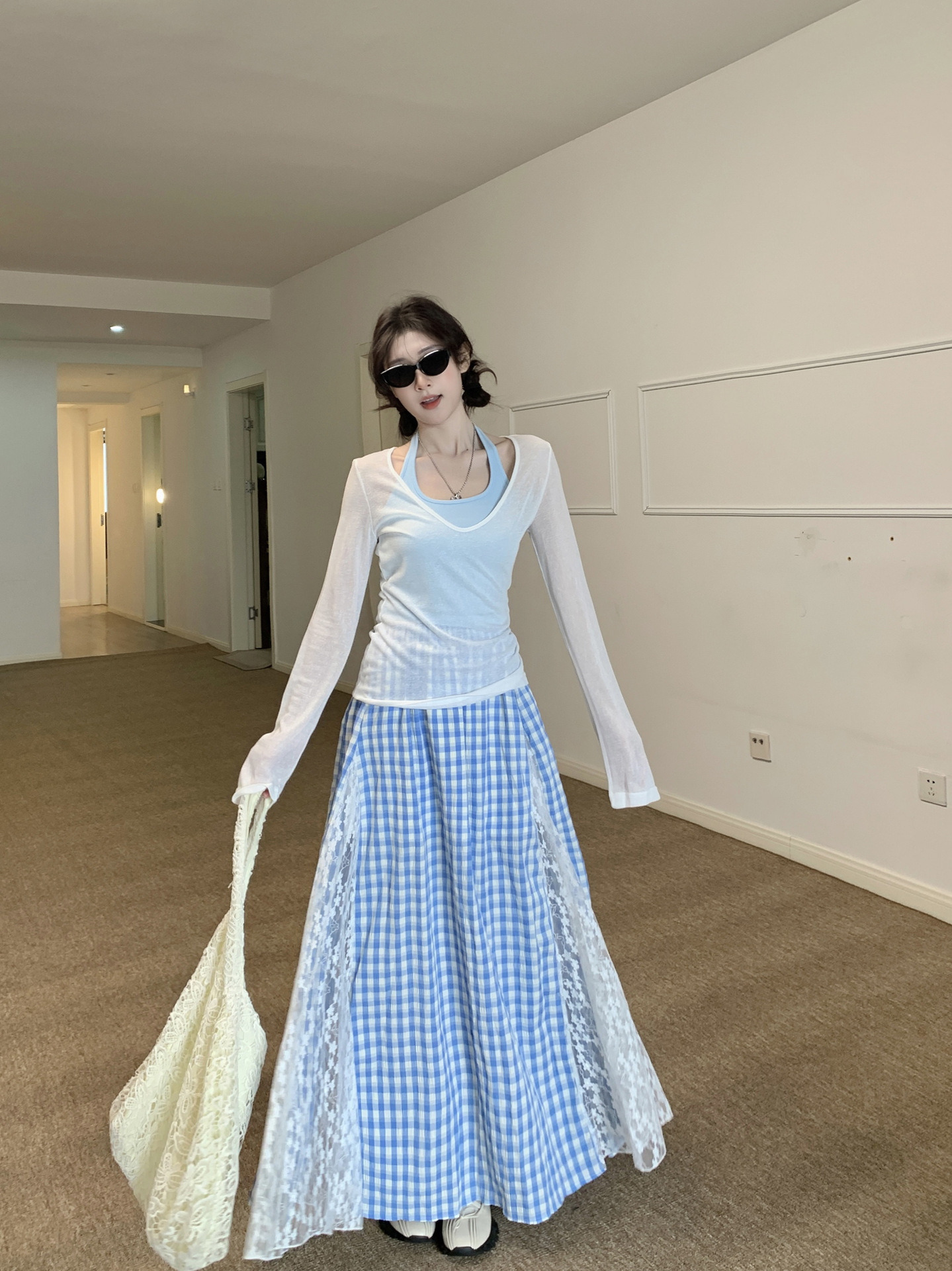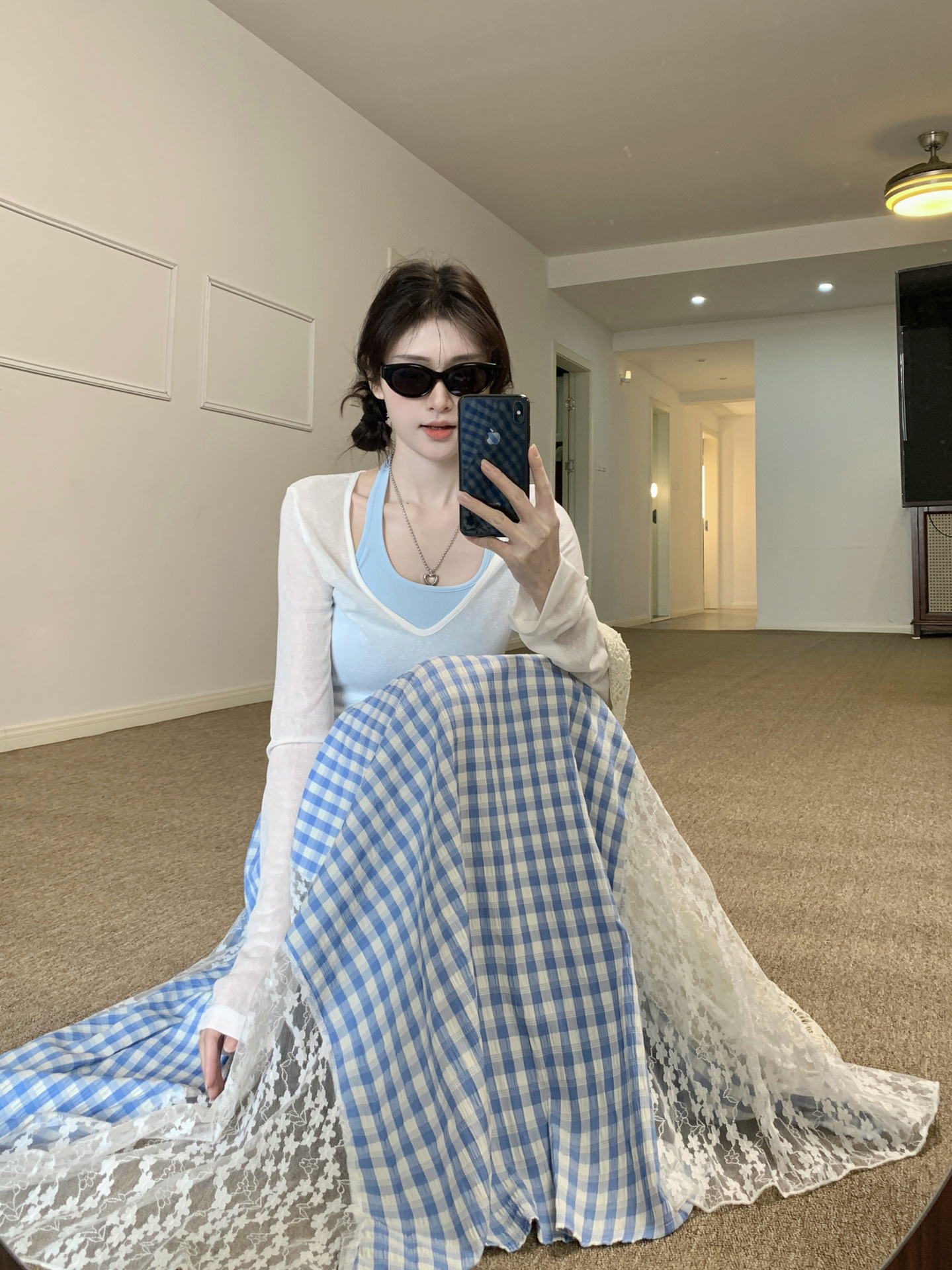 여성을 위한 순수한 여름 의상, 독특하고 아름다운 긴팔 티셔츠, 블루 홀터넥 조끼, 스커트 3종 세트스토어 가기