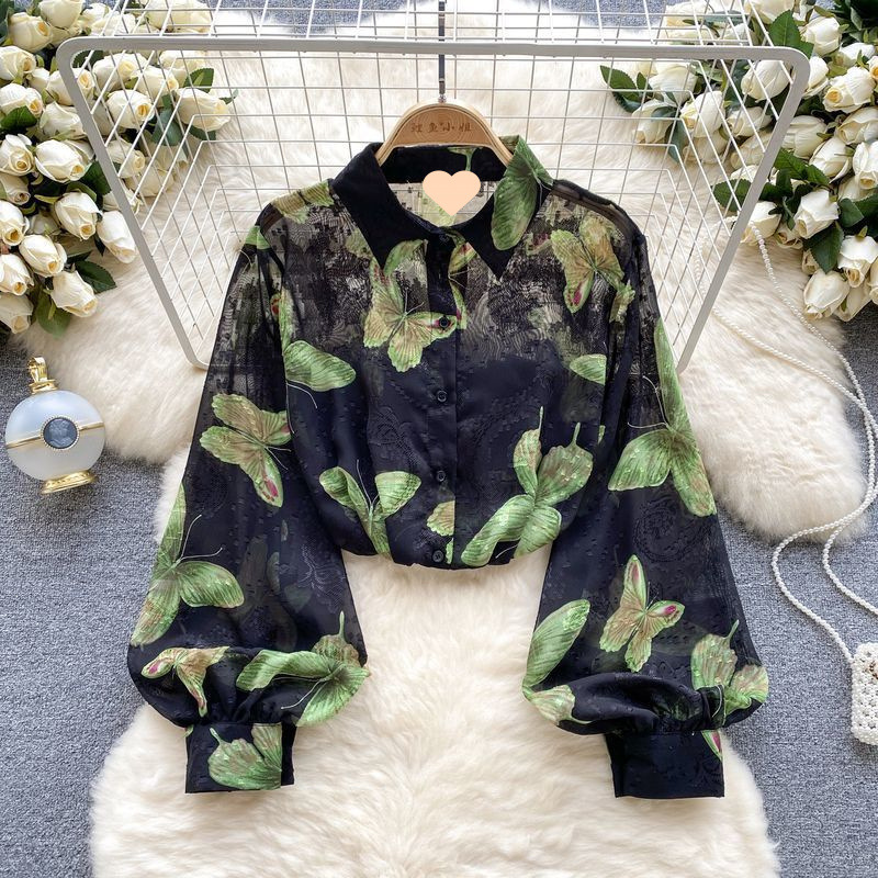 여성용 프렌치 레트로 쉬폰 꽃무늬 셔츠, 봄 여름 칼라, 랜턴 슬리브 디자인, 틈새 시크 루즈 탑스토어 가기