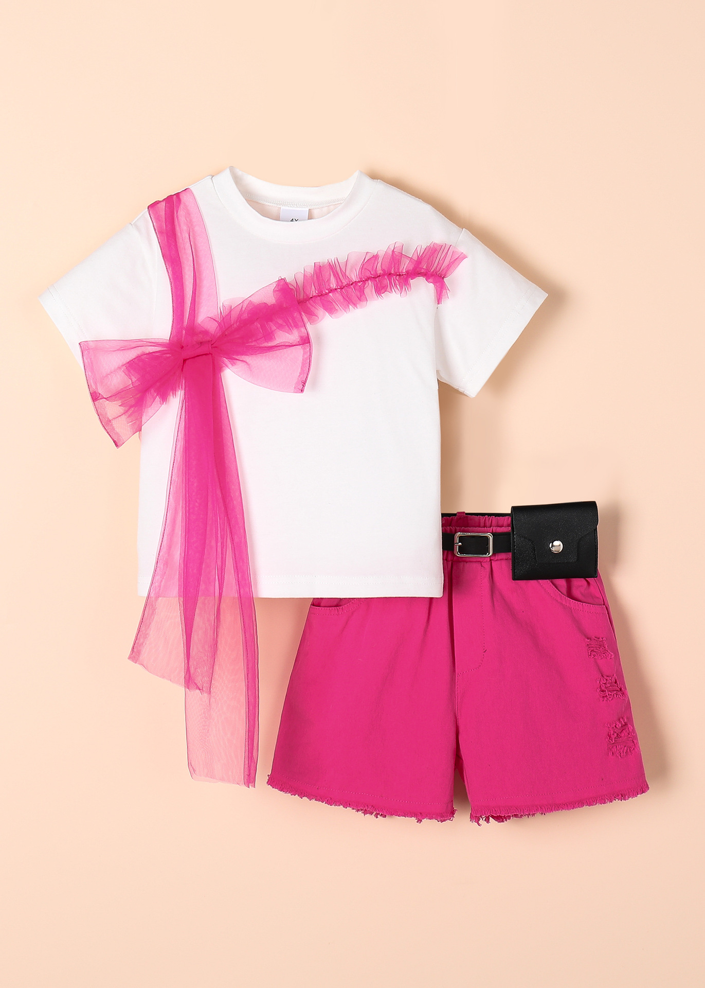 국경 간 대외 무역 새로운 기능 스타일 여름 소녀 정장 디자인 스타일 티셔츠와 데님 반바지 벨트 3 피스 세트스토어 가기