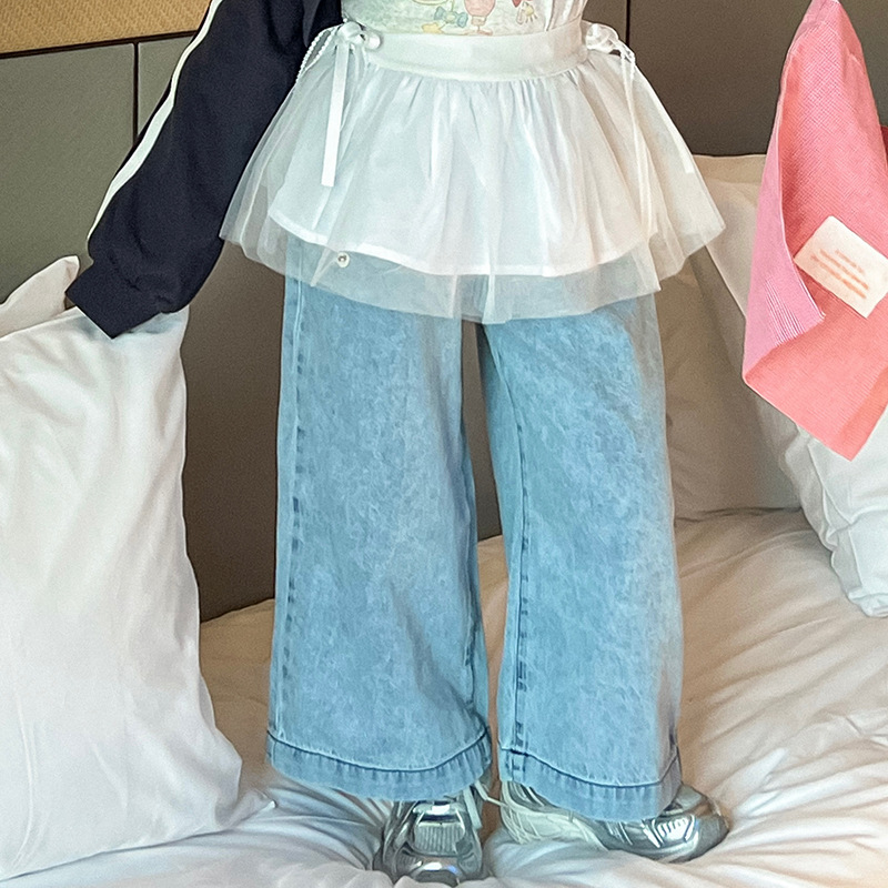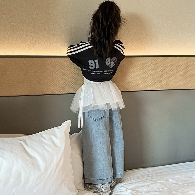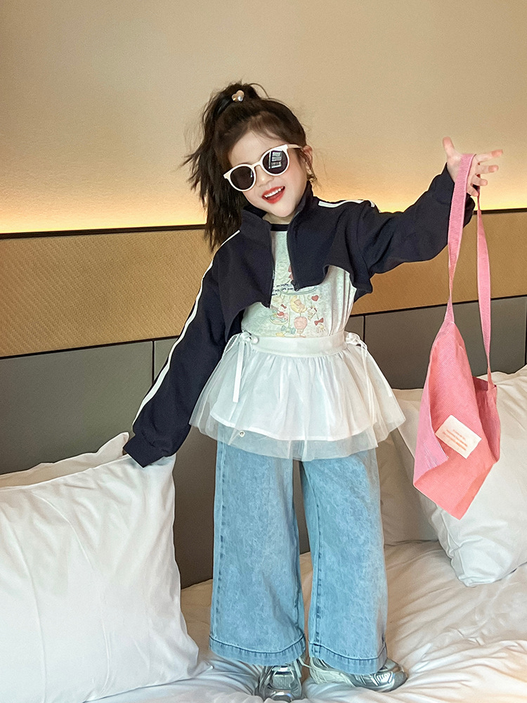 여자 짧은 줄무늬 코트 한국 만화 티셔츠 2025 봄 새로운 얇은 거즈 와이드 레그 청바지 유행