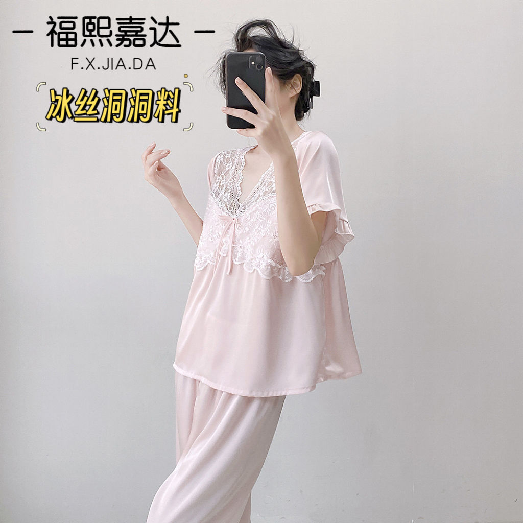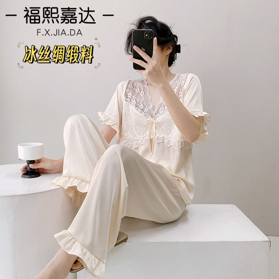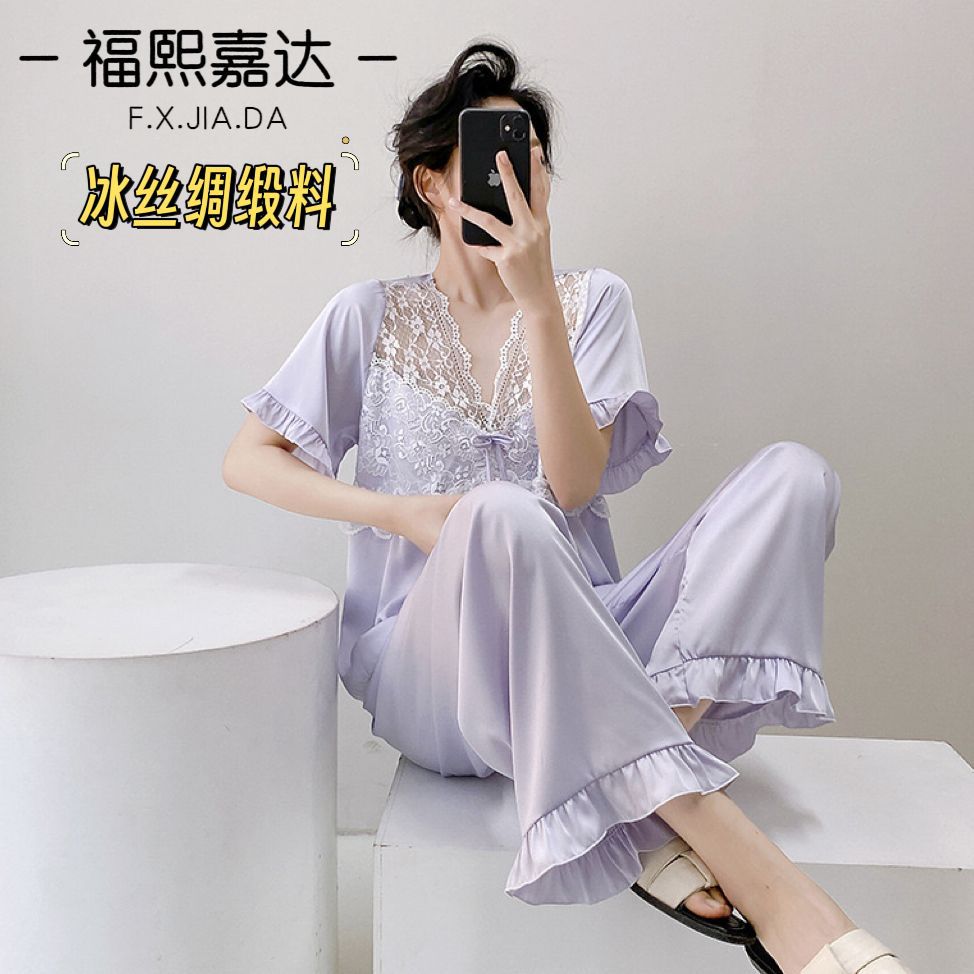 Fuxi Jiada 아이스 실크 럭셔리 반팔 잠옷 세트 18 세 소녀 여름 멋진 바지스토어 가기