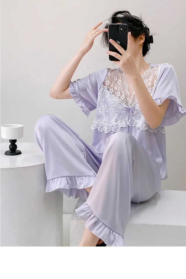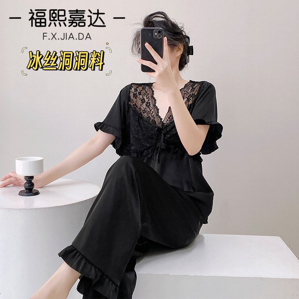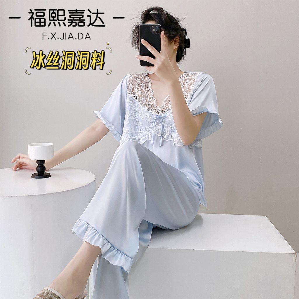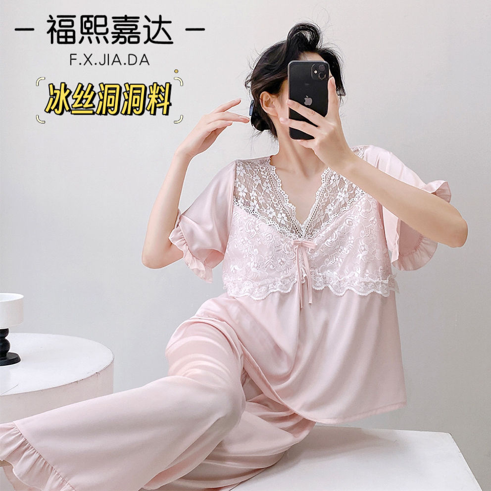 Fuxi Jiada 아이스 실크 럭셔리 반팔 잠옷 세트 18 세 소녀 여름 멋진 바지스토어 가기