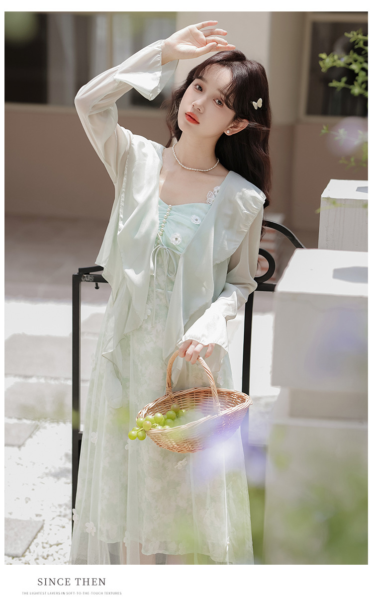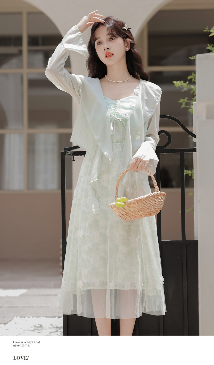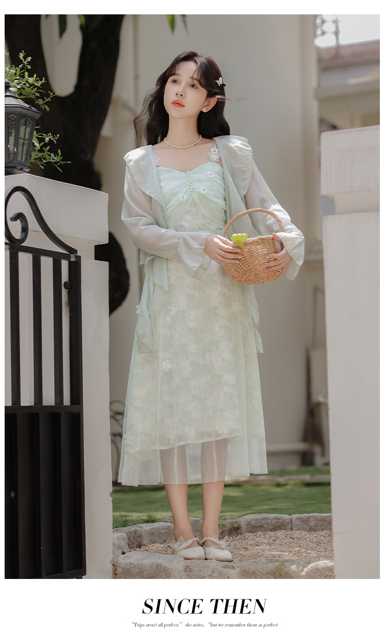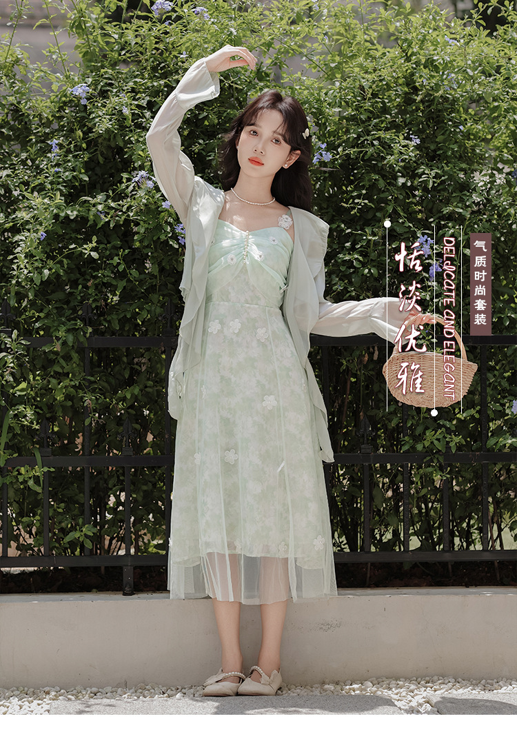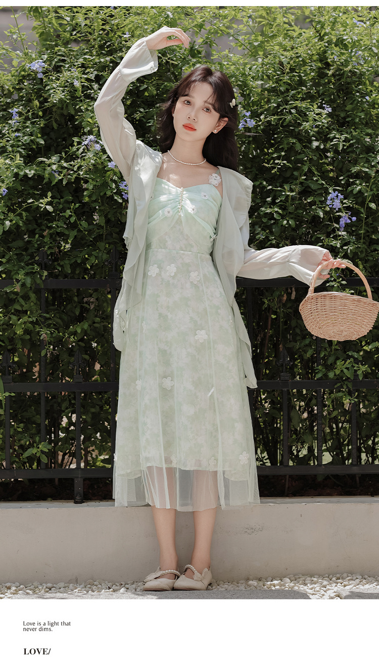 여성을위한 달콤한 요정 민트 그린 서스펜더 스커트 2025 여름 새로운 꽃 드레스와 카디건 투피스 세트
