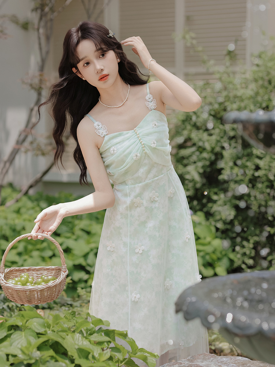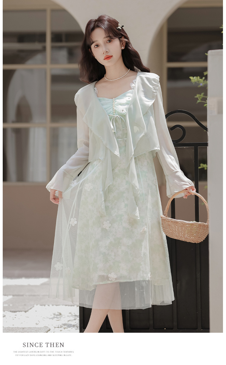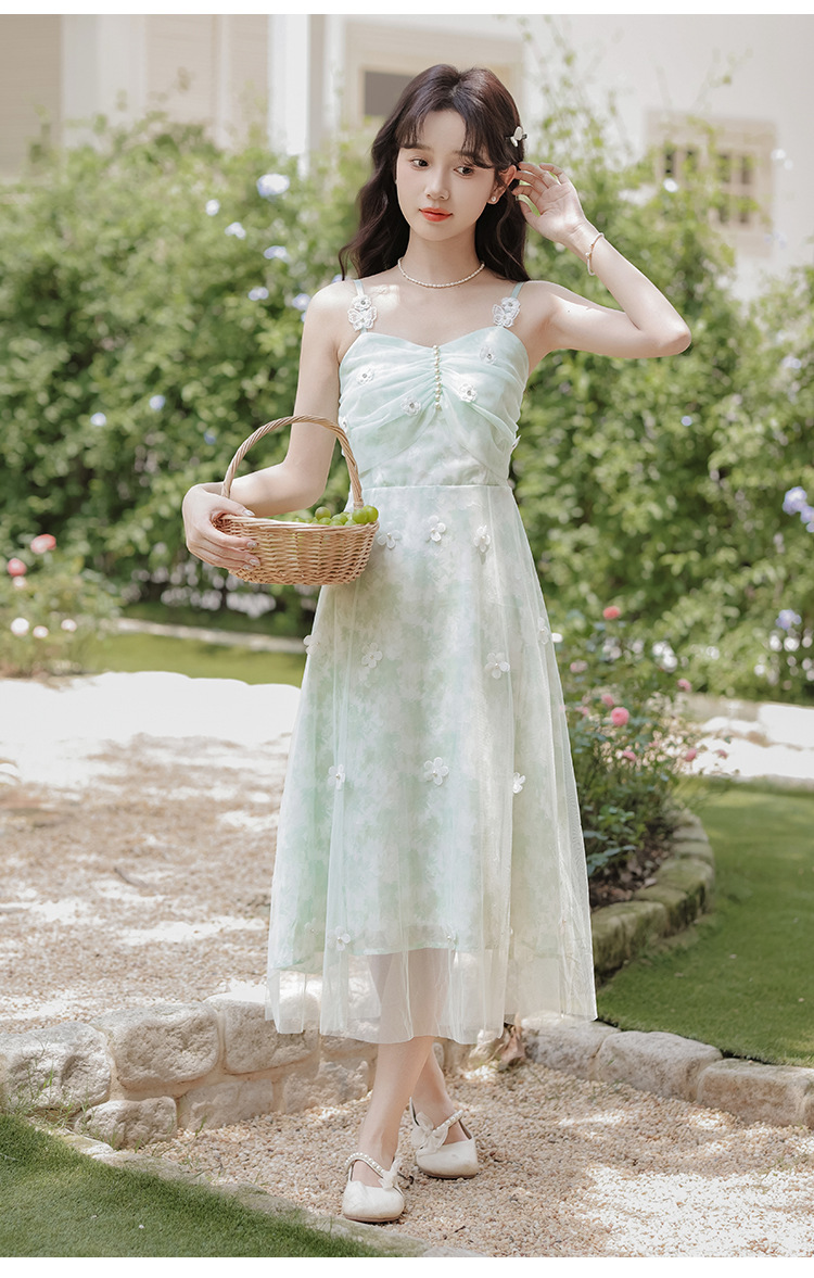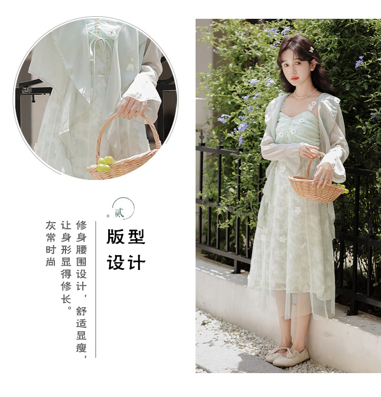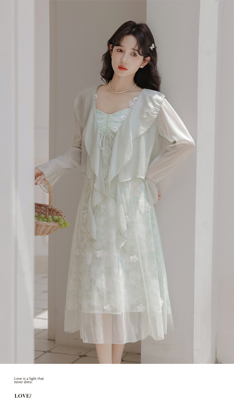 여성을위한 달콤한 요정 민트 그린 서스펜더 스커트 2025 여름 새로운 꽃 드레스와 카디건 투피스 세트