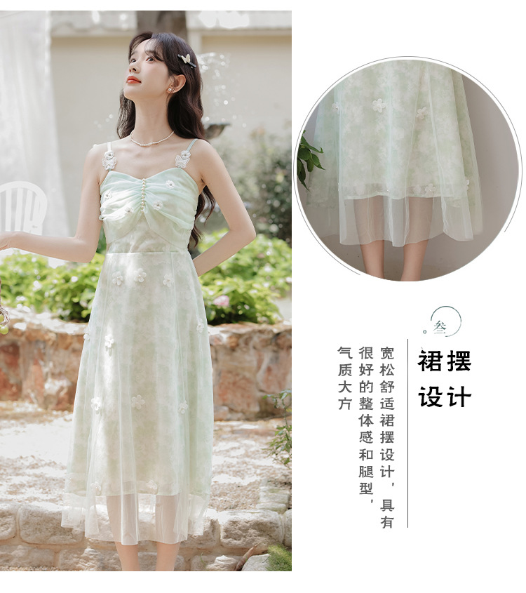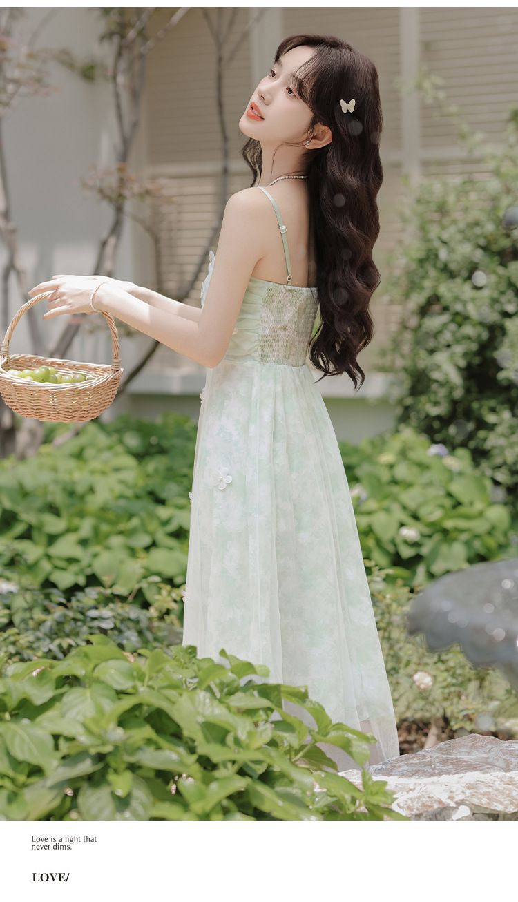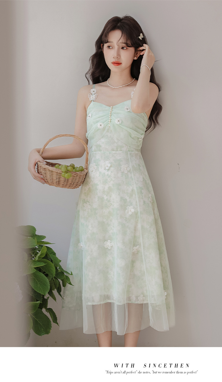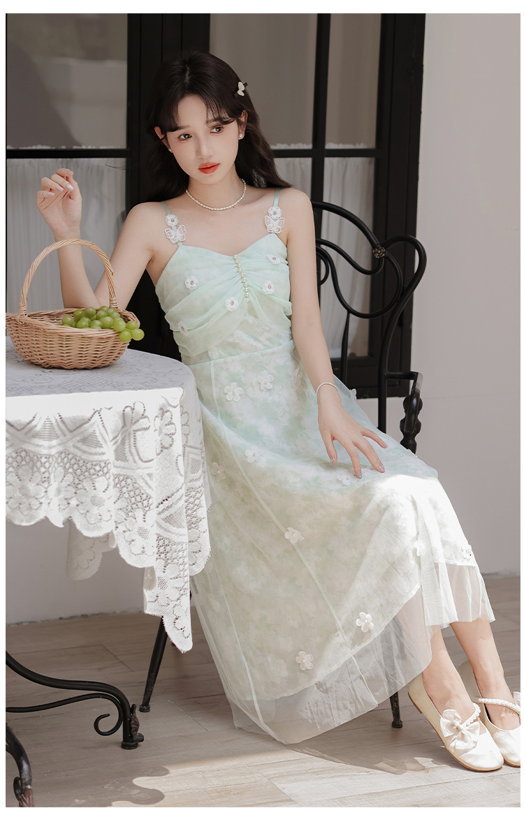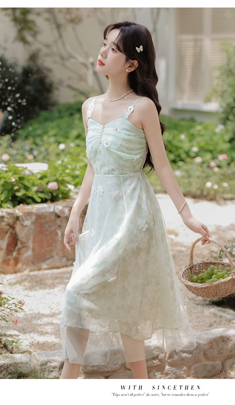 여성을위한 달콤한 요정 민트 그린 서스펜더 스커트 2025 여름 새로운 꽃 드레스와 카디건 투피스 세트