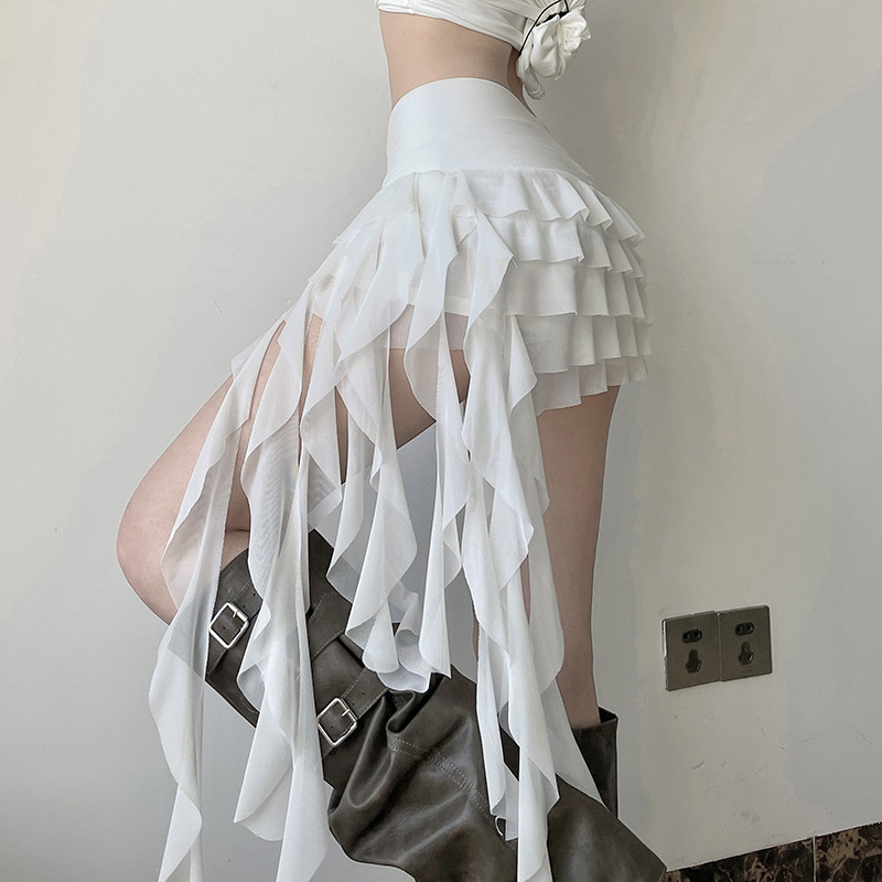 유럽과 미국 스타일의 2025 봄 여름 새로운 스타일 신선한 불규칙한 프릴 리본 하프 길이 핫 소녀 메쉬 스커트 여성용