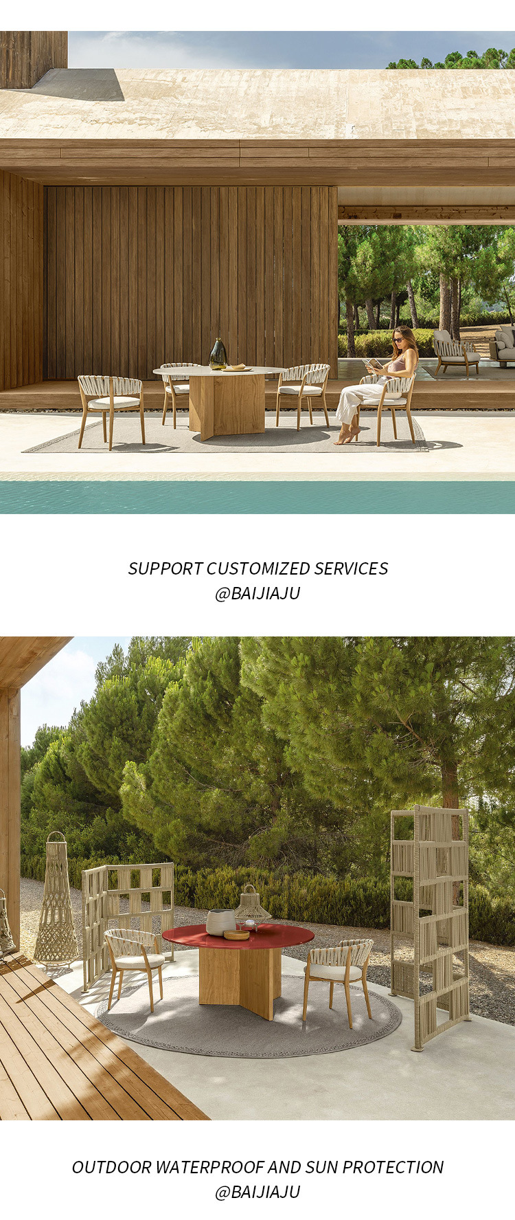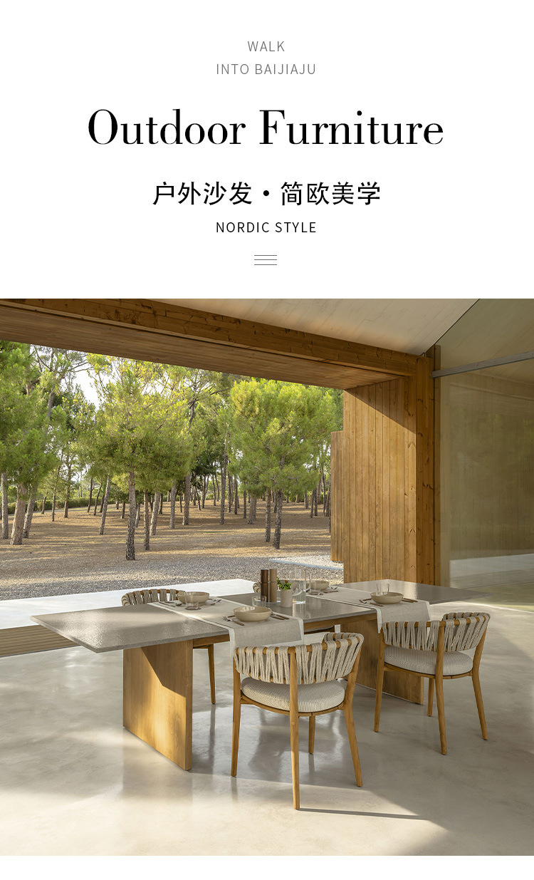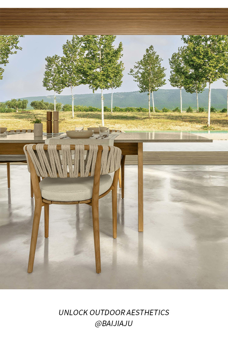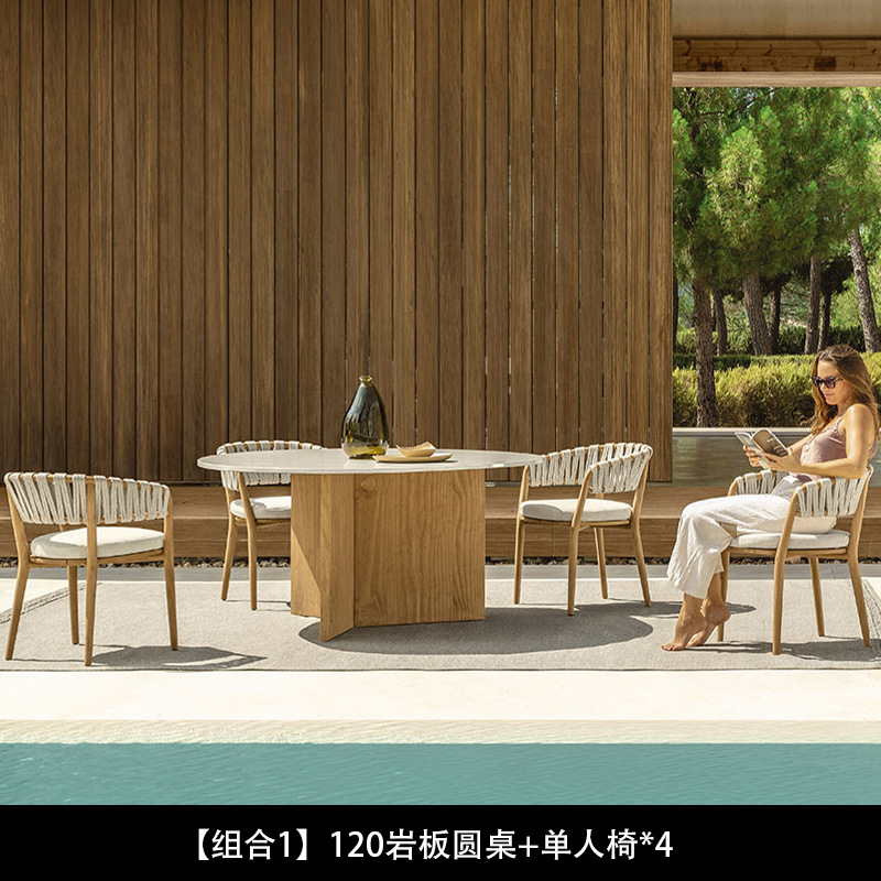 야외 로프로 짠 원목 식탁과 의자, 비와 햇빛 차단, 빌라 호텔 야외 등나무로 짠 티크 목재 안뜰 레스토랑 바 의자스토어 가기