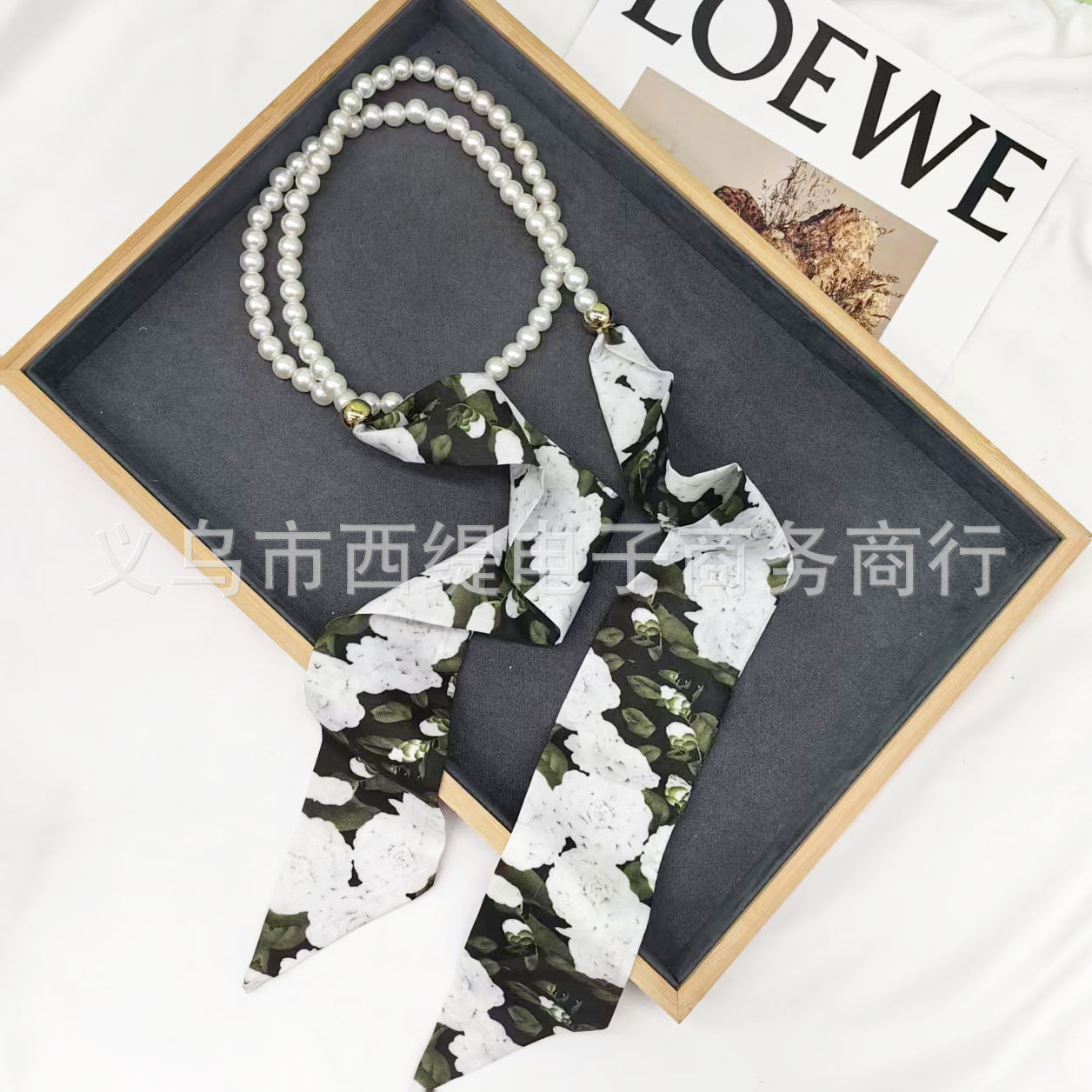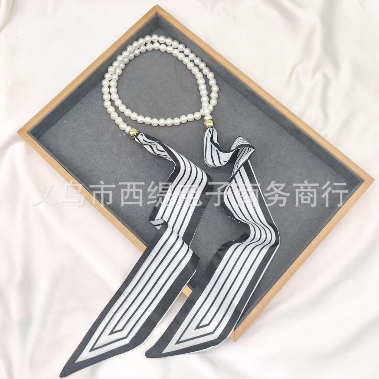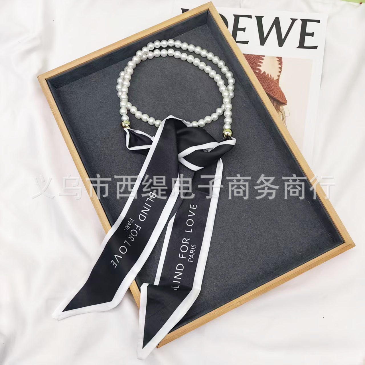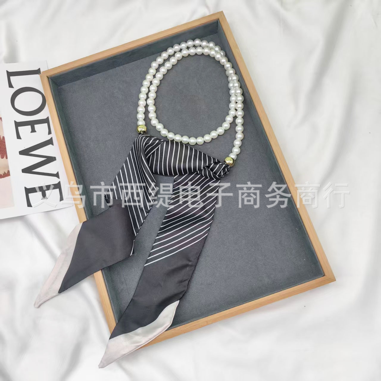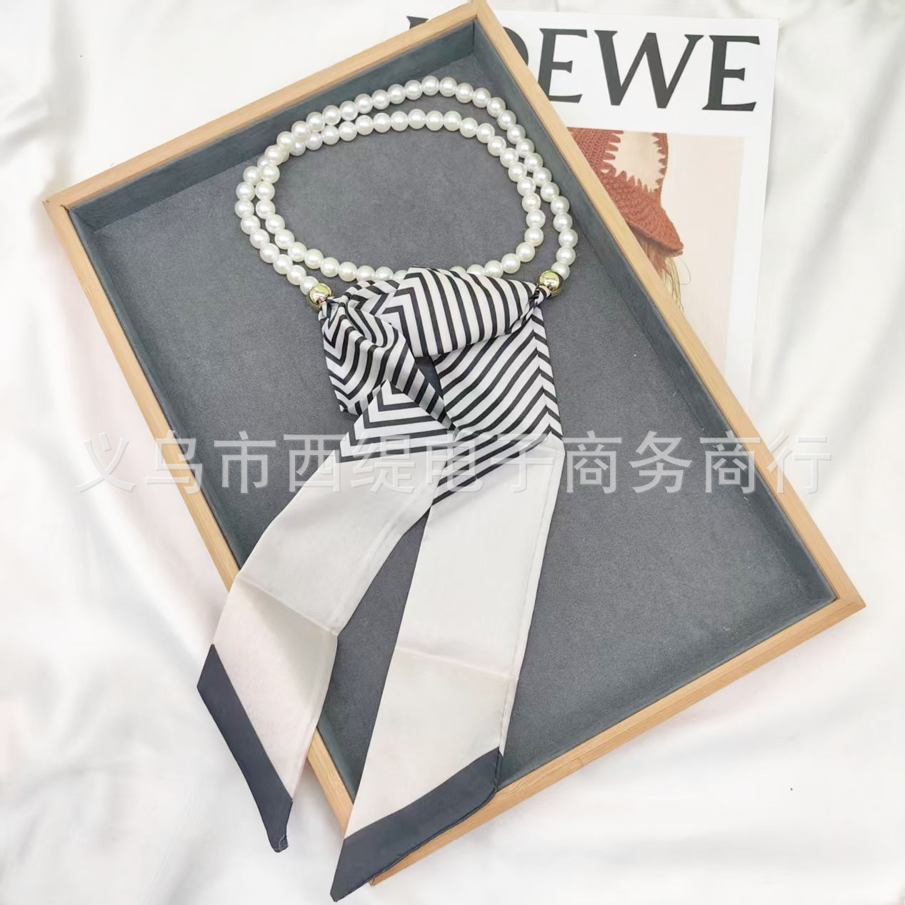 봄 여름 진주 실크 스카프 목걸이, 우아하고 고급스러운 스타일, 여성을 위한 나른한 틈새 쇄골 체인 장식, 가방 리본