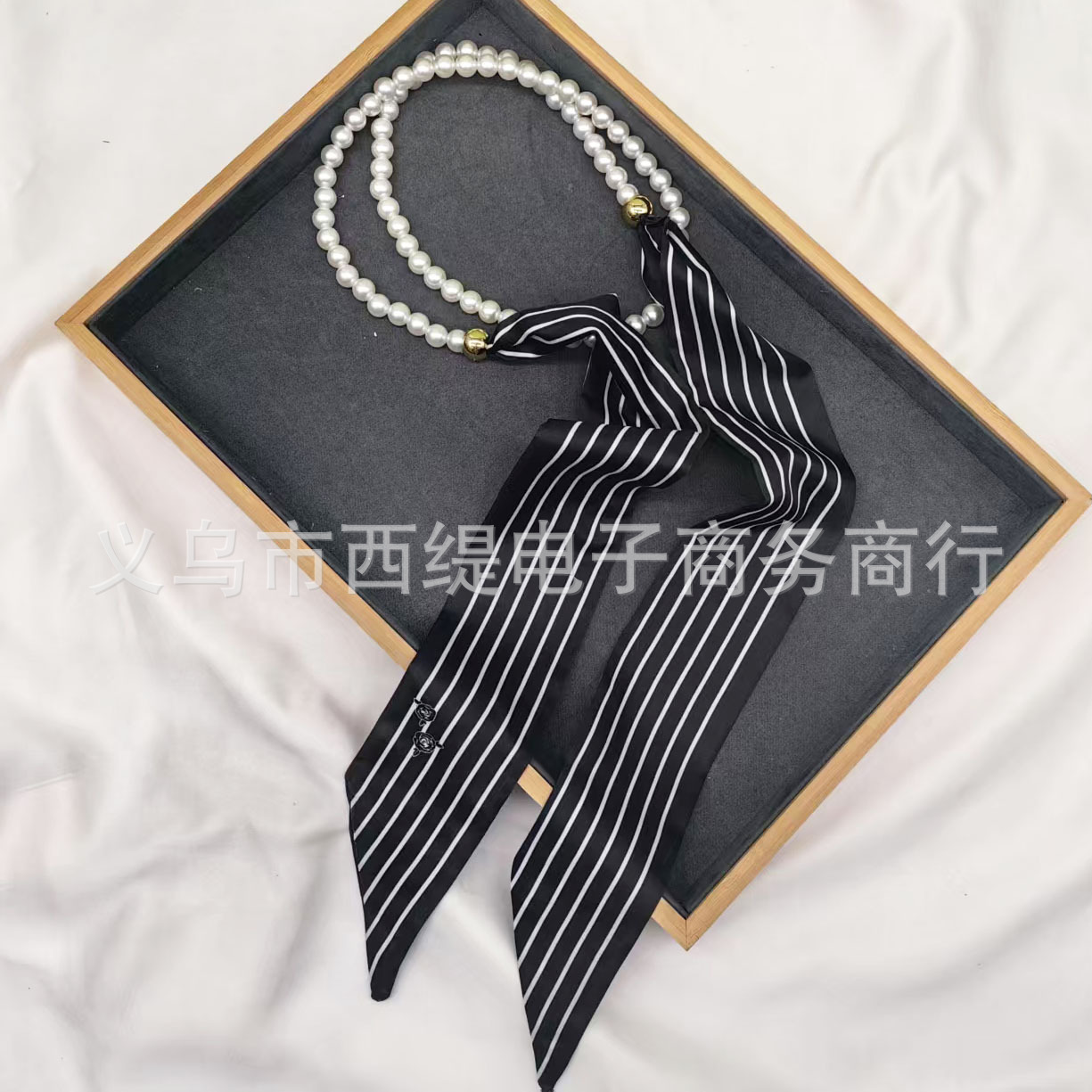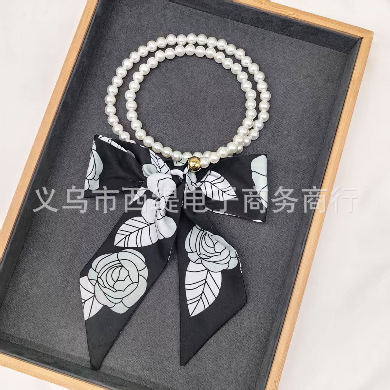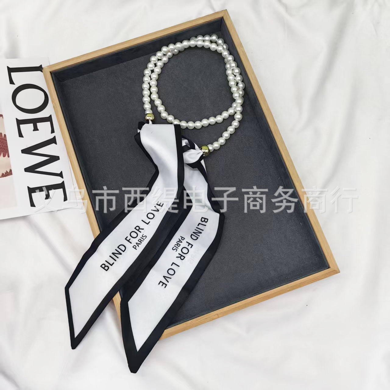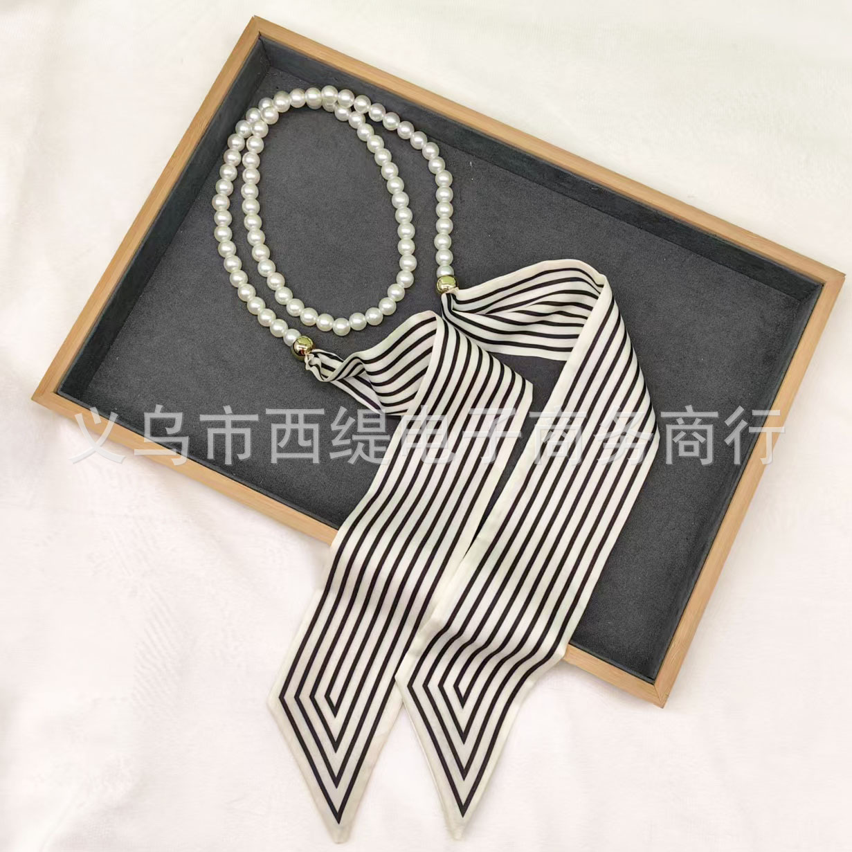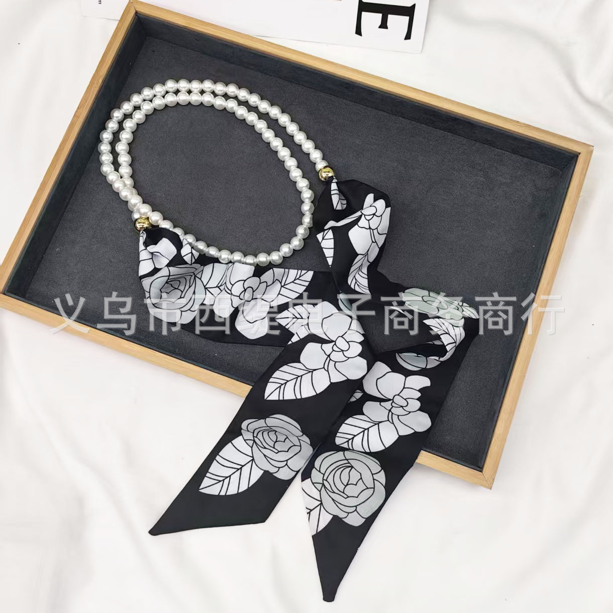 봄 여름 진주 실크 스카프 목걸이, 우아하고 고급스러운 스타일, 여성을 위한 나른한 틈새 쇄골 체인 장식, 가방 리본