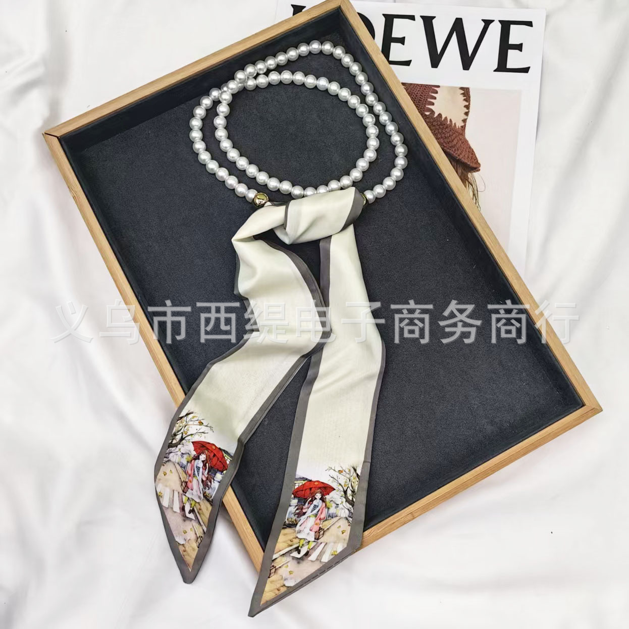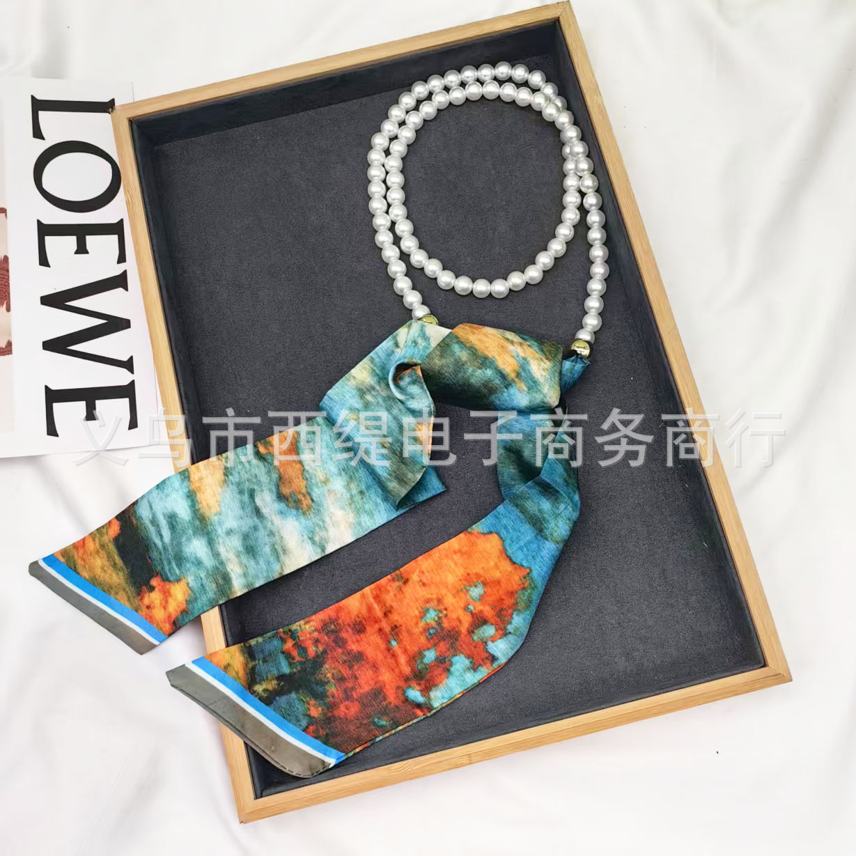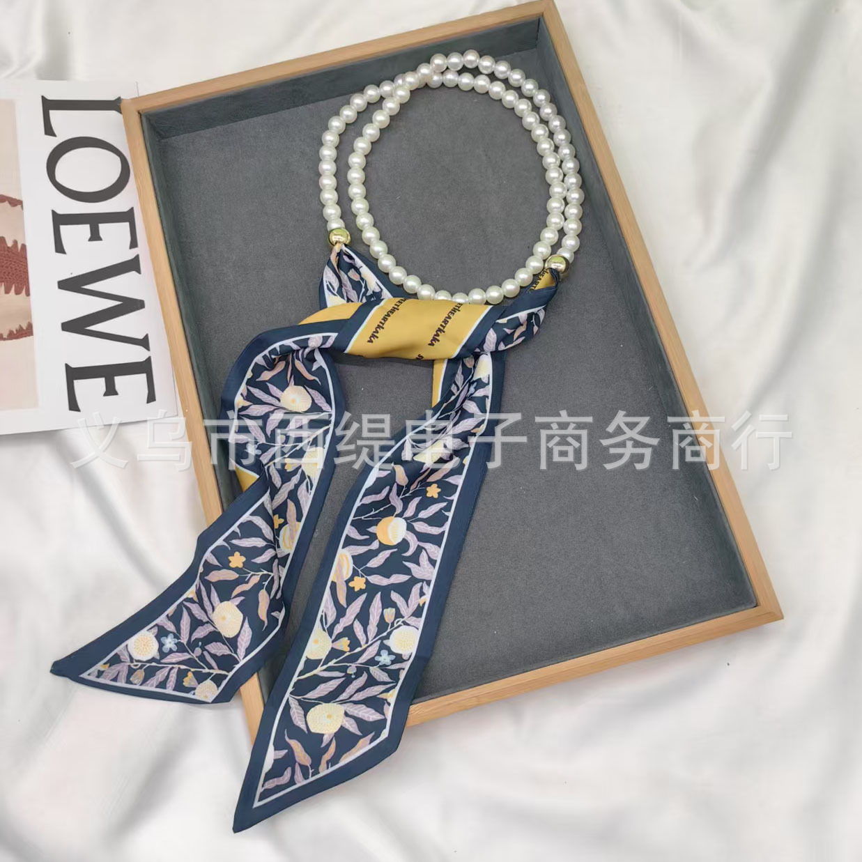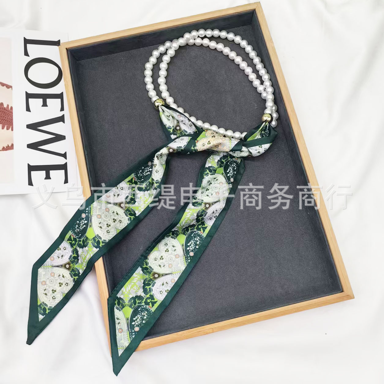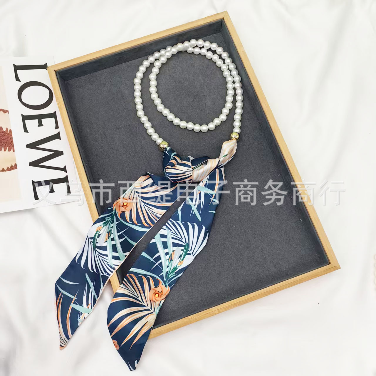 봄 여름 진주 실크 스카프 목걸이, 우아하고 고급스러운 스타일, 여성을 위한 나른한 틈새 쇄골 체인 장식, 가방 리본스토어 가기