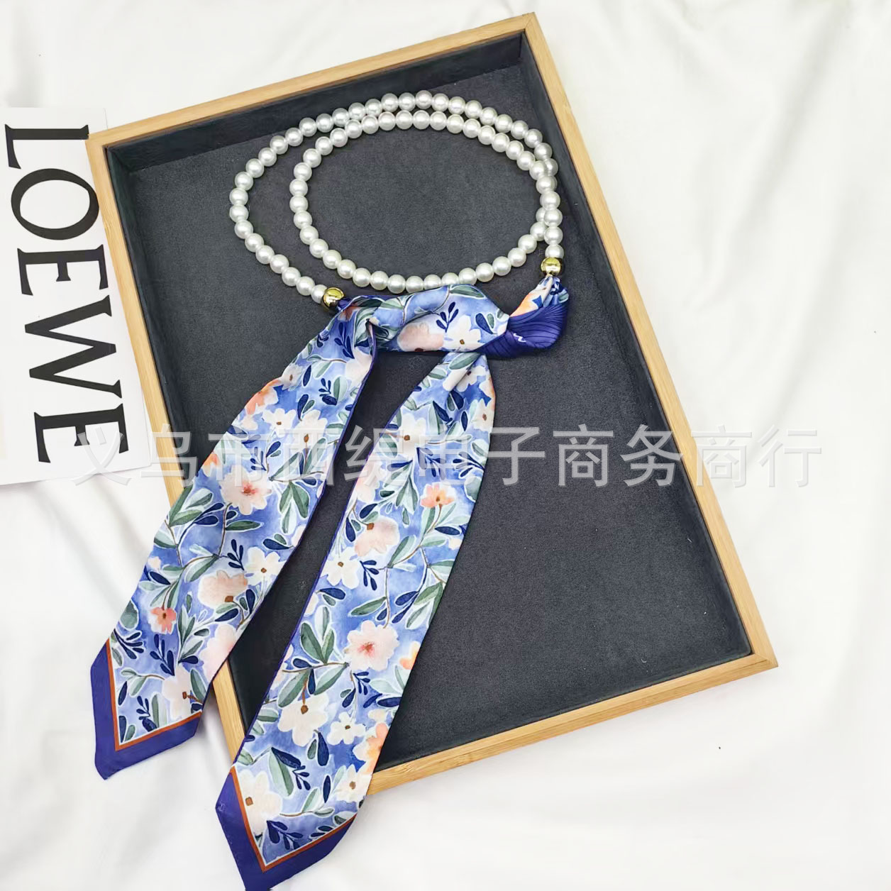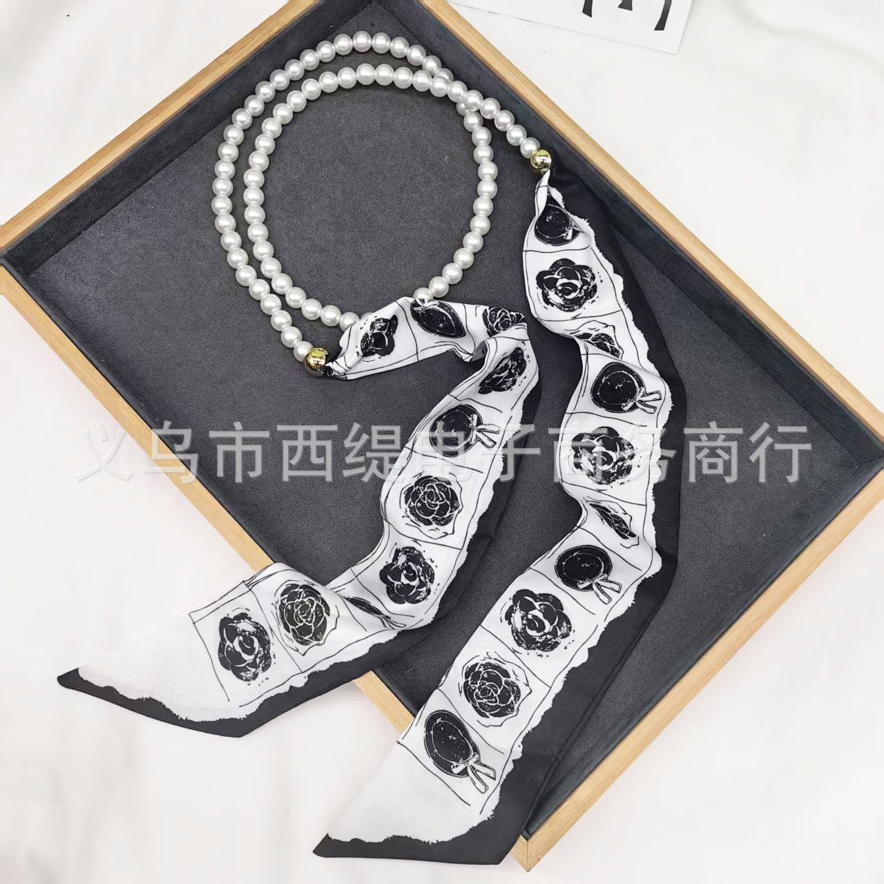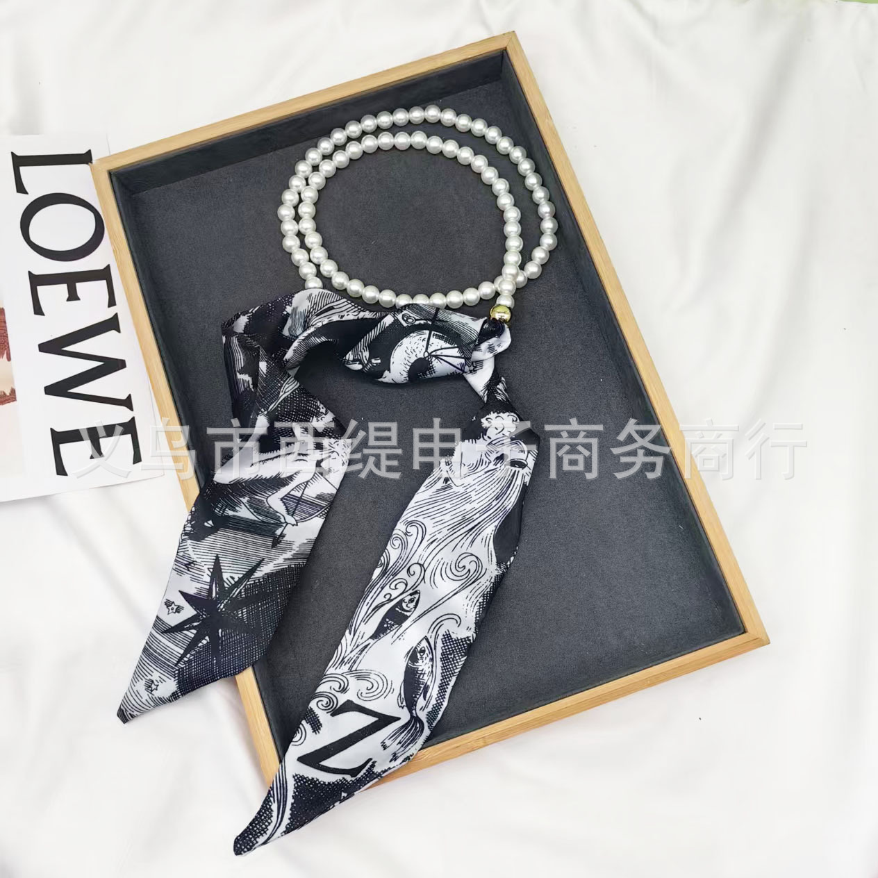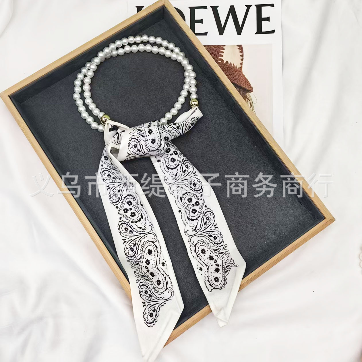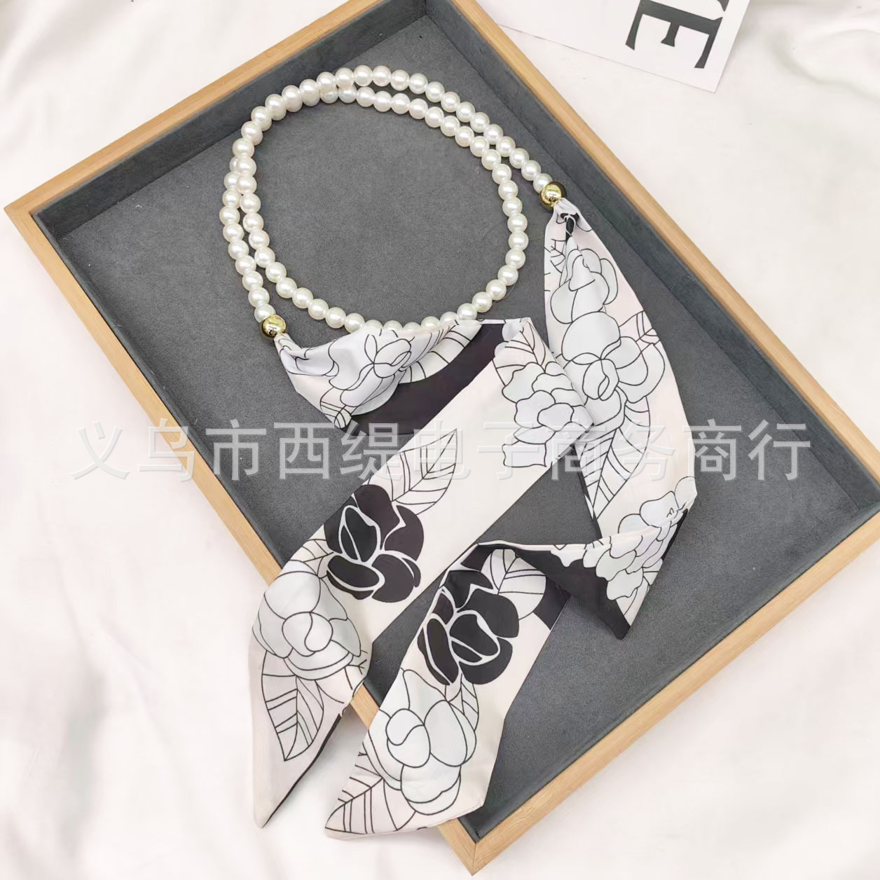 봄 여름 진주 실크 스카프 목걸이, 우아하고 고급스러운 스타일, 여성을 위한 나른한 틈새 쇄골 체인 장식, 가방 리본스토어 가기