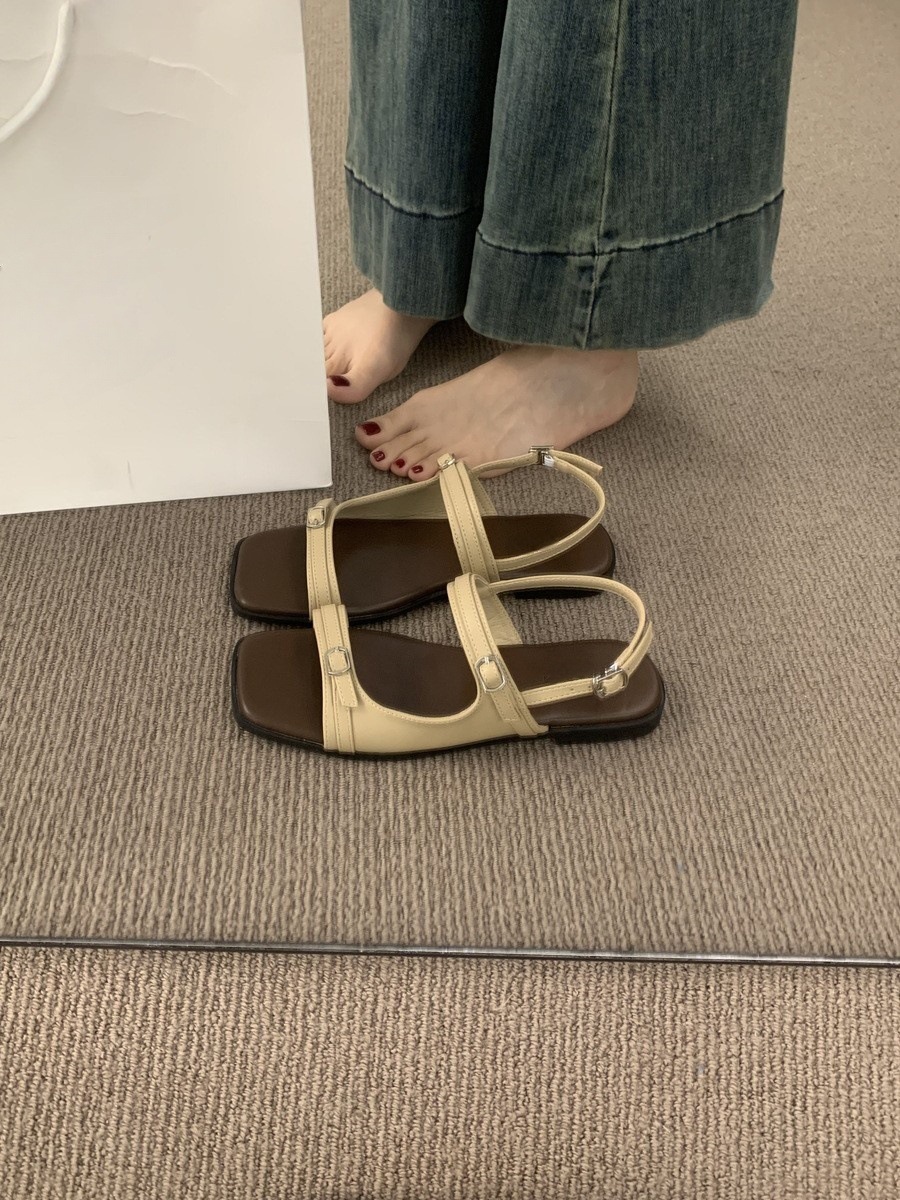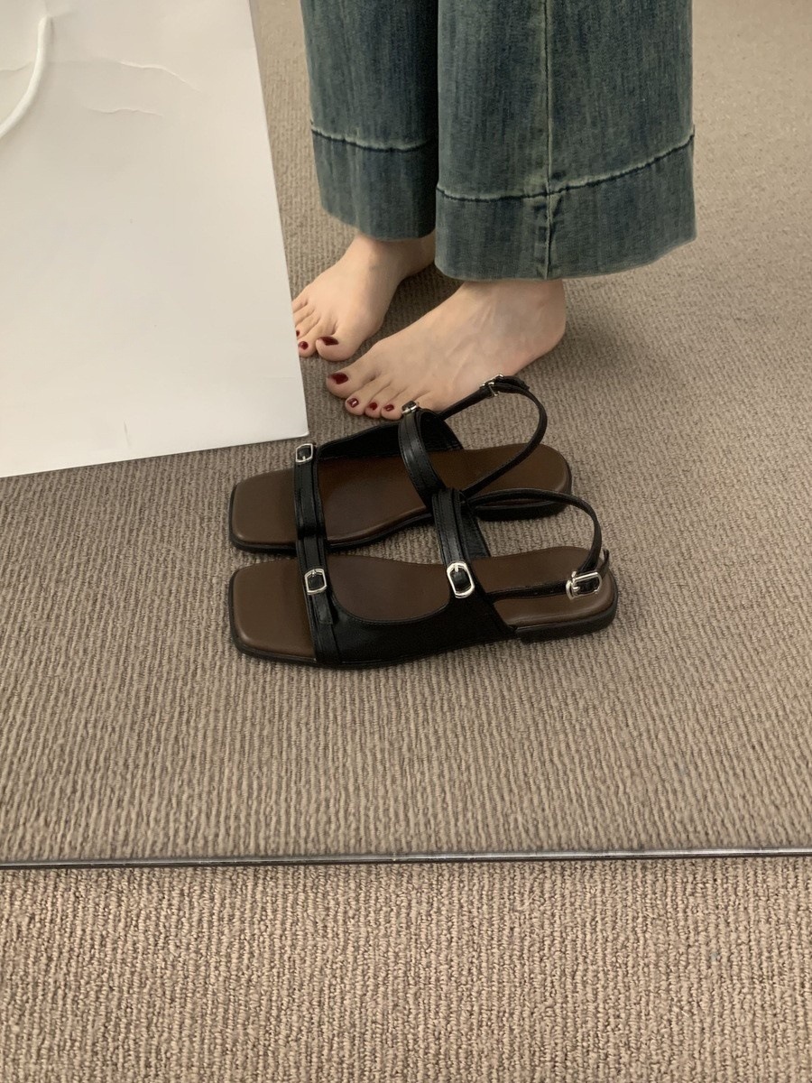 여름 인터넷 연예인 슈퍼 핫 비치 로마 신발 여성을위한 한국 디자이너 오픈 토우 스퀘어 토우 버클 플랫 샌들