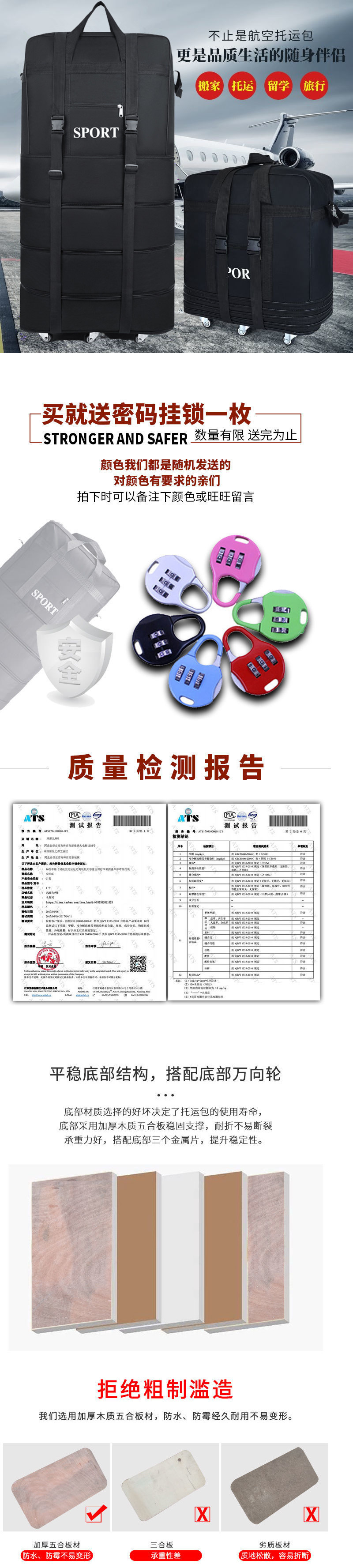 • 60inch 검정색 유니버설 5개 강철 바퀴에는 방폭 스트랩 2개 + 잠금 장치가 함께 제공됩니다.