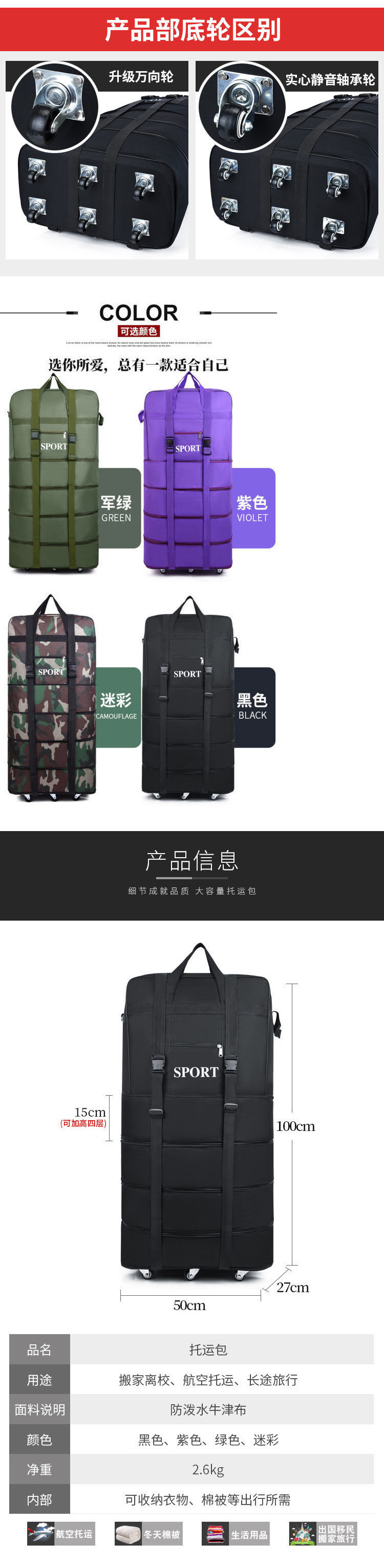 접이식 방수 158 항공 체크 가방 옥스포드 천 대용량 수하물 가방 바퀴 달린 가방 이동 가방
