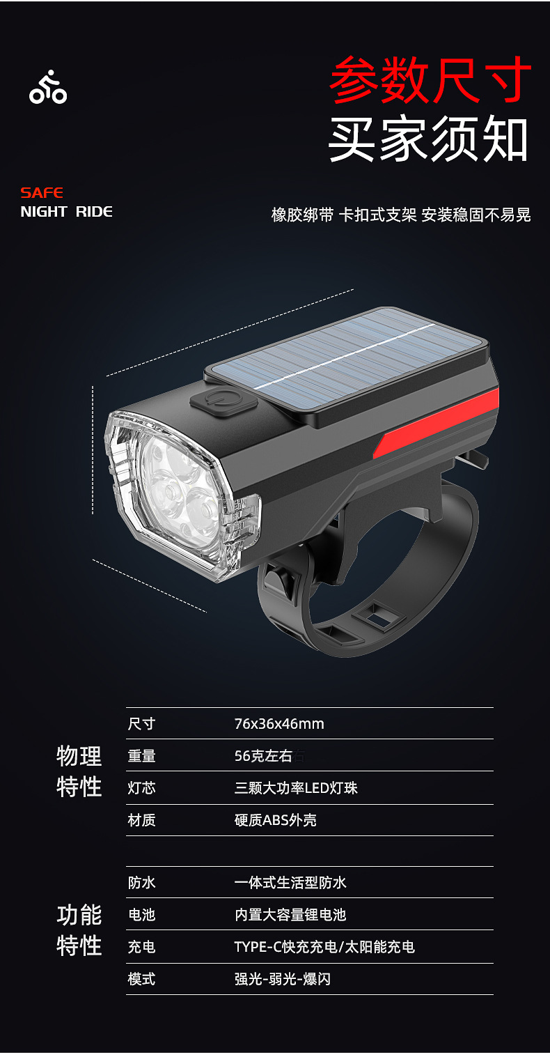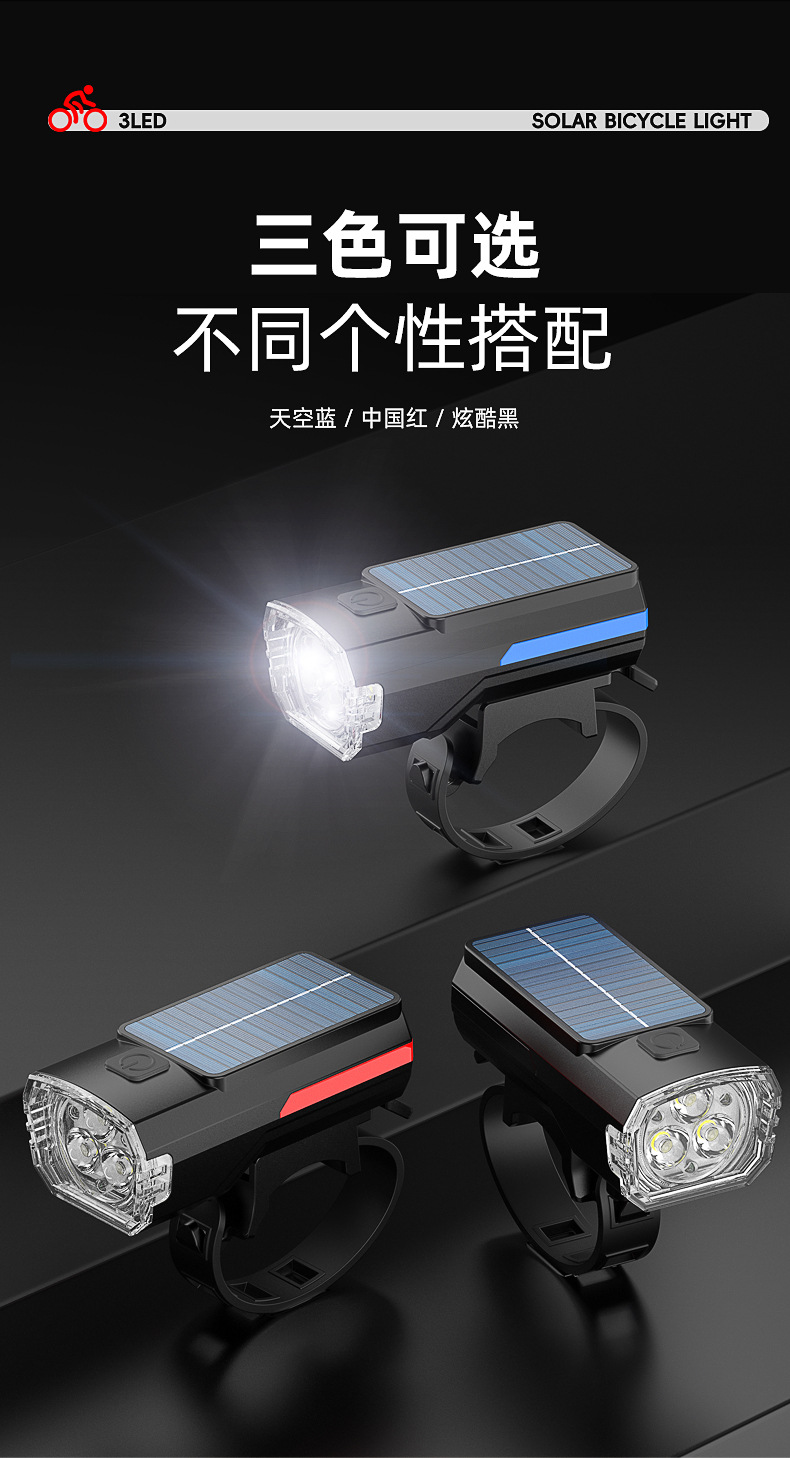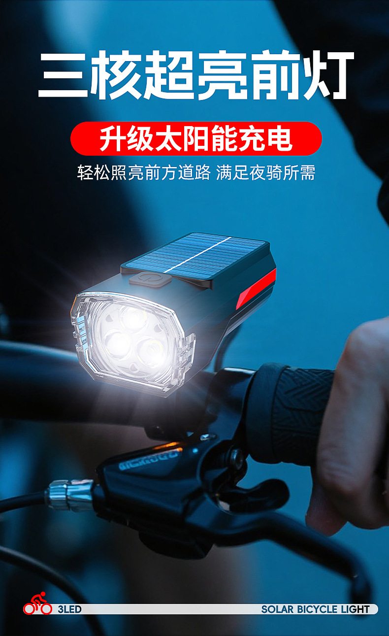 새로운 자전거 라이트 태양열 충전식 헤드라이트 경적 산악 자전거 야간 조명 USB 충전 7588