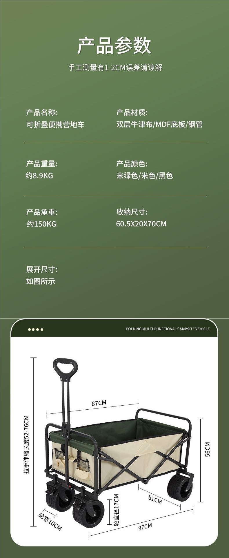 • 캠퍼밴 + 접이식 테이블 - 대형 트레일러 탱크 휠(카키색)