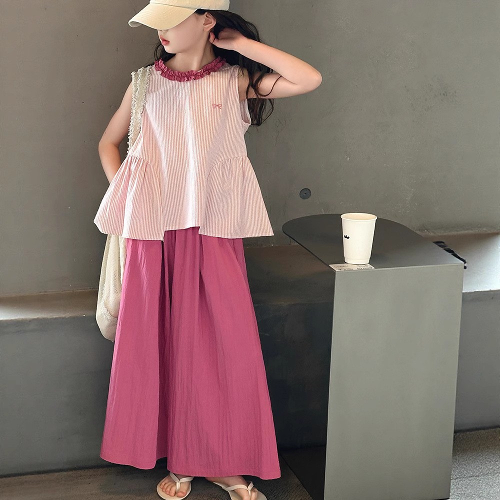 여아 시원한 민소매 양복 2025 여름 신작 큰 어린이 한국 스타일 조끼 와이드 팬츠 야마모토 바지 투피스 세트 유행스토어 가기