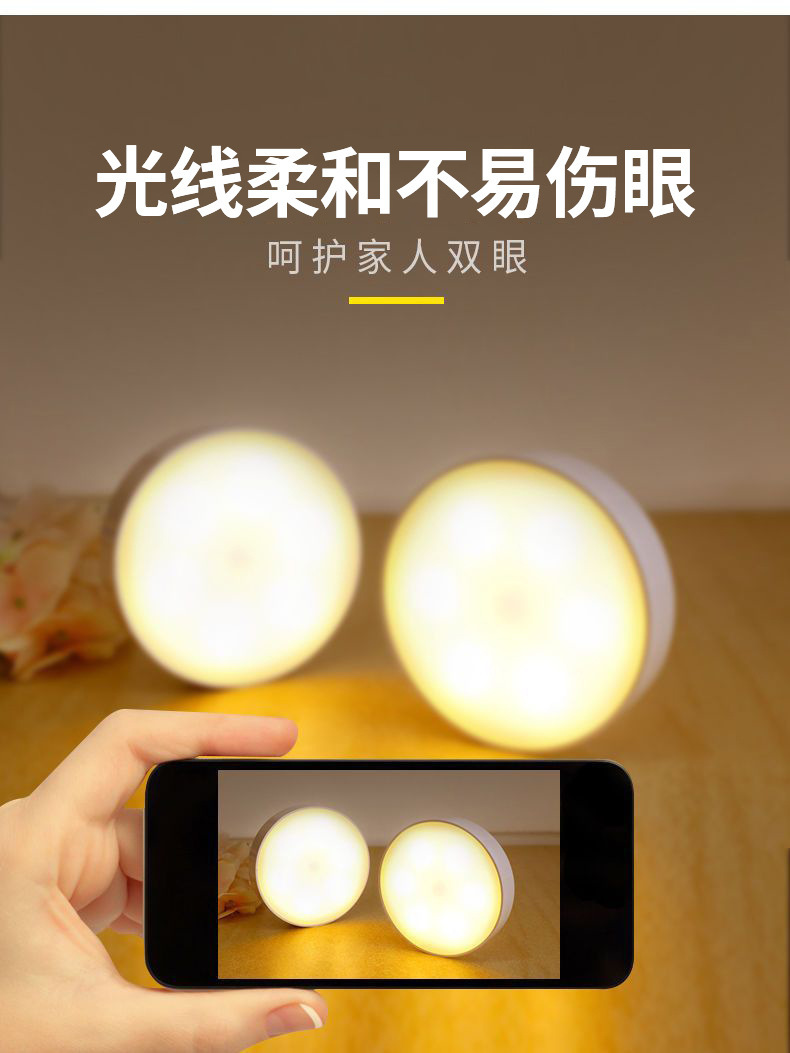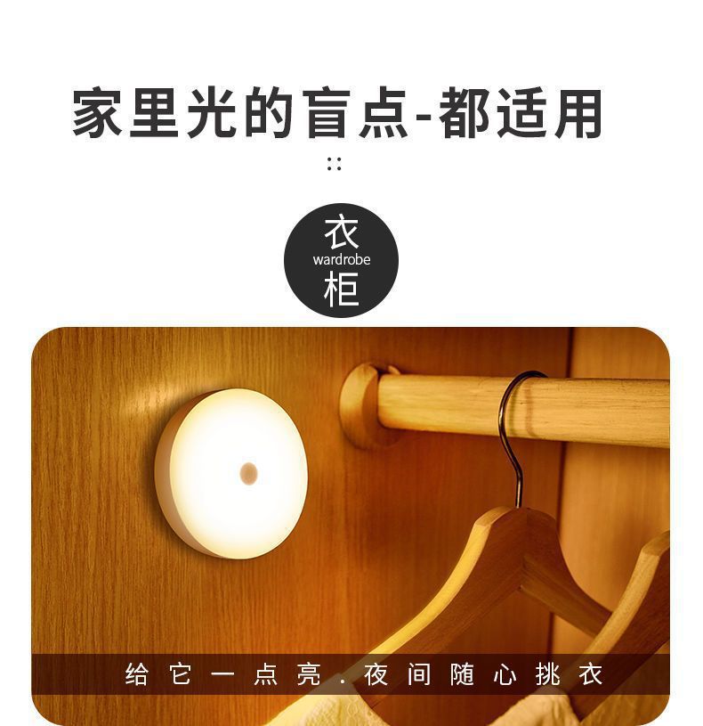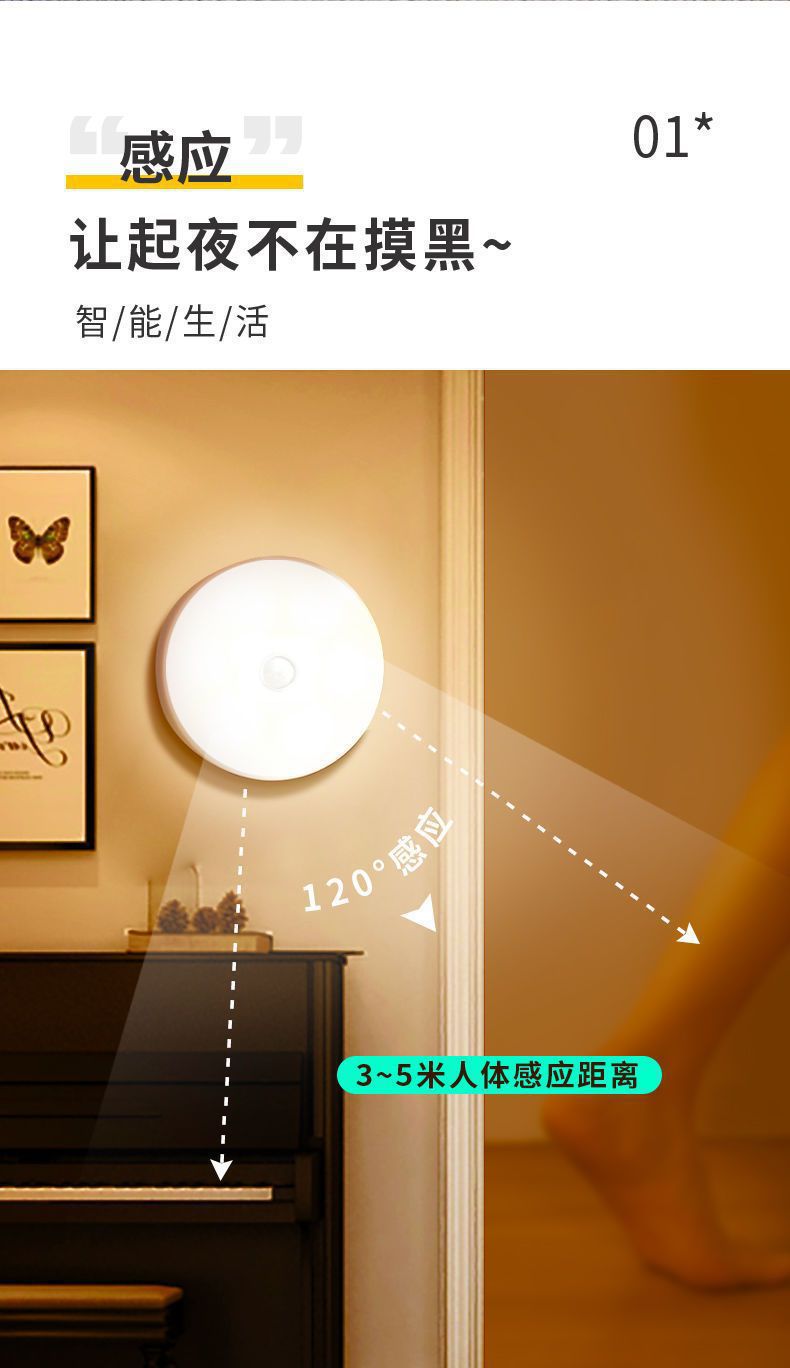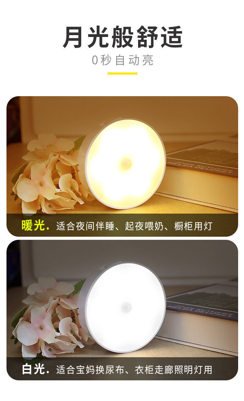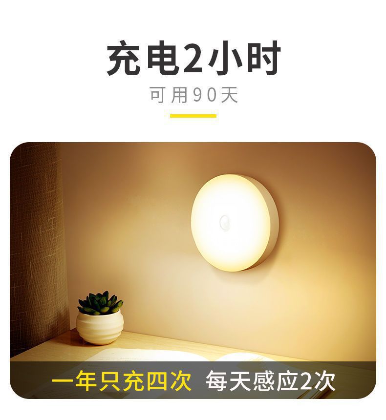 둥근 지능형 인체 센서 램프 머리맡 침실 캐비닛 계단 자동 조명 제어 자기 충전식 미니 야간 조명