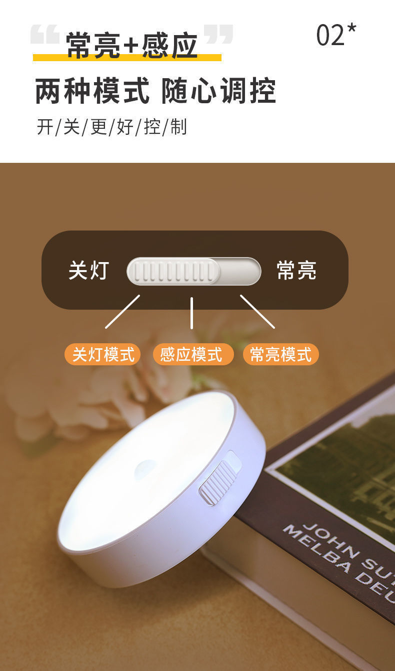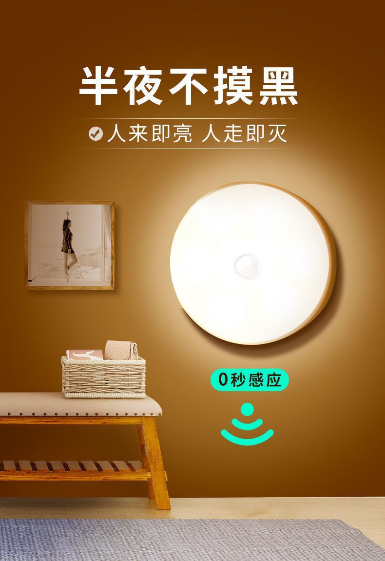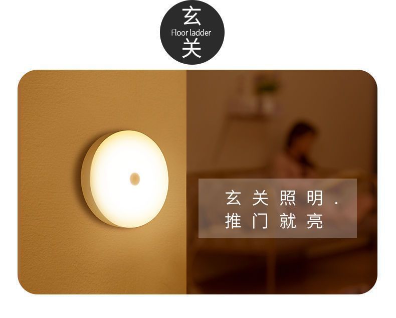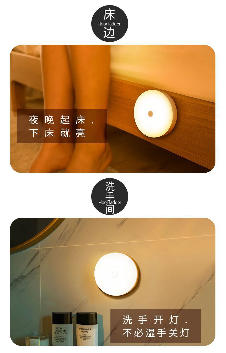 둥근 지능형 인체 센서 램프 머리맡 침실 캐비닛 계단 자동 조명 제어 자기 충전식 미니 야간 조명