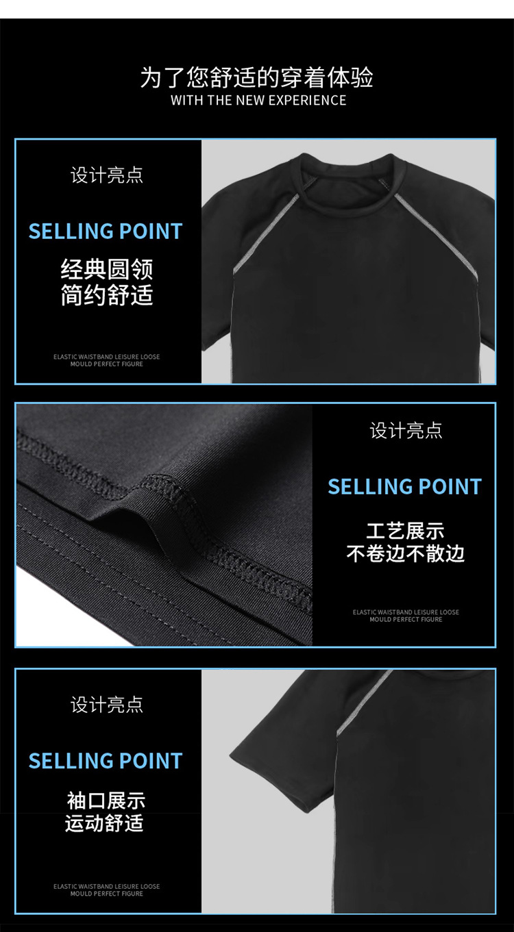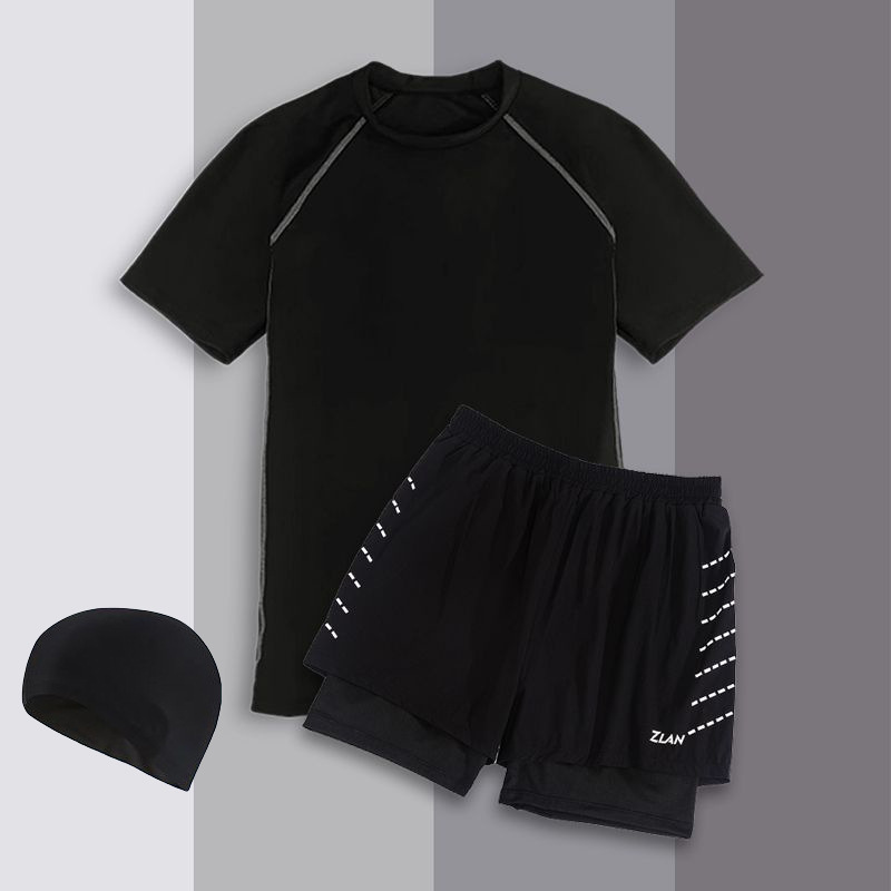 • 검정색 반팔 상의 + 더블 레이어 수영 트렁크 + 수영 모자