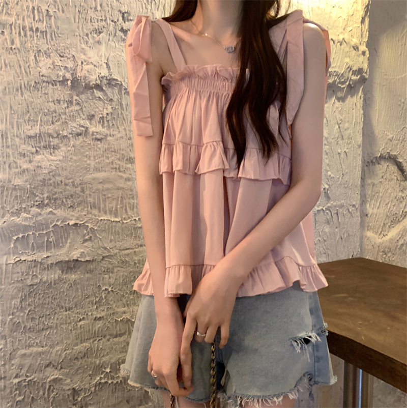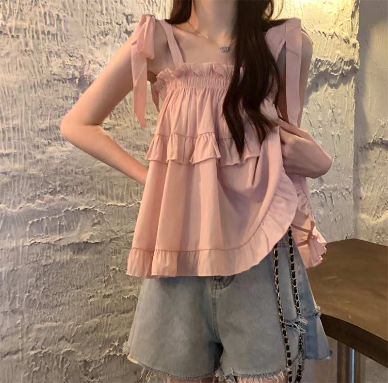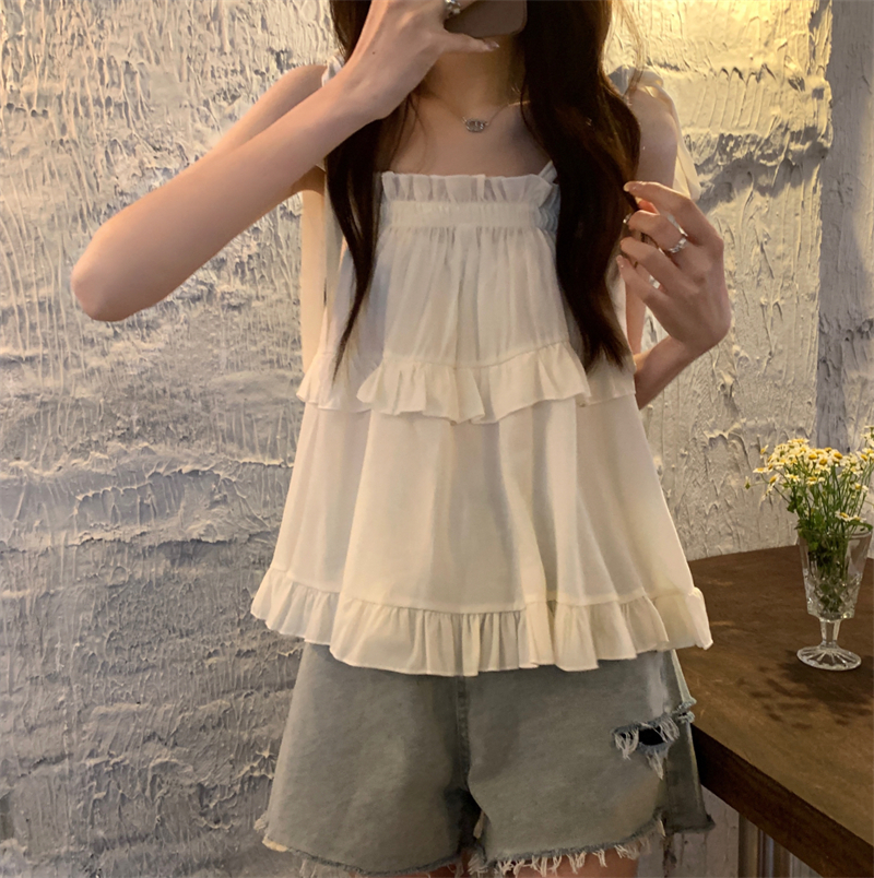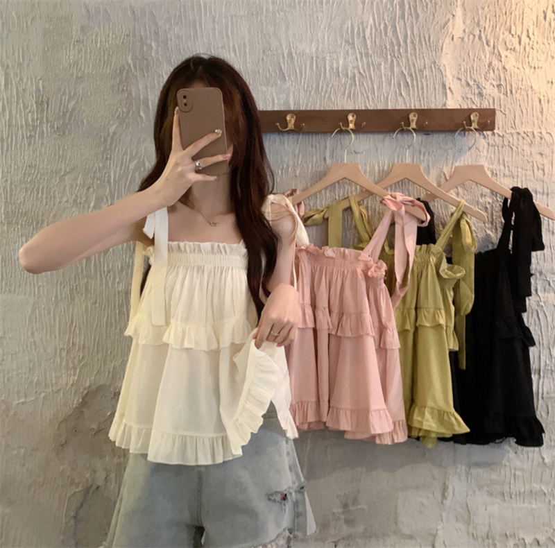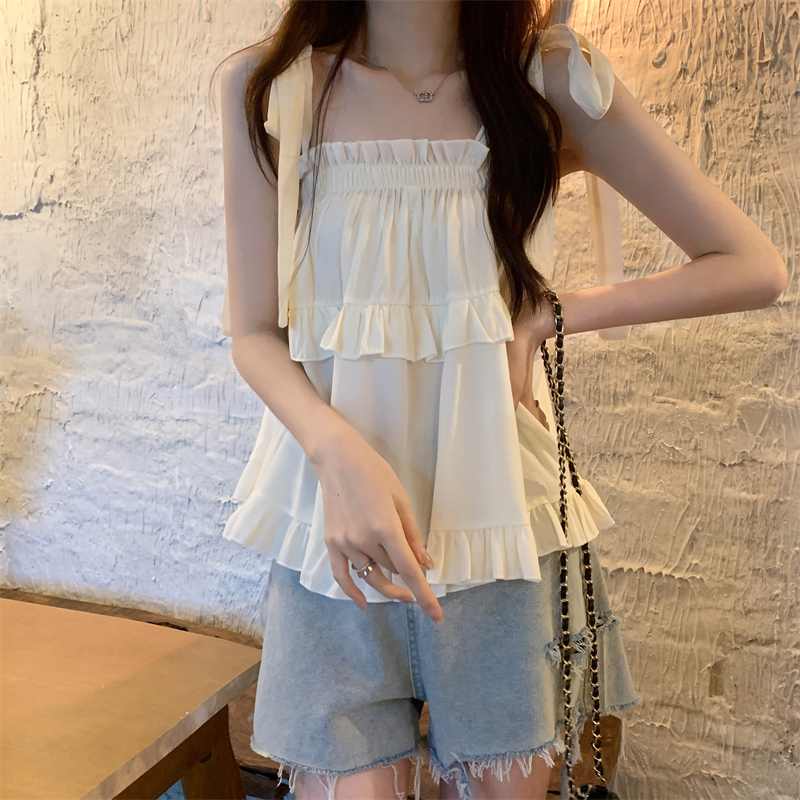 여름 디자인의 여성용 러플 레이스업 튜브탑 캐미솔 니치 스위트 베이비돌 민소매 쉬폰 탑스토어 가기