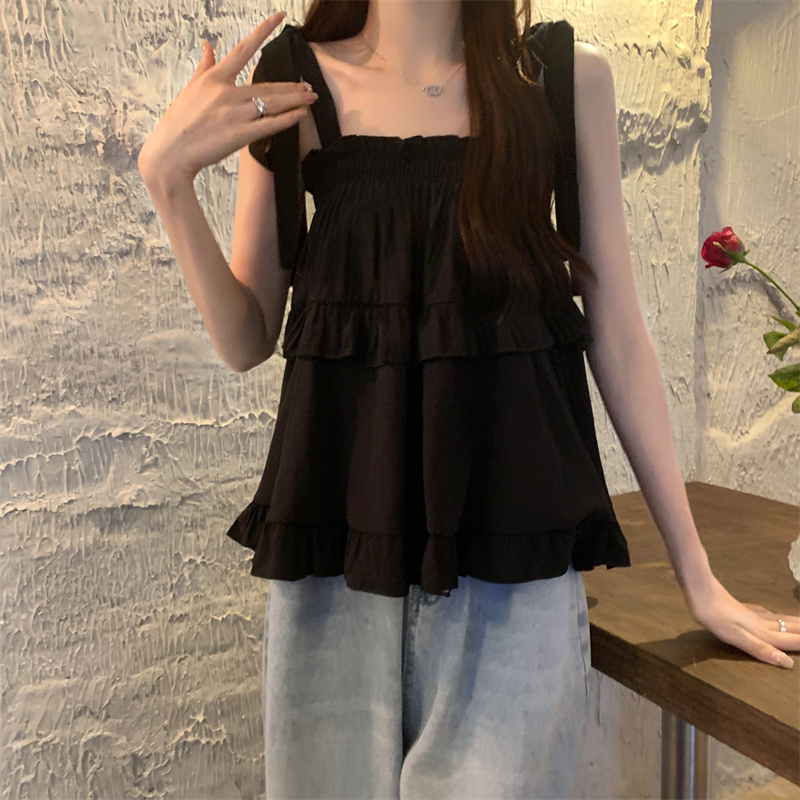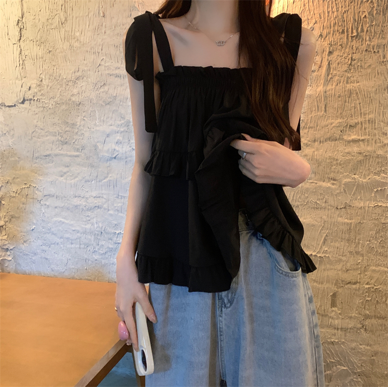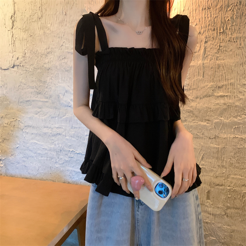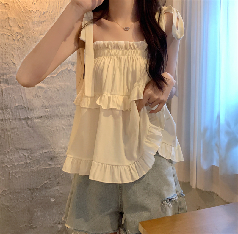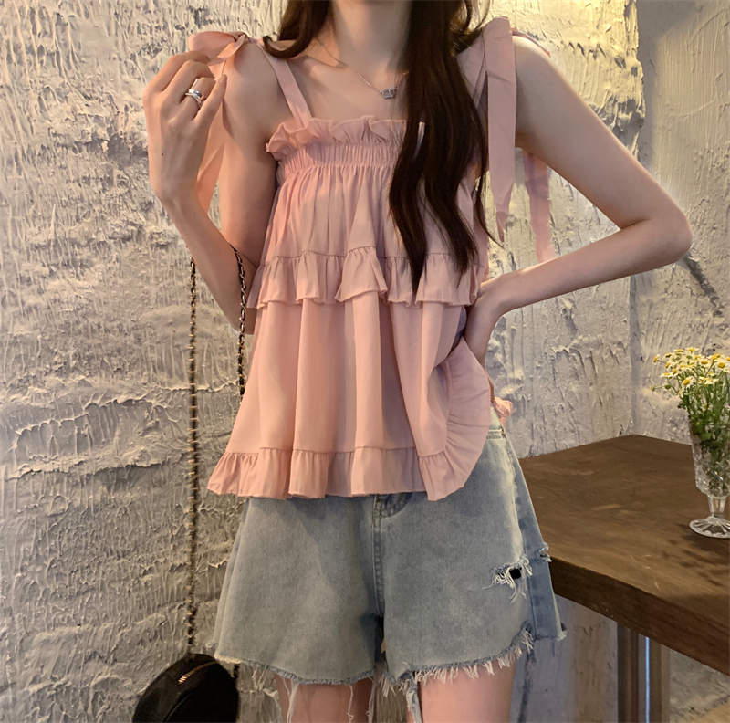 여름 디자인의 여성용 러플 레이스업 튜브탑 캐미솔 니치 스위트 베이비돌 민소매 쉬폰 탑스토어 가기