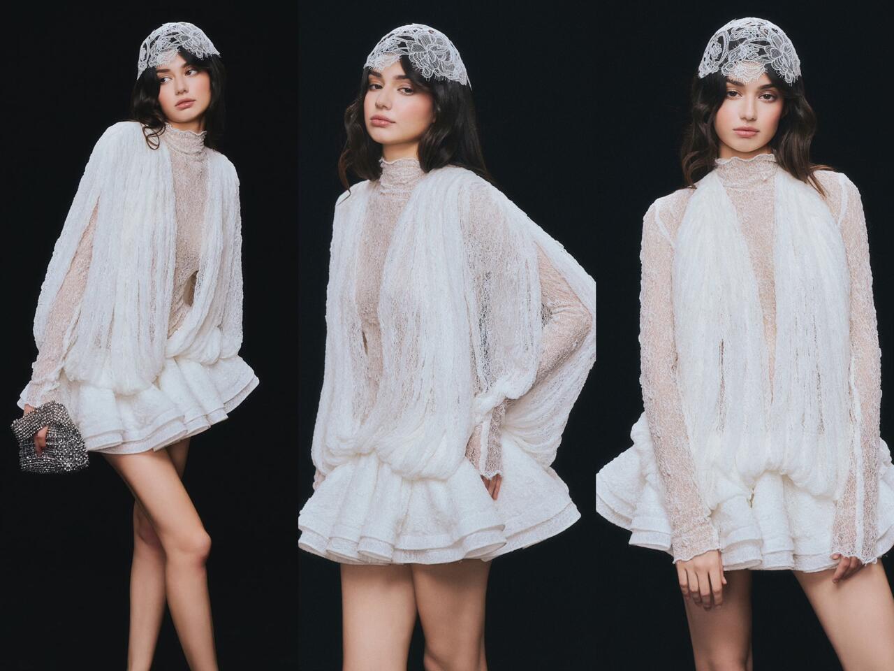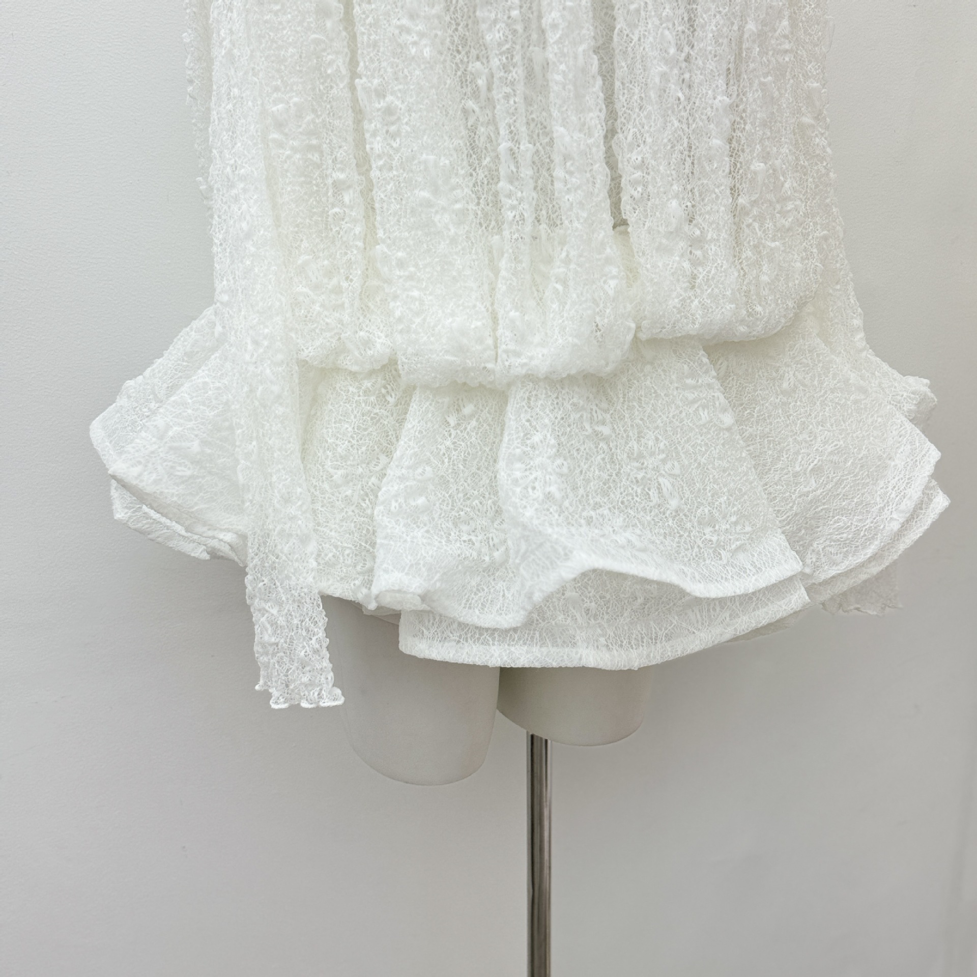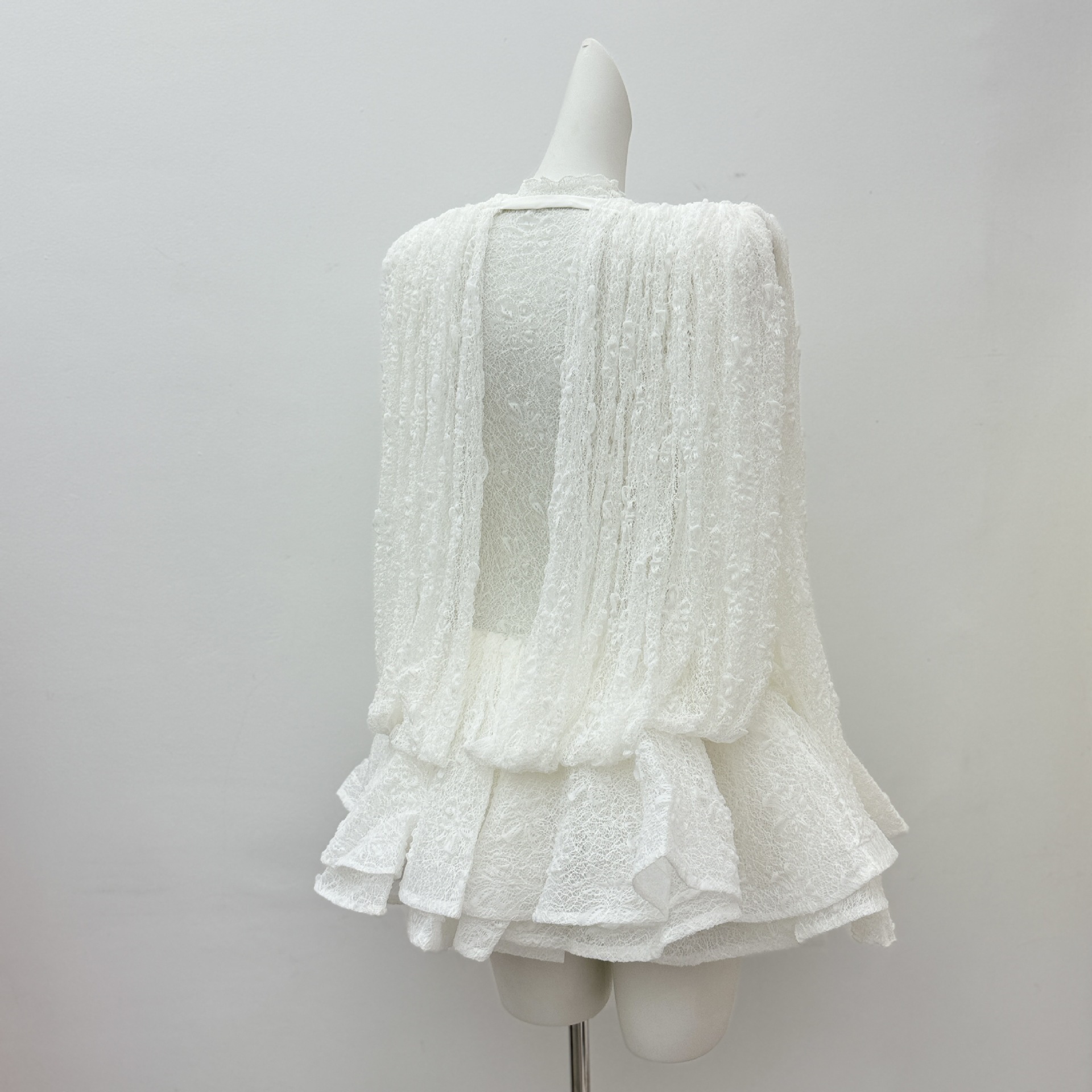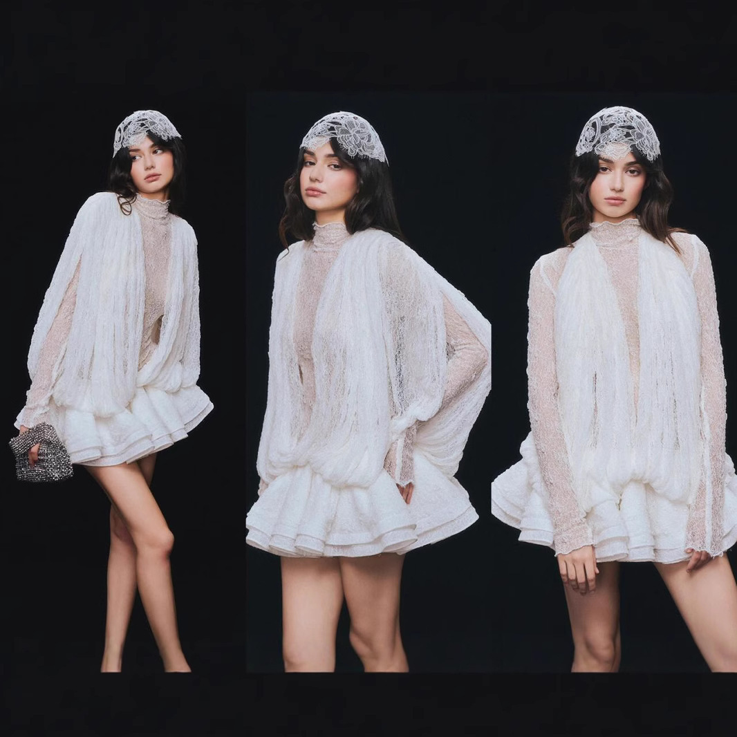 베트남의 독특한 스타일, 몽환적인 소용돌이 속에 빠져들다, 레이어드된 신축성 있는 허리밴드와 넓은 밑단의 투피스 화이트 레이스 드레스