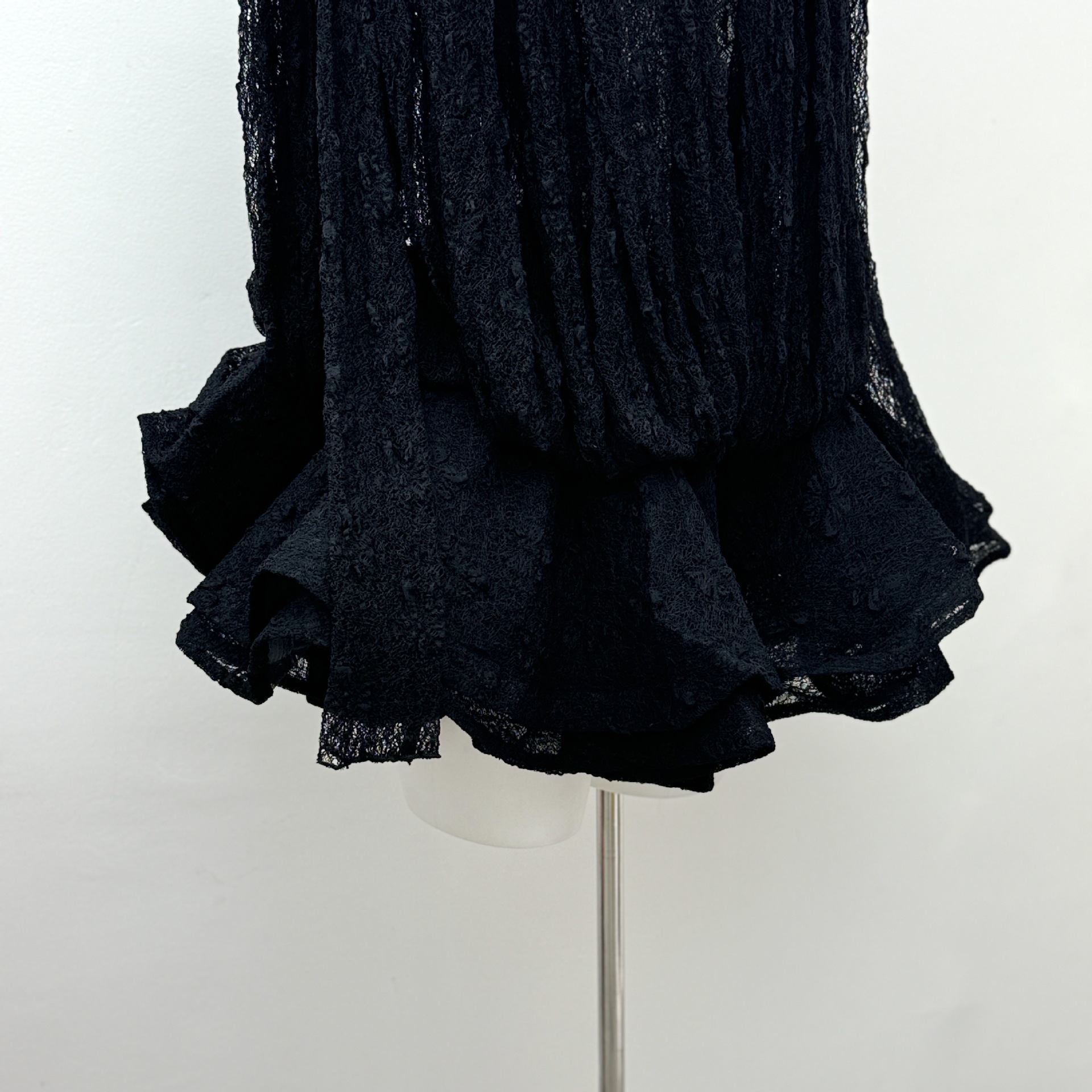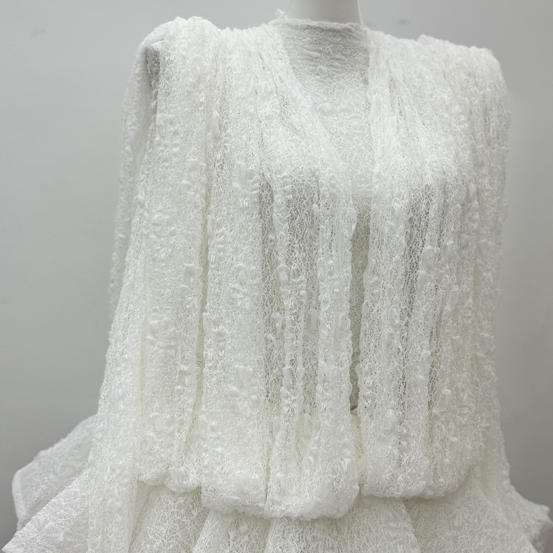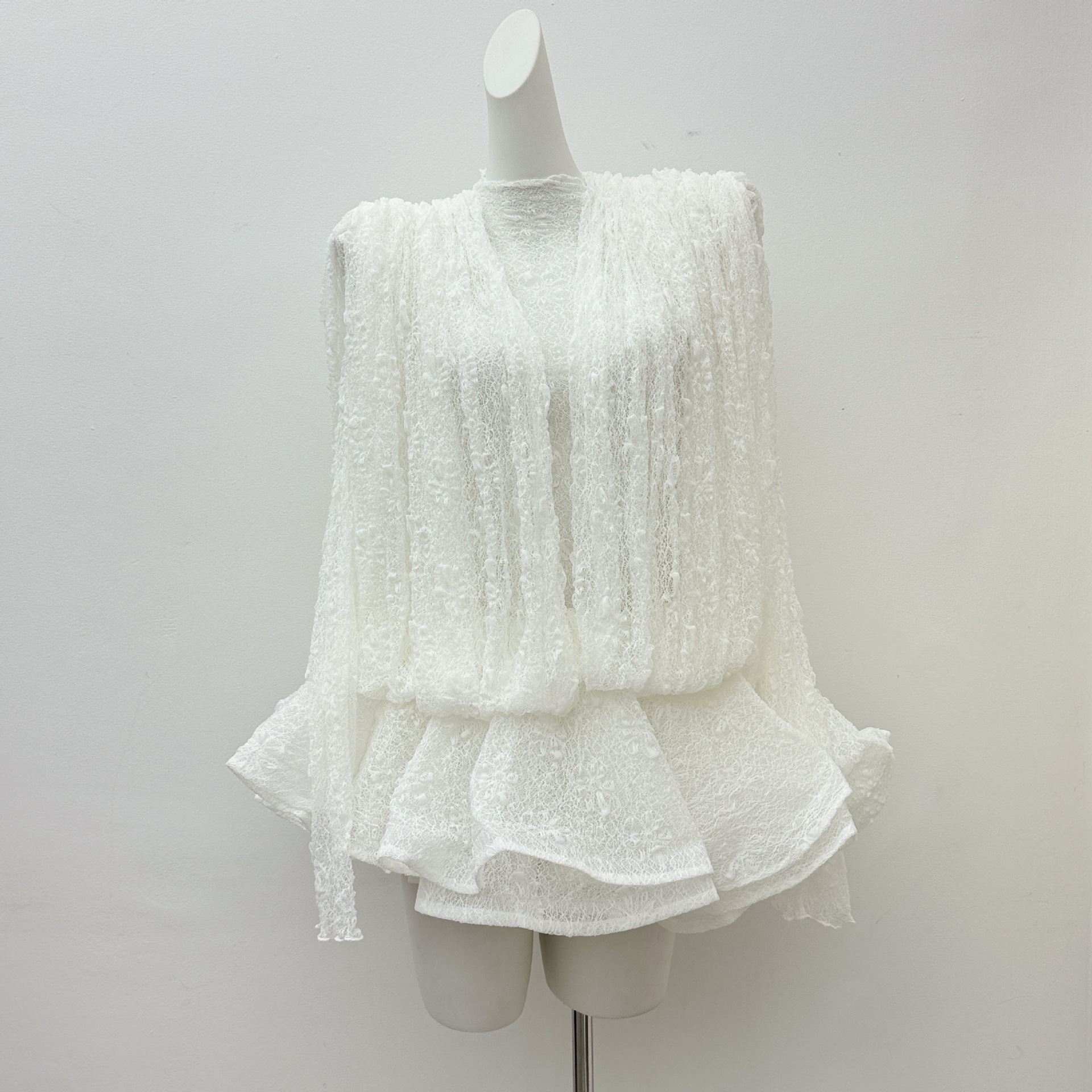 베트남의 독특한 스타일, 몽환적인 소용돌이 속에 빠져들다, 레이어드된 신축성 있는 허리밴드와 넓은 밑단의 투피스 화이트 레이스 드레스