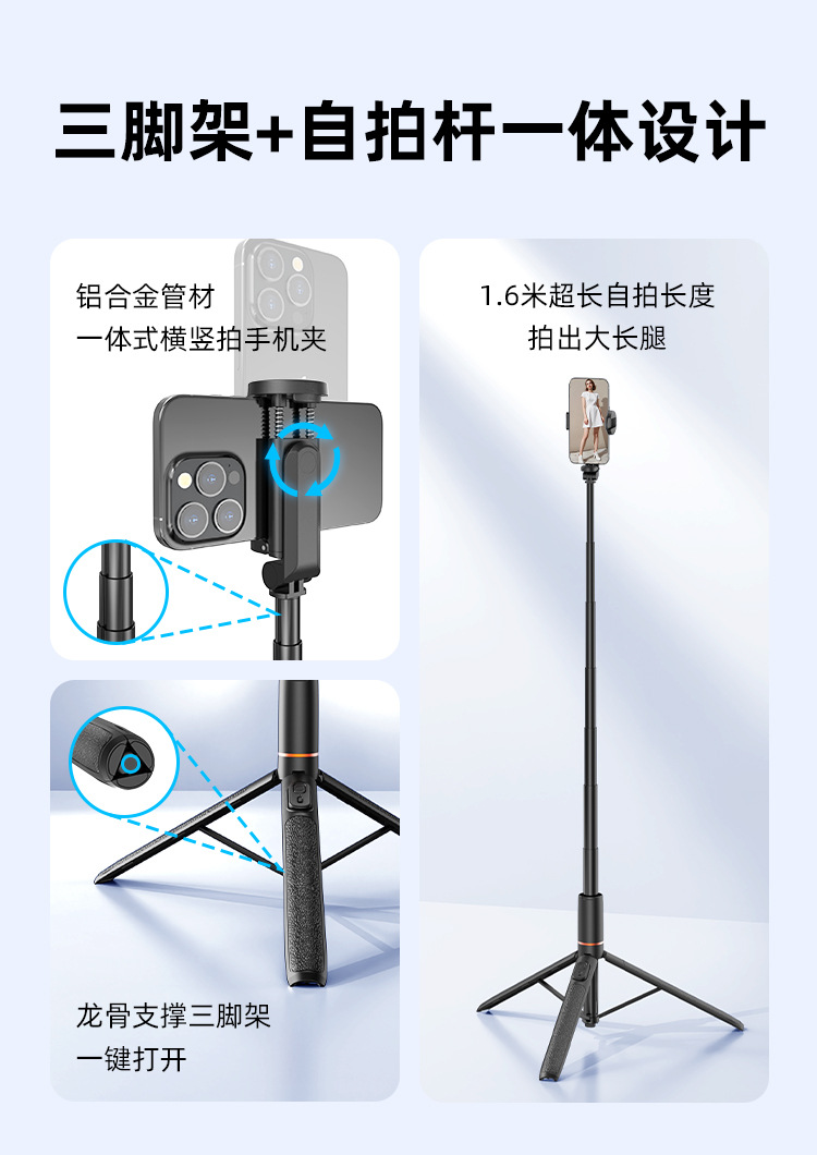 1.6m 스마트 올인원 고급형 확장형 수평 및 수직 전환 휴대폰 셀카봉 온라인 수업 라이브 방송 삼각대