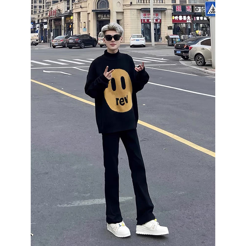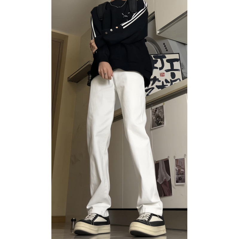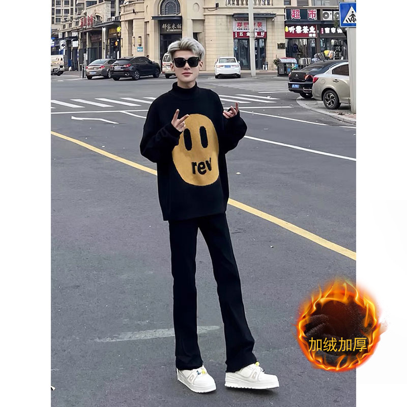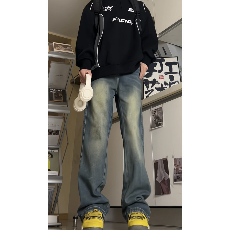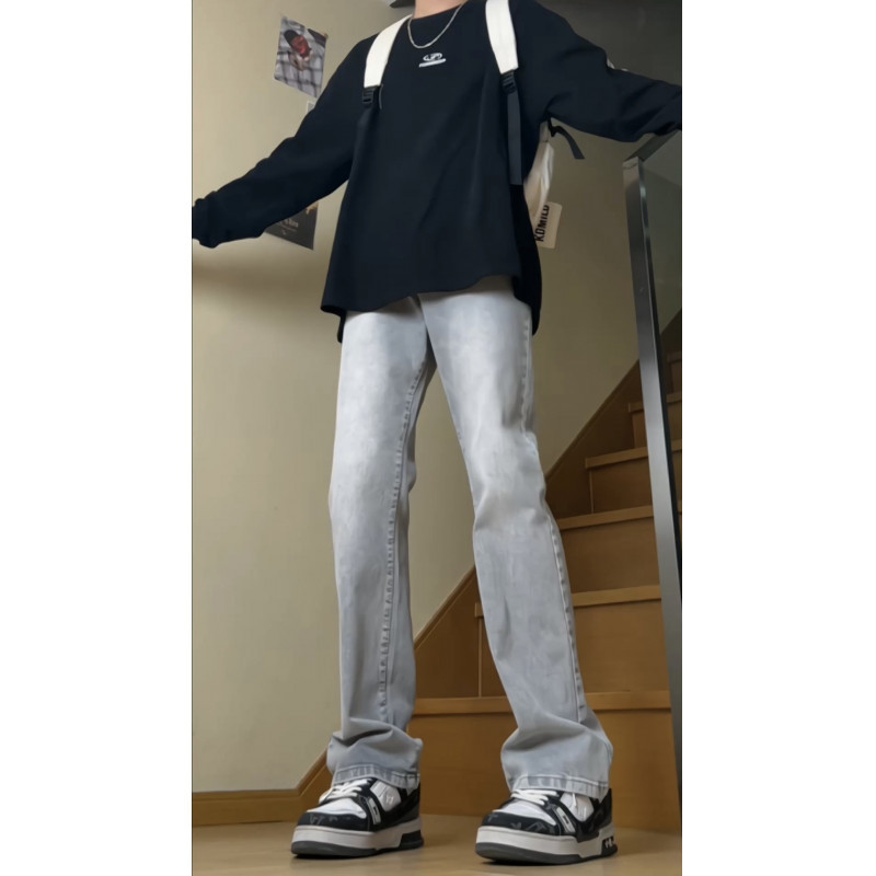 아메리칸 하이 스트리트 워싱 디스트레스드 레트로 마이크로 플레어 청바지 남성용 불꽃 잔상 프린트 슬리밍 바닥 길이 바지스토어 가기