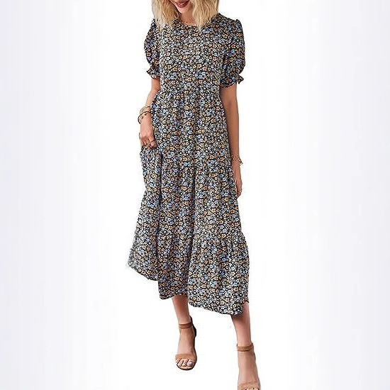 2025 Amazon 여성 여름 캐주얼 보헤미안 꽃 프린트 플리츠 버블 반소매 드레스