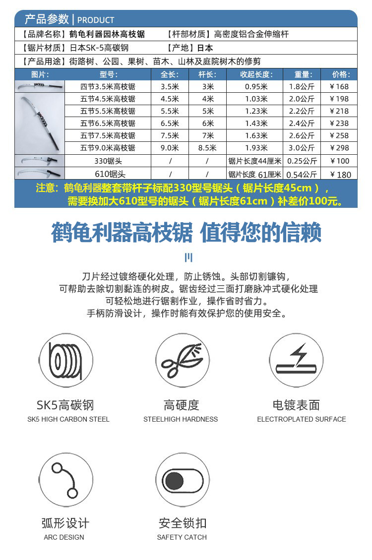 일본 오리지널 수입 크레인 거북이 블레이드 고지점 톱 텔레스코픽 막대 고공 톱 정원 과일 나무 톱 나무 톱 사가와 요시