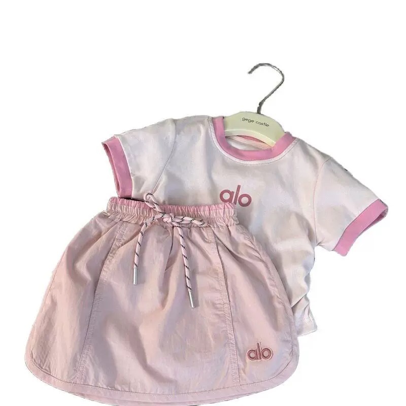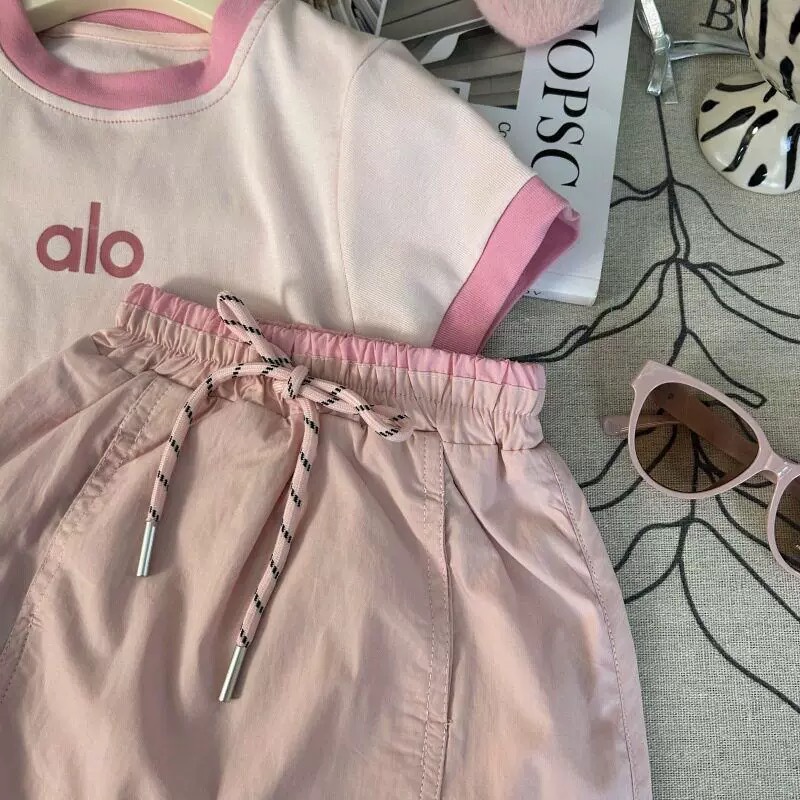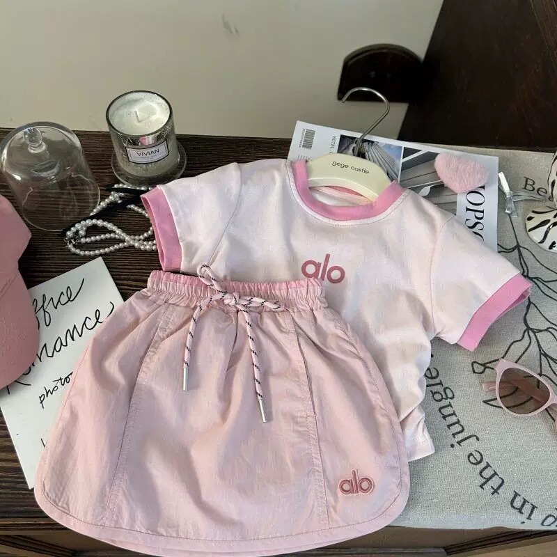 한국 아동복 2025 신상 여름 여아 컬러 블록 레터 반팔 티셔츠 아동용 핑크 치마바지 투피스 세트 트렌디