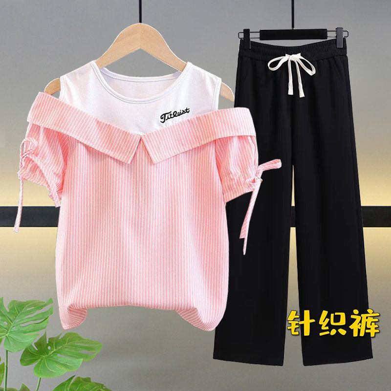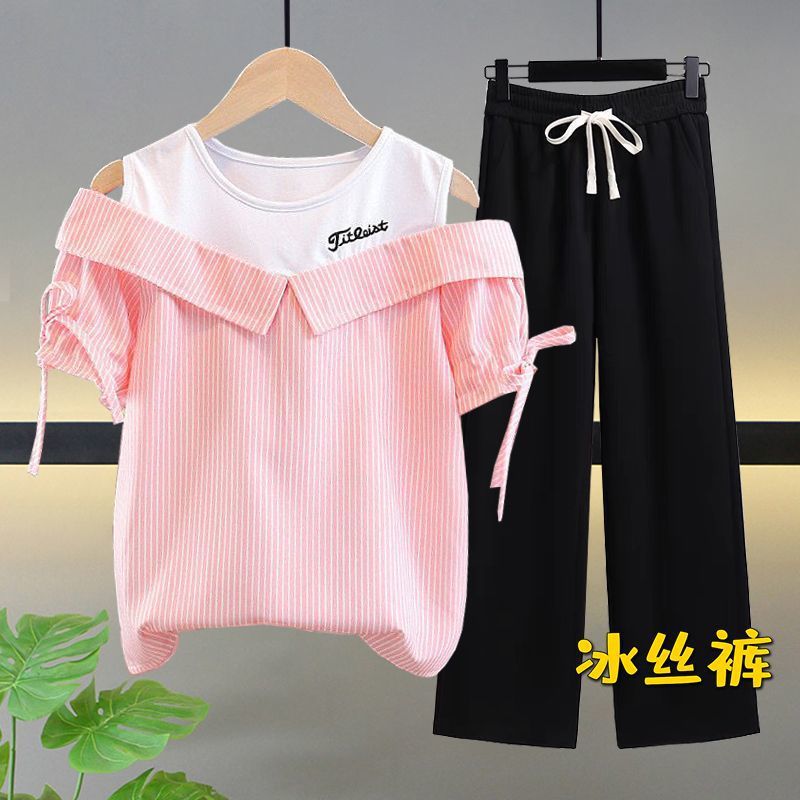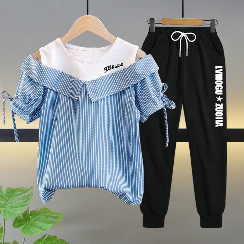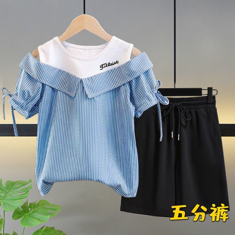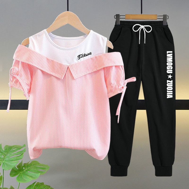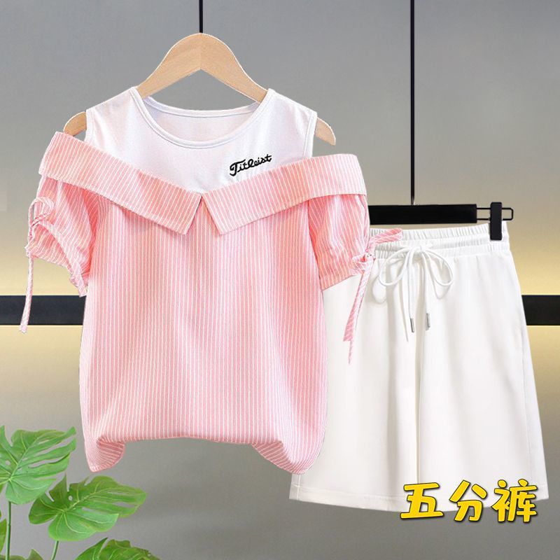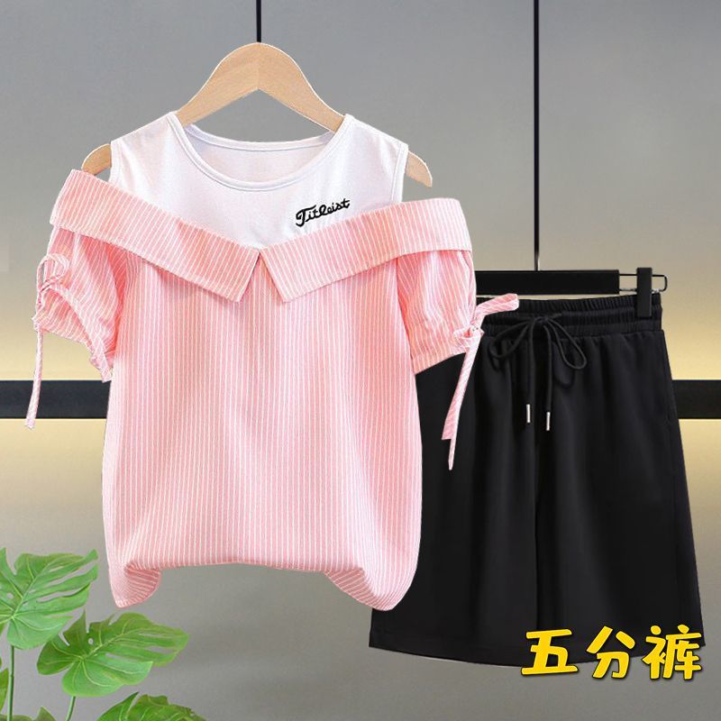 여자 여름 싱글/슈트 2025 새로운 중대형 아동 반팔 티셔츠 학생 여자 한국 스타일 캐주얼 스포츠 투피스 세트
