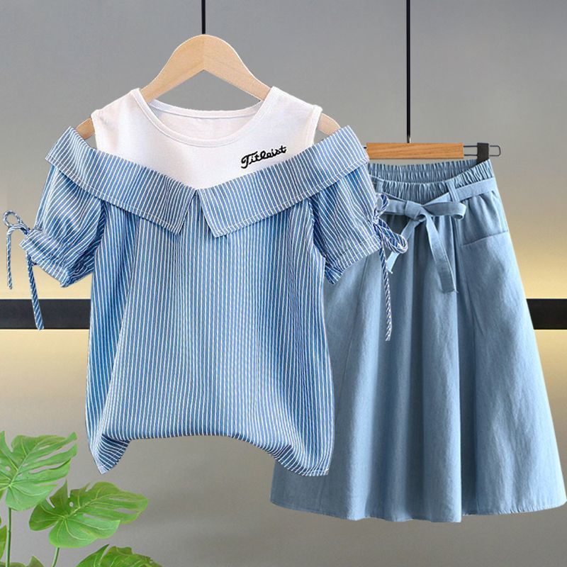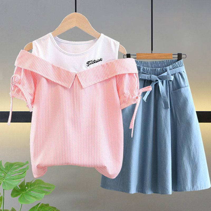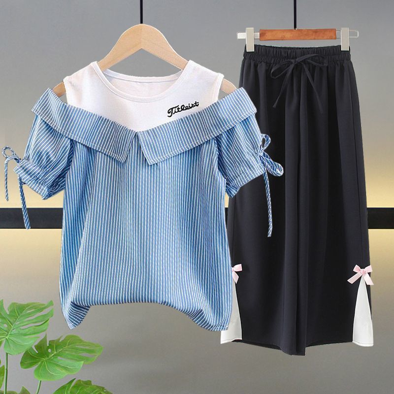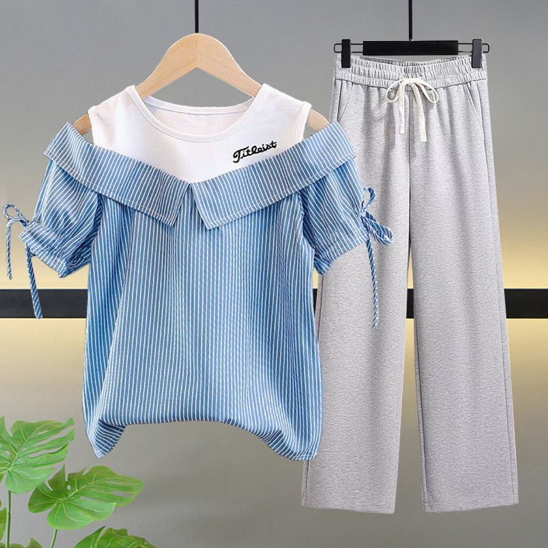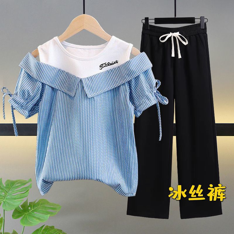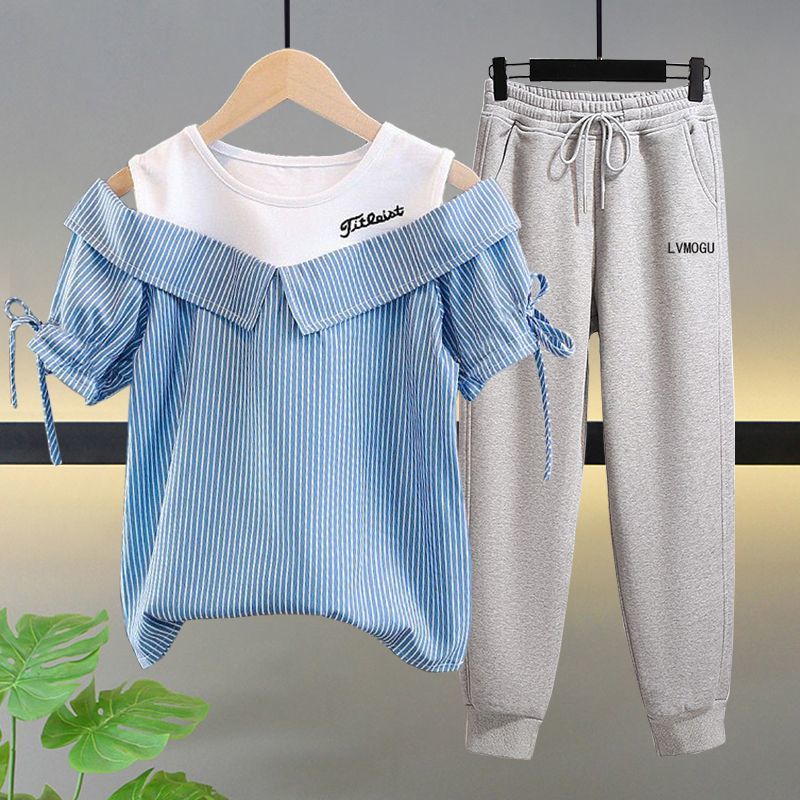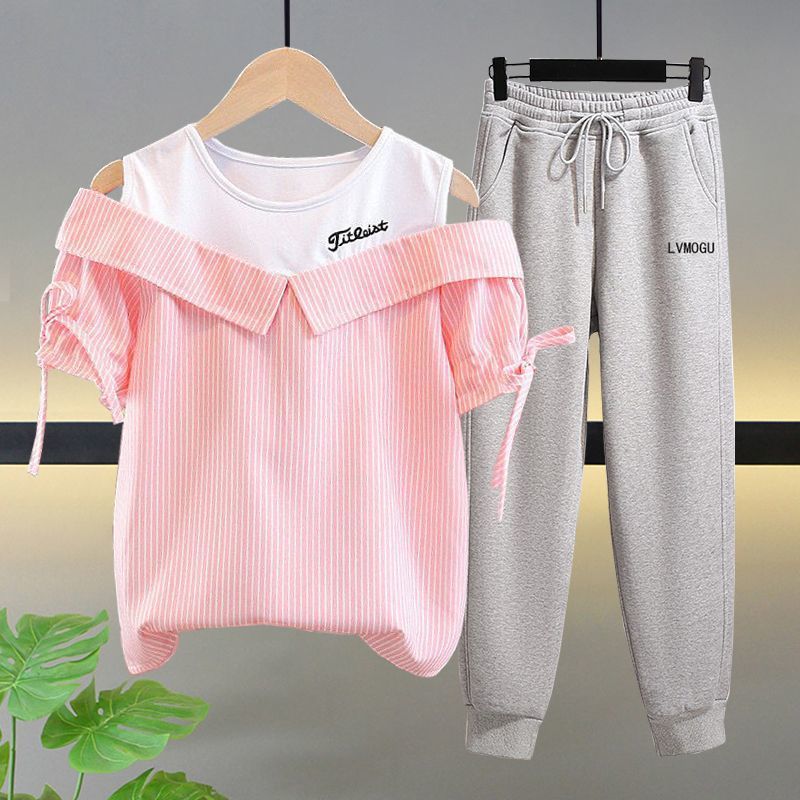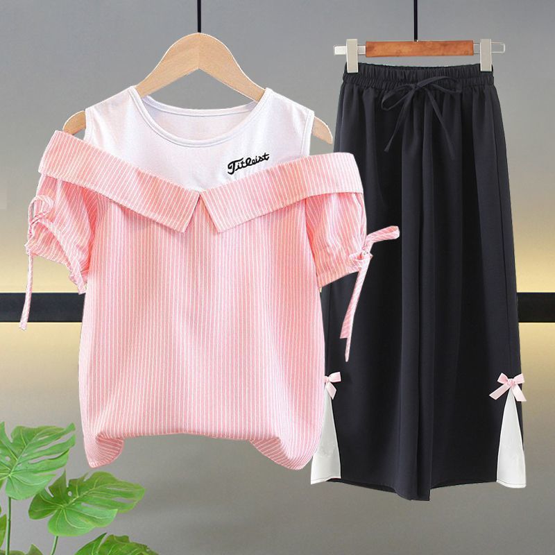 여자 여름 싱글/슈트 2025 새로운 중대형 아동 반팔 티셔츠 학생 여자 한국 스타일 캐주얼 스포츠 투피스 세트