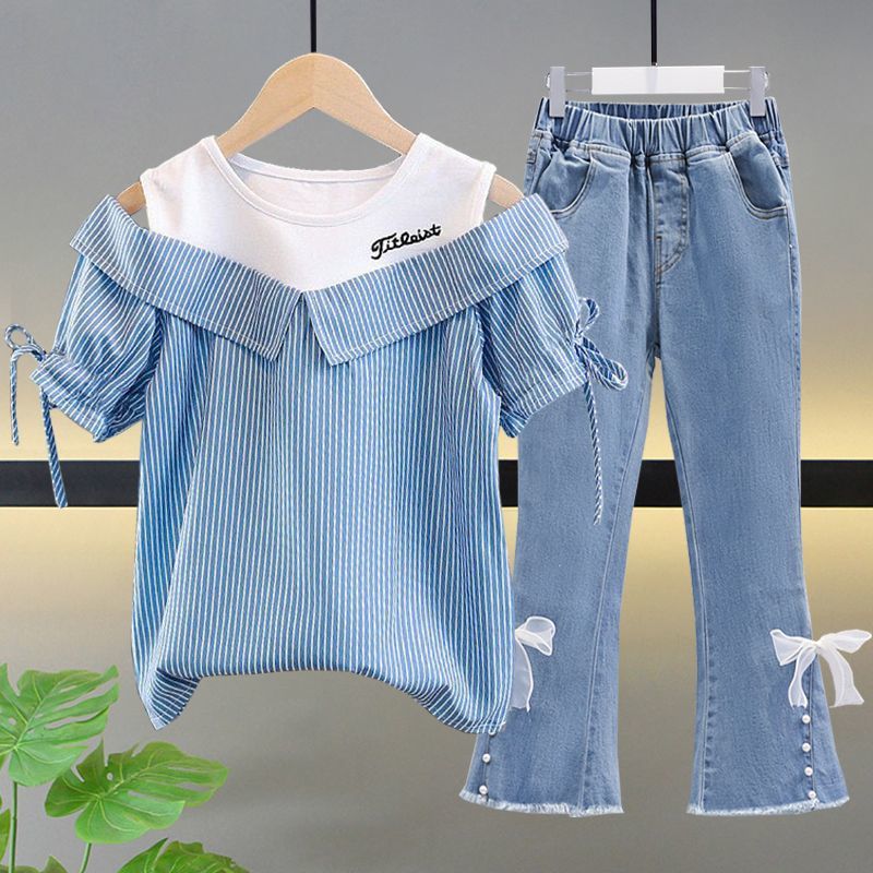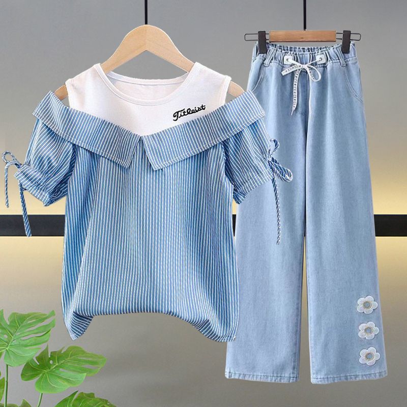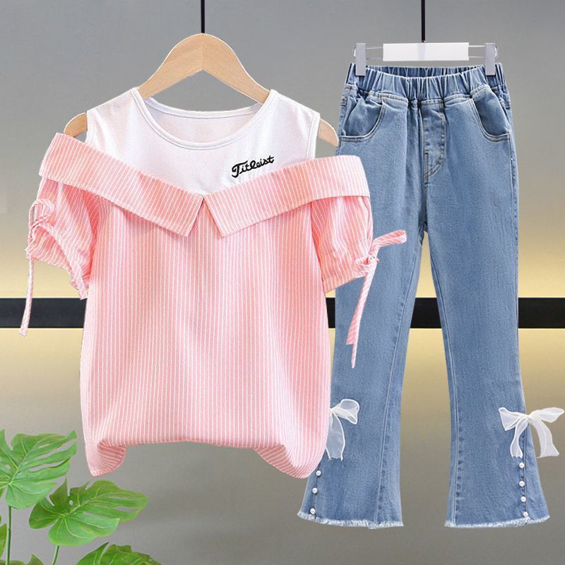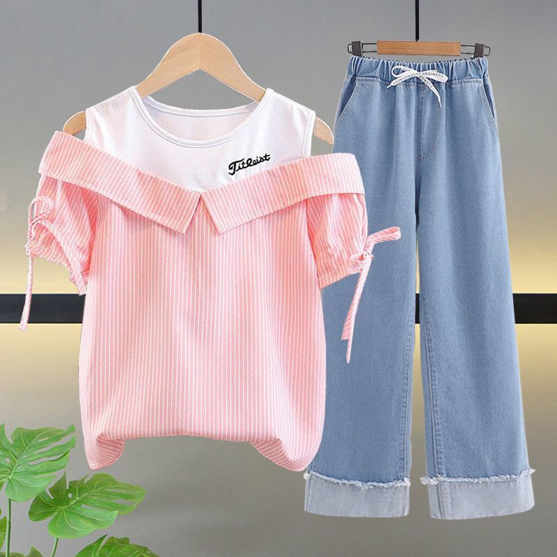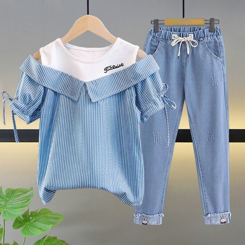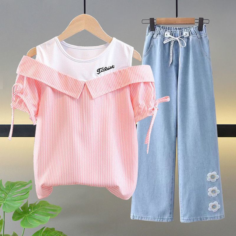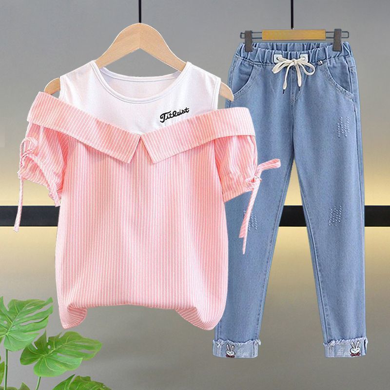 여자 여름 싱글/슈트 2025 새로운 중대형 아동 반팔 티셔츠 학생 여자 한국 스타일 캐주얼 스포츠 투피스 세트