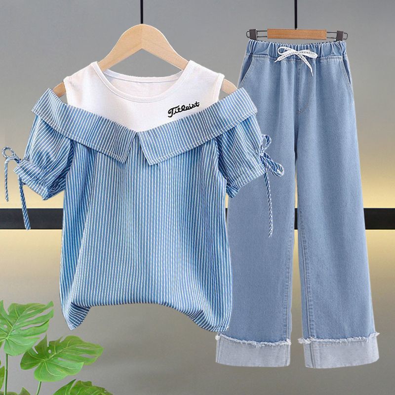 여자 여름 싱글/슈트 2025 새로운 중대형 아동 반팔 티셔츠 학생 여자 한국 스타일 캐주얼 스포츠 투피스 세트스토어 가기