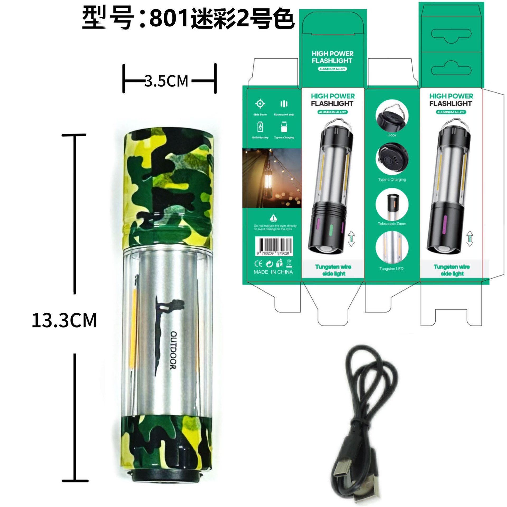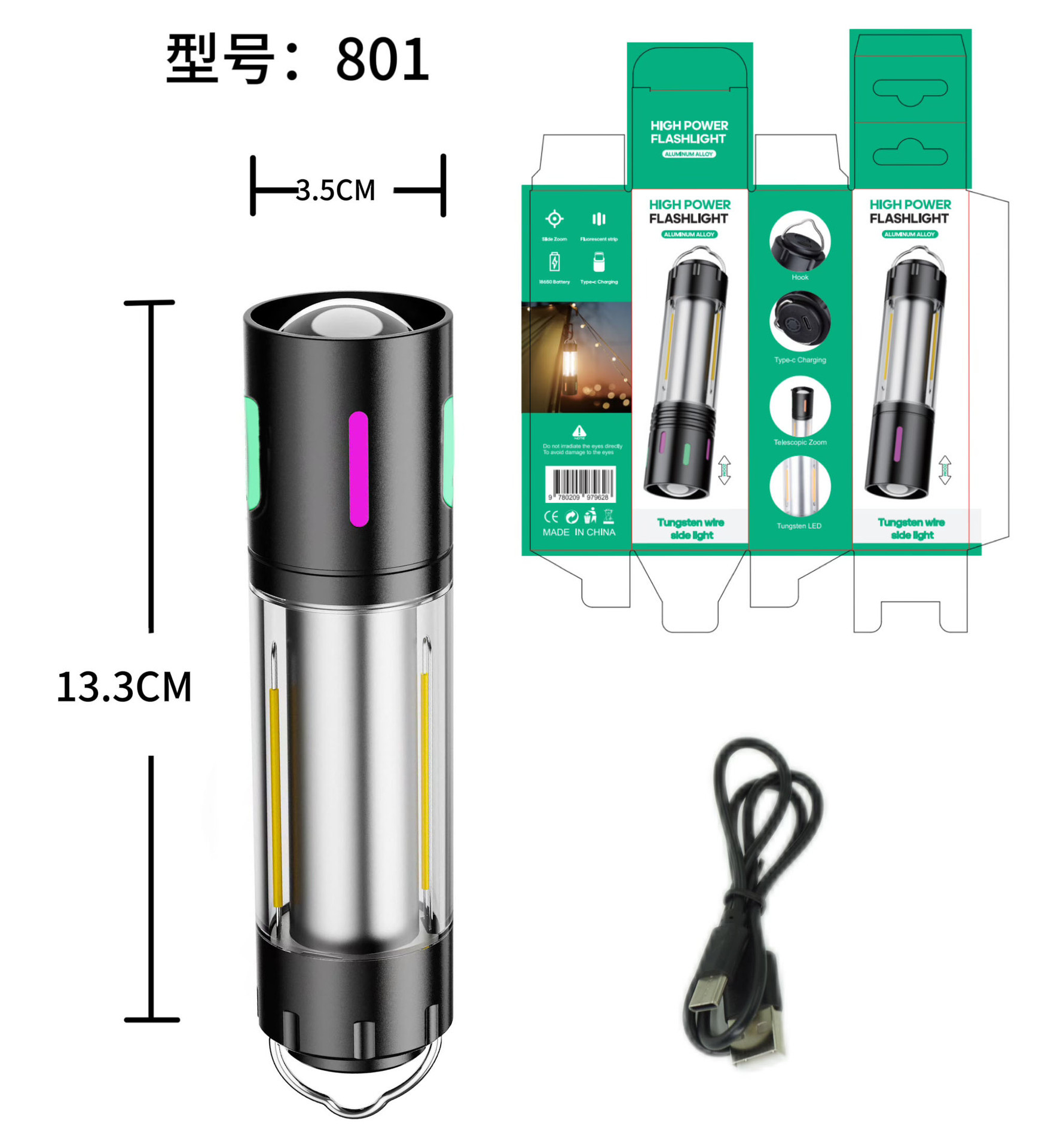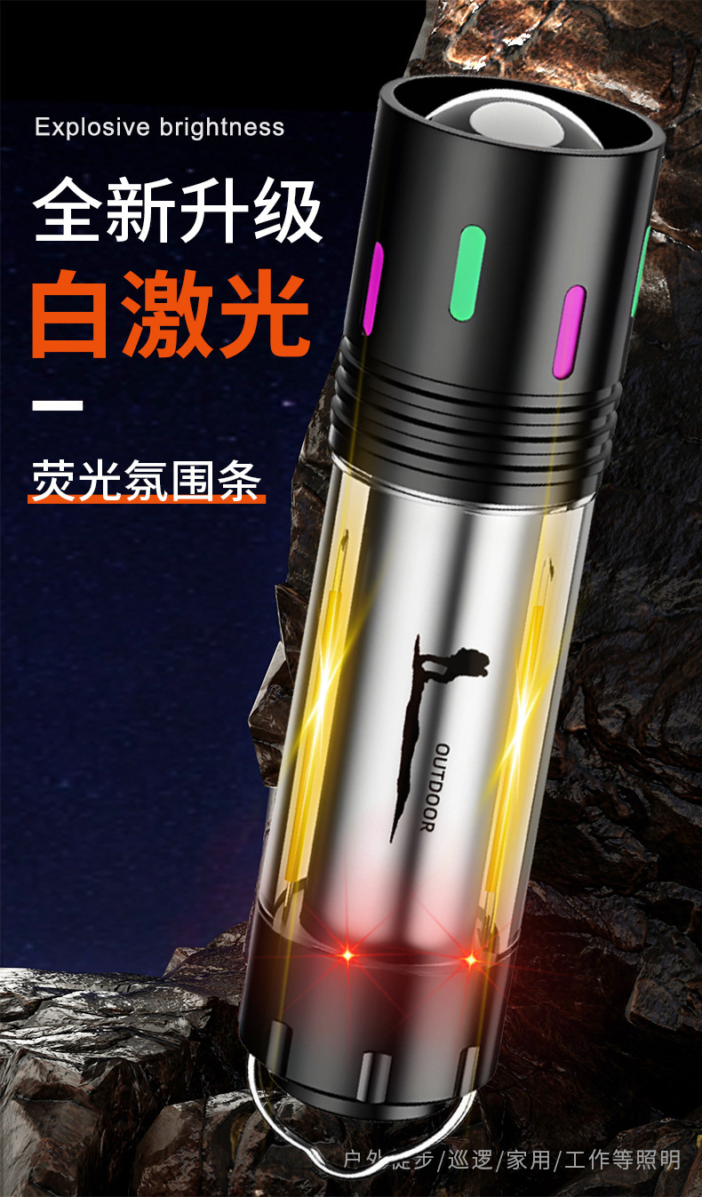 • 801 형광색 단순(줌 백색 레이저 손전등 + type-c 라인 + 중간 빨간색 및 노란색 분위기 + 색상 상자)