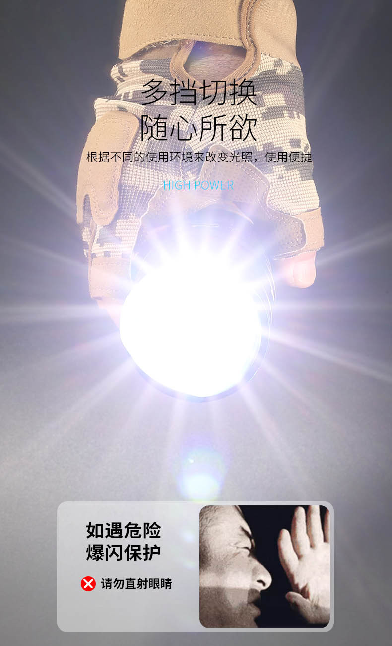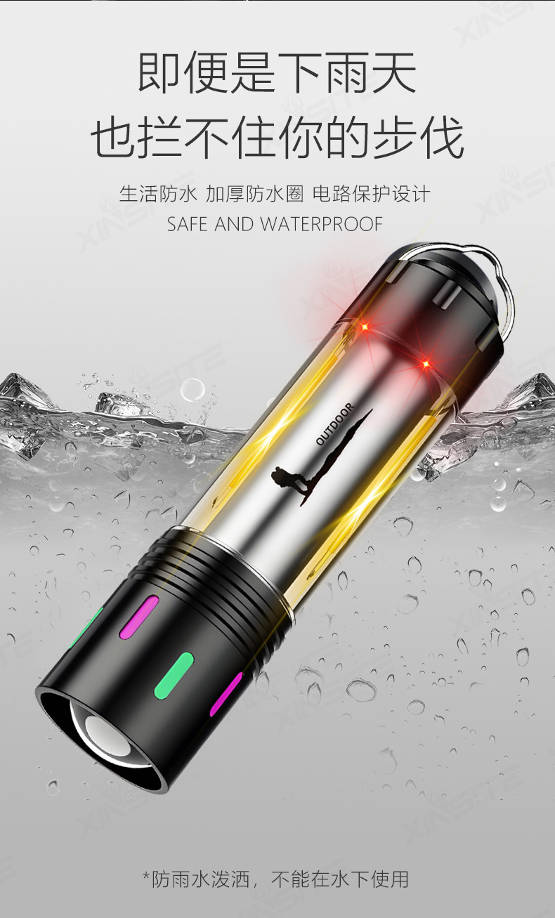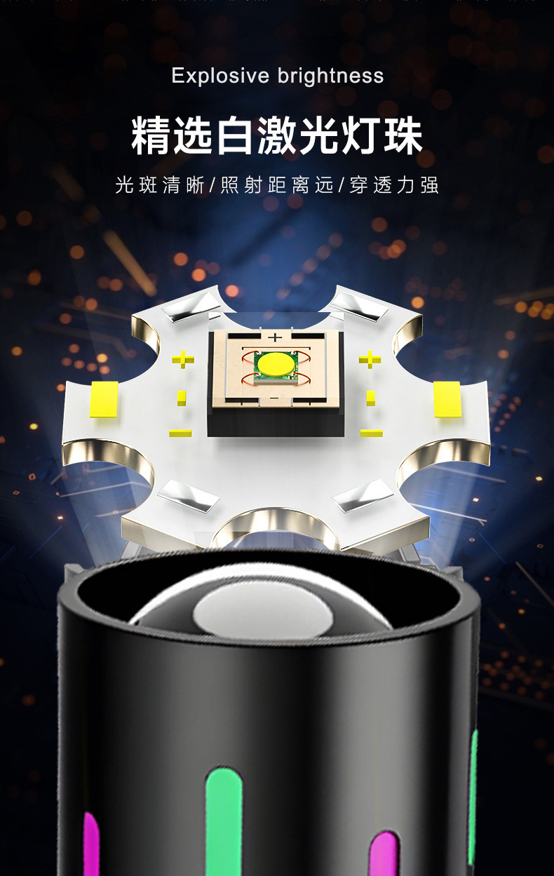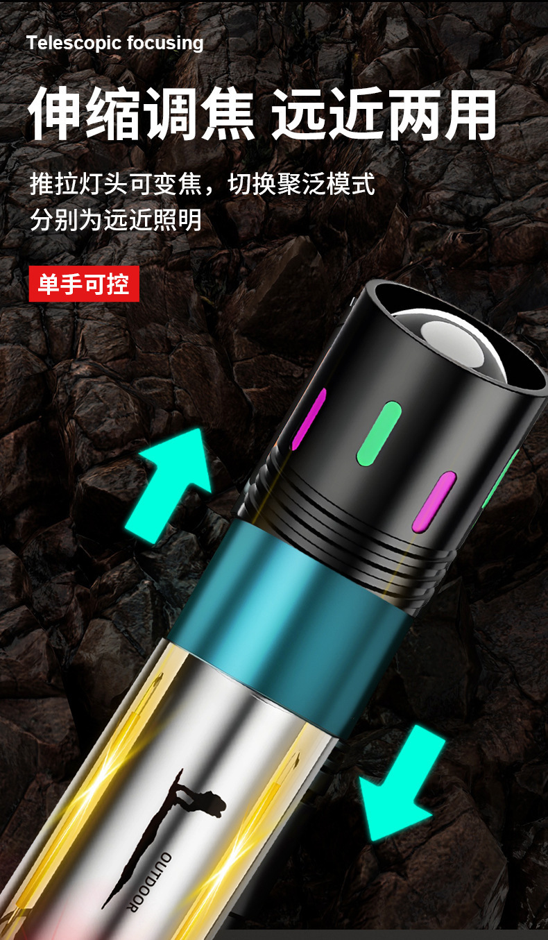 • 801 형광색 단순(줌 백색 레이저 손전등 + type-c 라인 + 중간 빨간색 및 노란색 분위기 + 색상 상자)