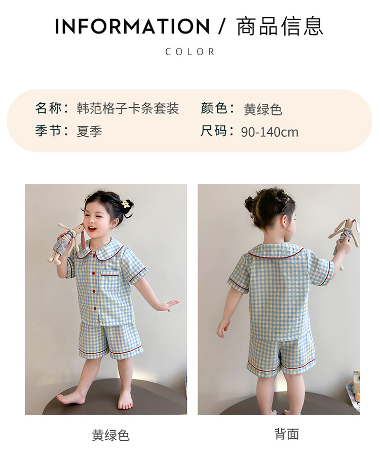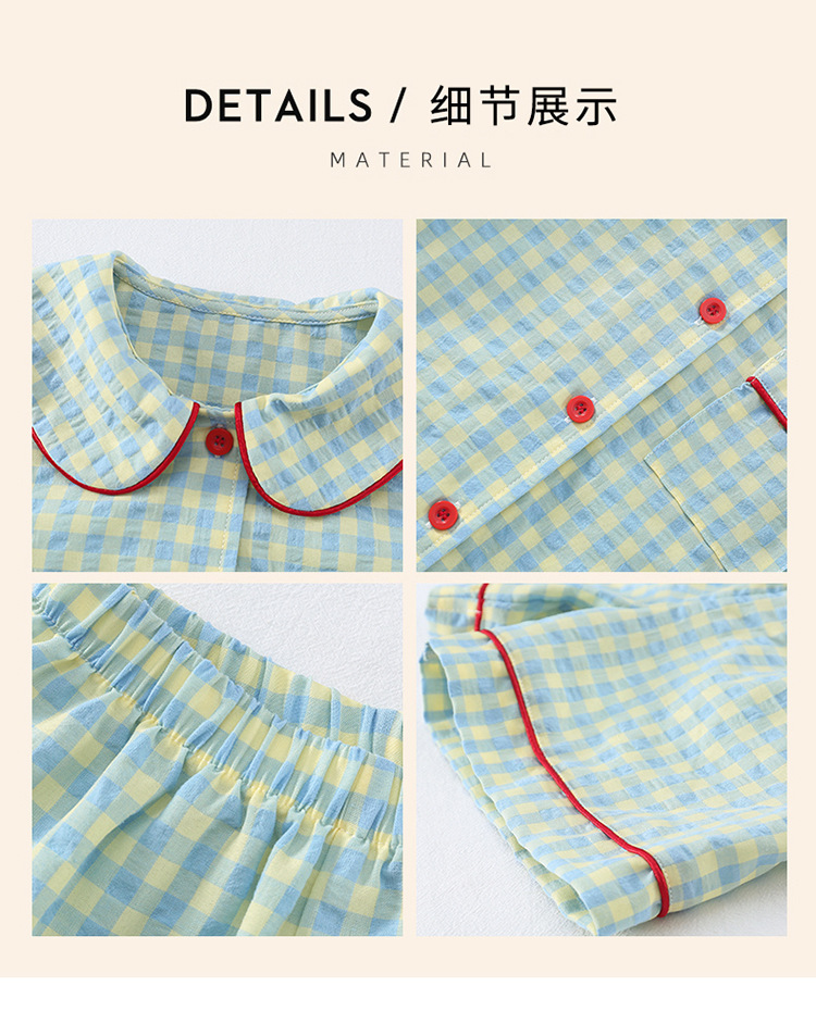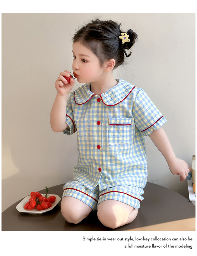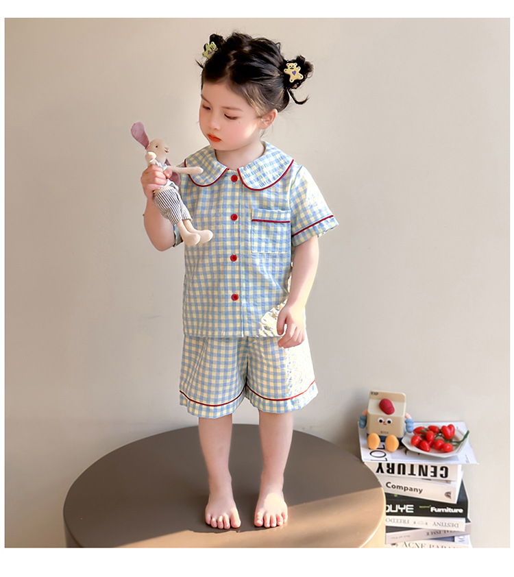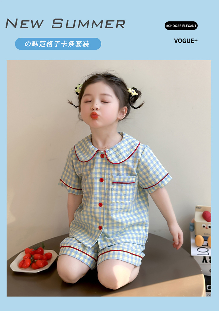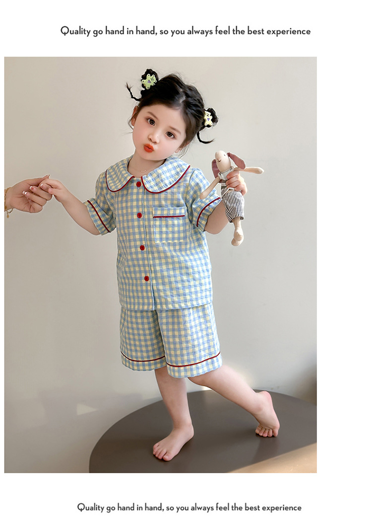 여자 격자 무늬 잠옷 여름 가정 의류 세트 2025 새로운 면화 아기 소녀 얇은 카디건 어린이 에어컨 옷스토어 가기