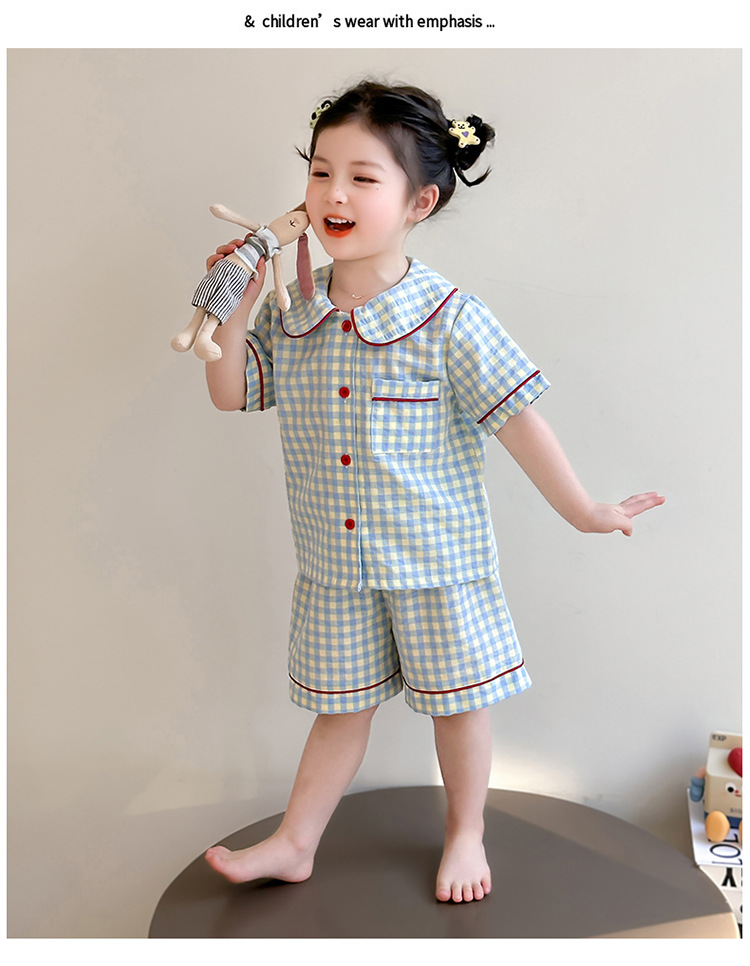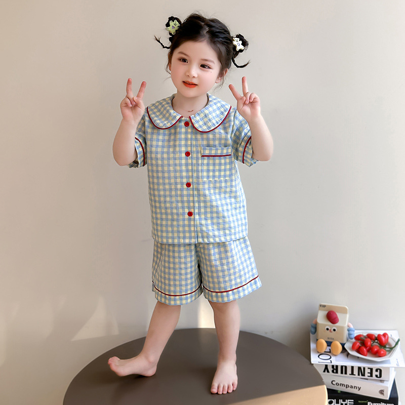 여자 격자 무늬 잠옷 여름 가정 의류 세트 2025 새로운 면화 아기 소녀 얇은 카디건 어린이 에어컨 옷