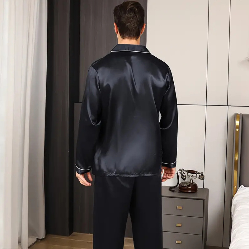 남성용 모조 실크 잠옷, 여름 긴팔 바지, 한국식 남성용 가정복, 단색 카디건 라펠 잠옷, 2피스스토어 가기
