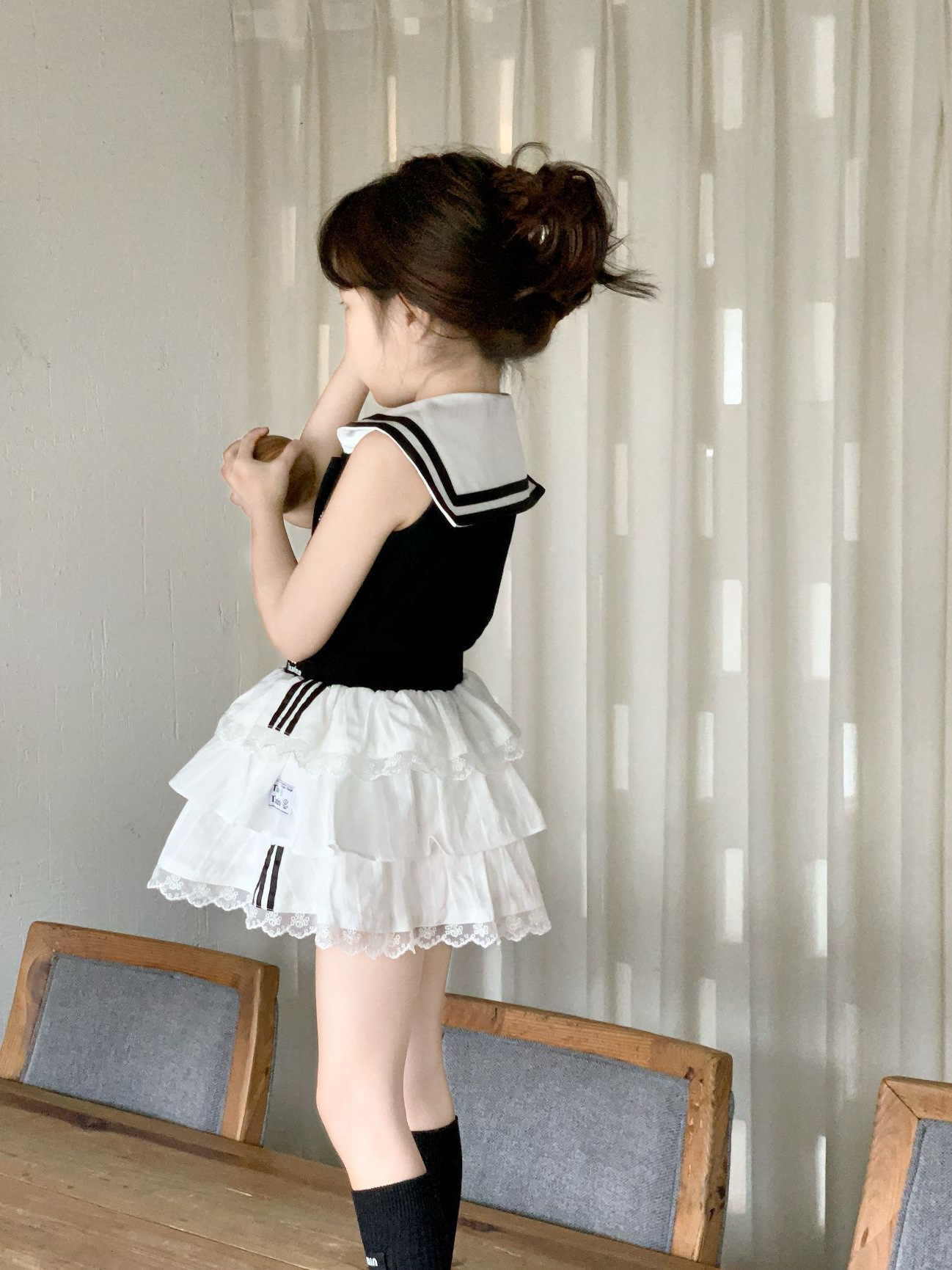 2025 새로운 여름 한국 스타일 아동 의류 소녀 대학 스타일 네이비 칼라 민소매 탑 레이스 스커트