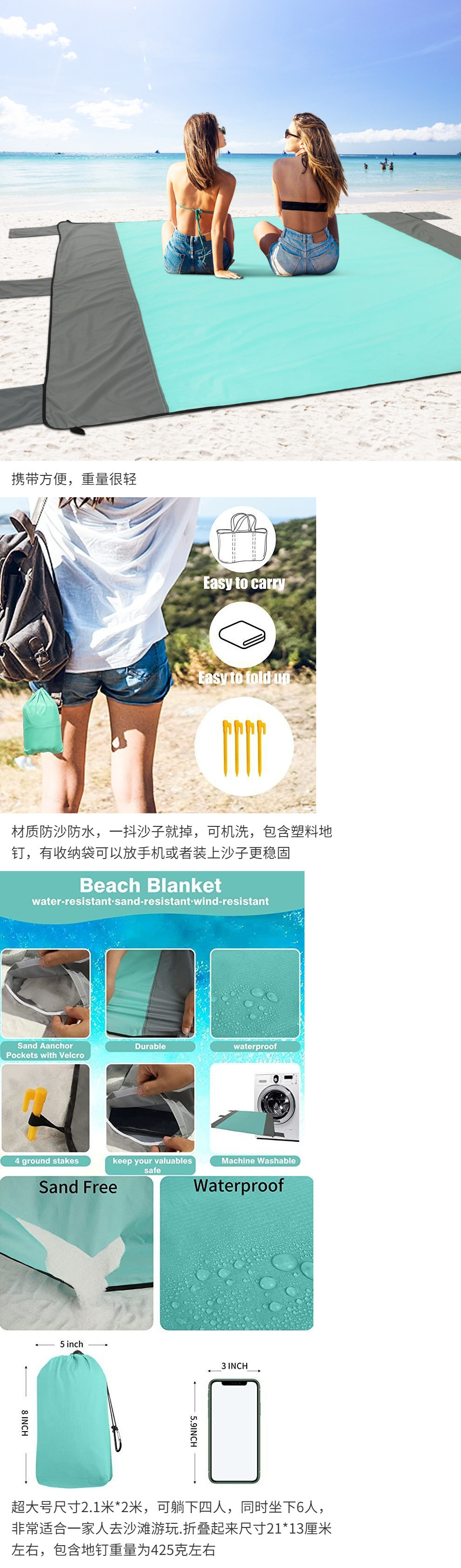 대형 2* 2.1m 야외 해변 매트, 방수 및 모래 방지, 휴대 가능, 피크닉 매트로 사용 가능, 기계 세탁 가능, 접이식 및 초경량