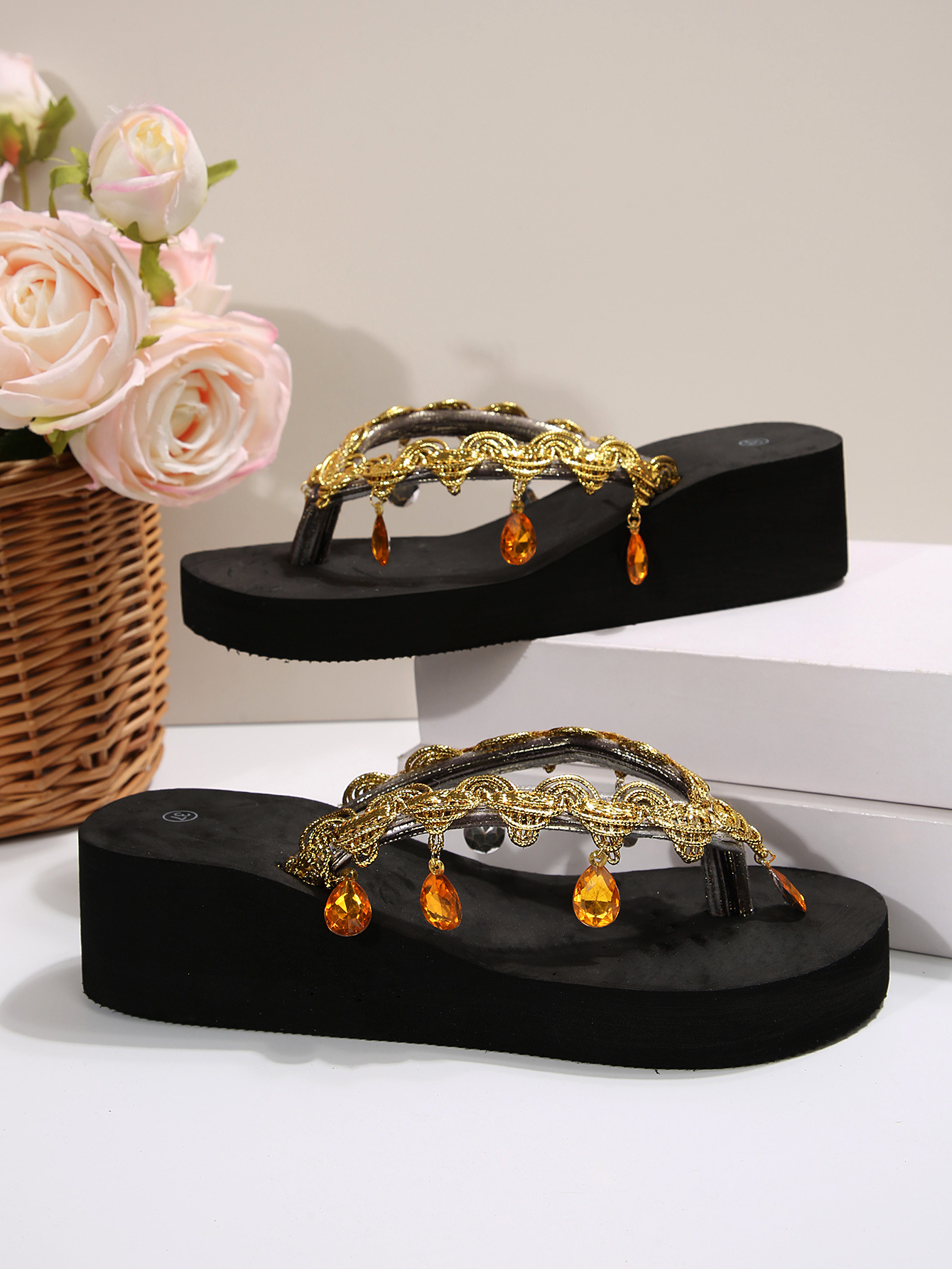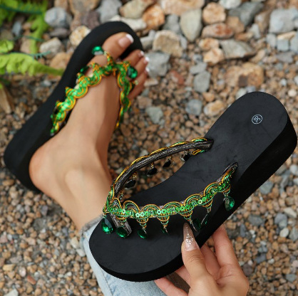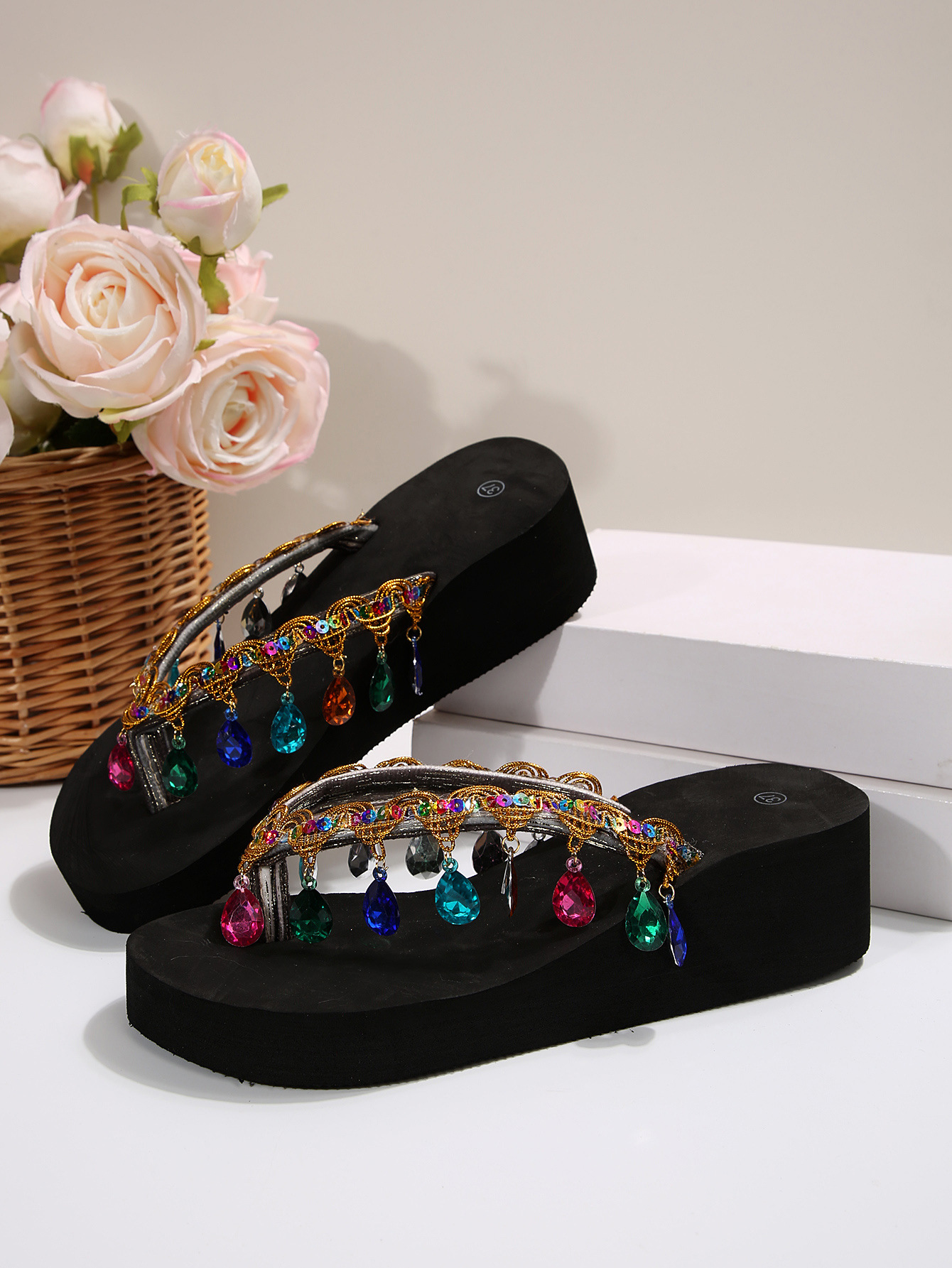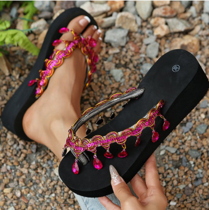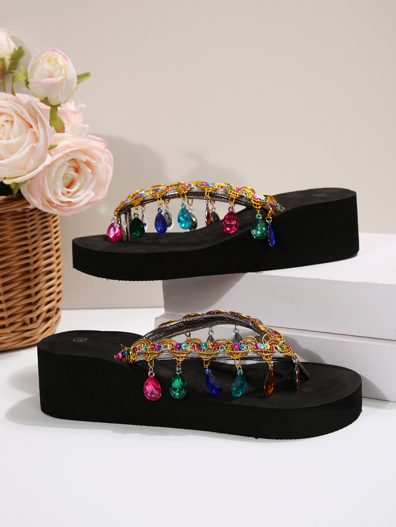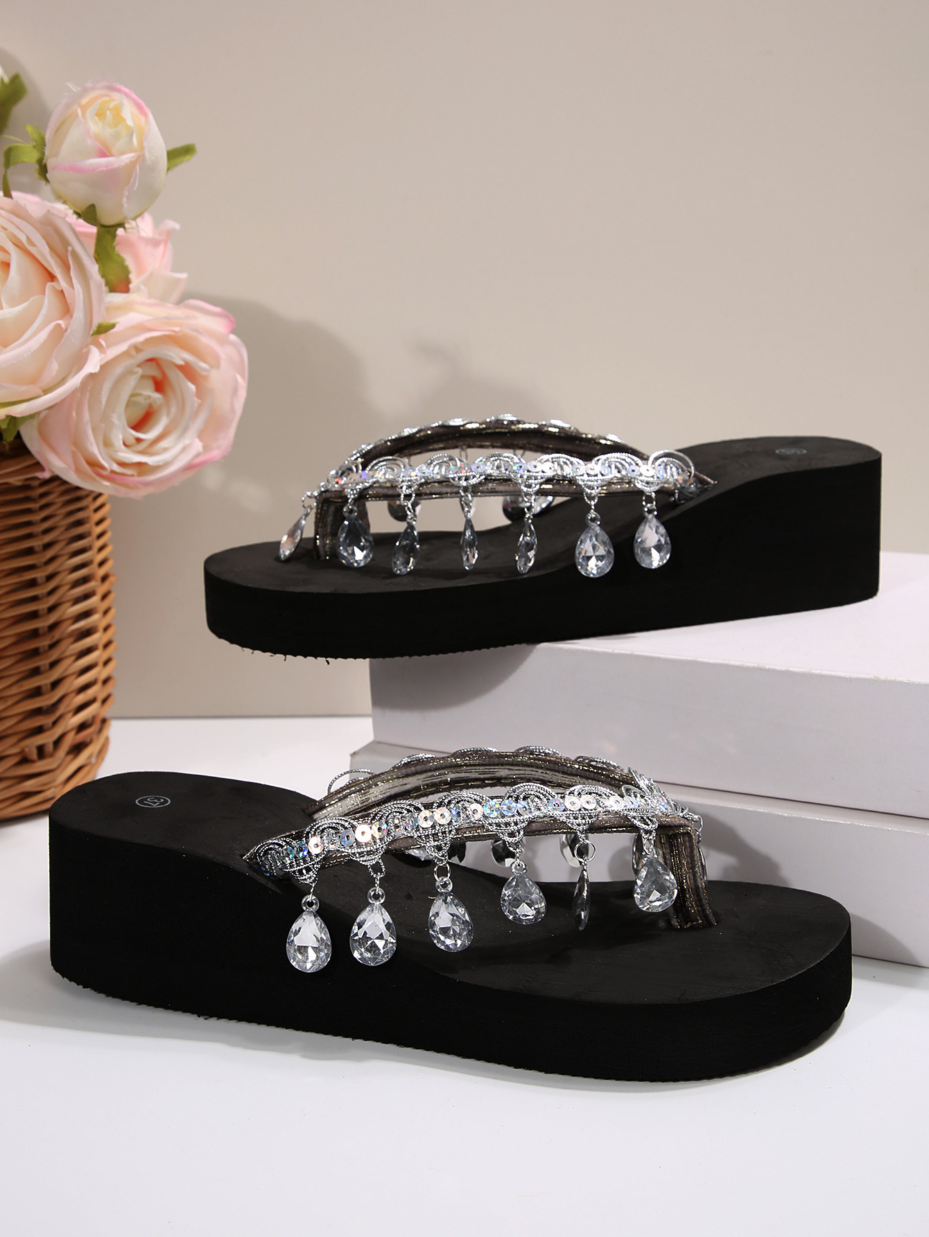 대외 무역 2025 새로운 여름 스타일 플립 플롭 웨지 힐 라인스톤 스팽글 짠 플립 플롭 여성용 도매스토어 가기