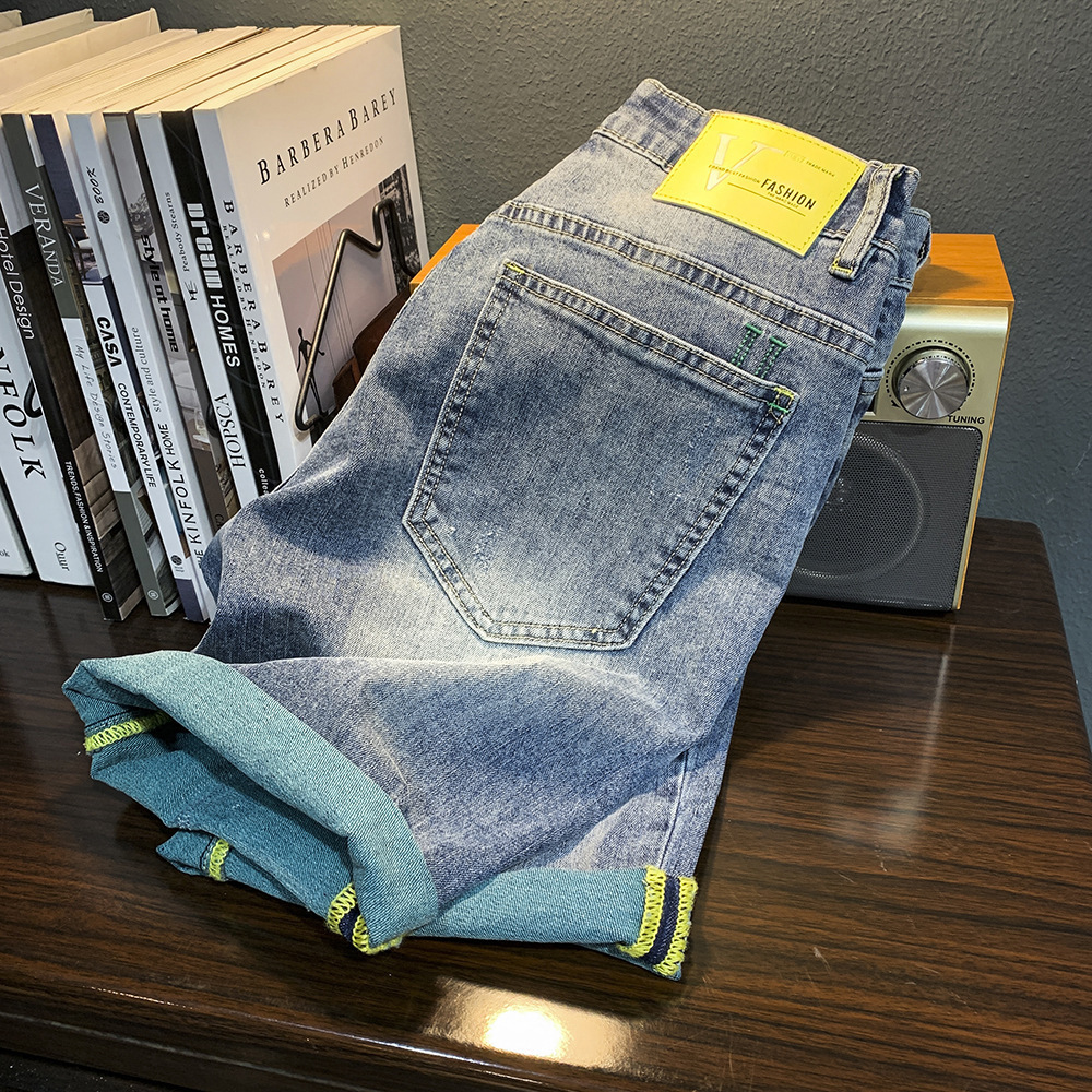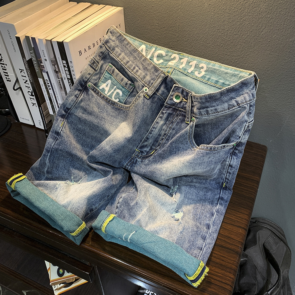 여름 얇은 데님 반바지 남성용 미국 트렌디 브랜드 스크래치 5부 바지 통기성 디자인 캐주얼 5부 바지