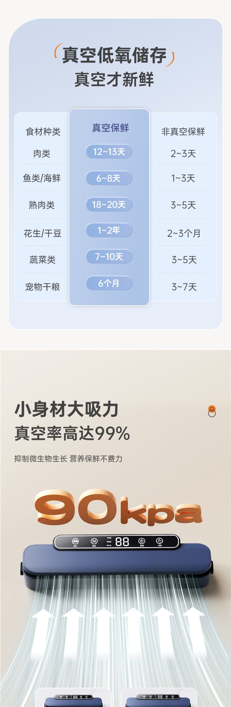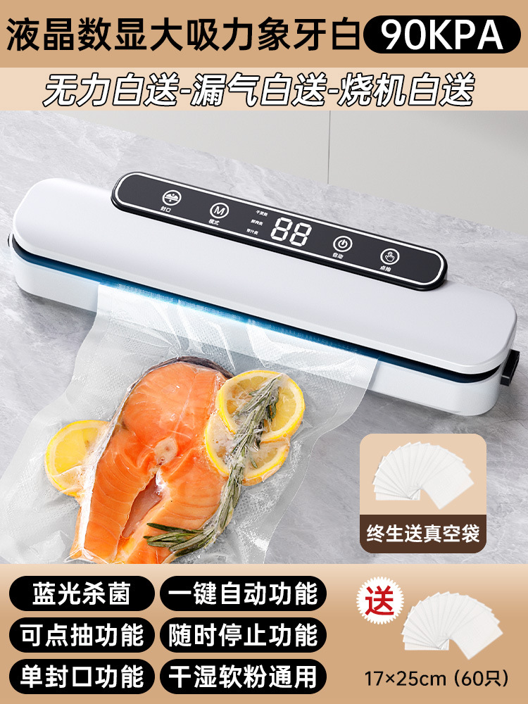 • "패셔너블한 화이트 + 대형 진공백 120개 ""5가지 기능 √ LCD 디지털 디스플레이 √ 90kpa 대용량 흡입력"