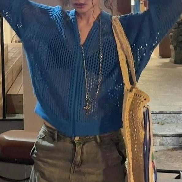 여성을위한 미국 복고풍 줄무늬 중공 니트 카디건 2025 여름 새로운 캐주얼 루즈 지퍼 디자인 재킷 유행스토어 가기